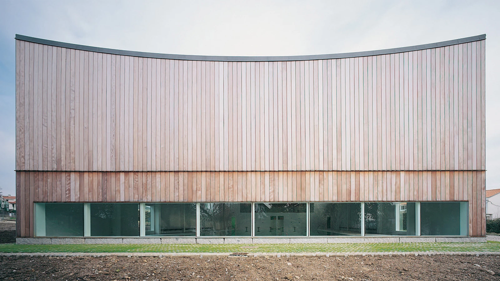 One same structural frame – formed by concrete pillars and a curved beam of laminated wood – geometrically supports the variable section of the zinc roof, whose water-channelling function is pointed up by a large exterior drainpipe on one of the corners of the building. Set off against the cold appearance of the roof sheeting, a vertical iroko wood siding enwraps the building, transforming the volume into a sort of ark abandoned among the hills of Galicia. As in the electrical wiring posts that can still be seen in this area’s countryside, a grey patina will gradually take over the wooden enclosure, favoring the gradual merging of the building into its surroundings. Like a carpet of stone pavers among which grass grows, the external work is found the only specific element of each plot, that which will allow to adapt this abstract protoype to the landscape and urban features of each site.