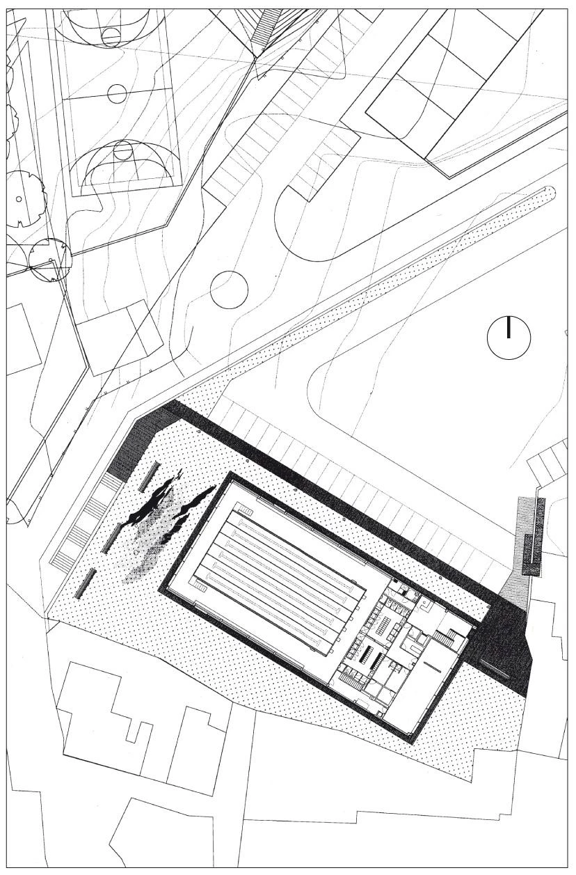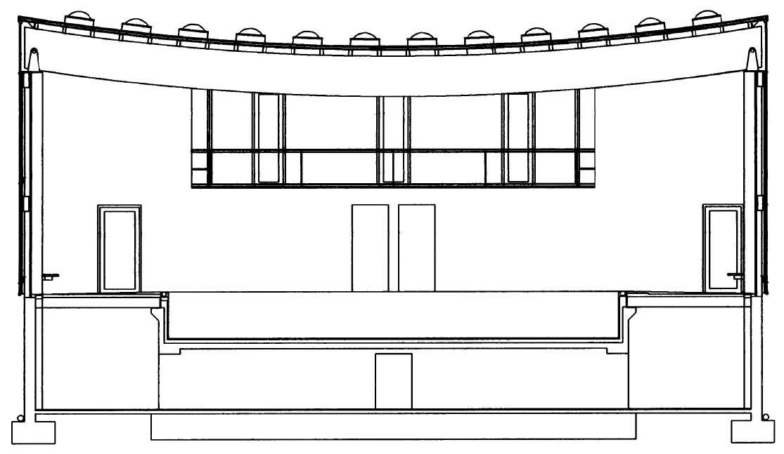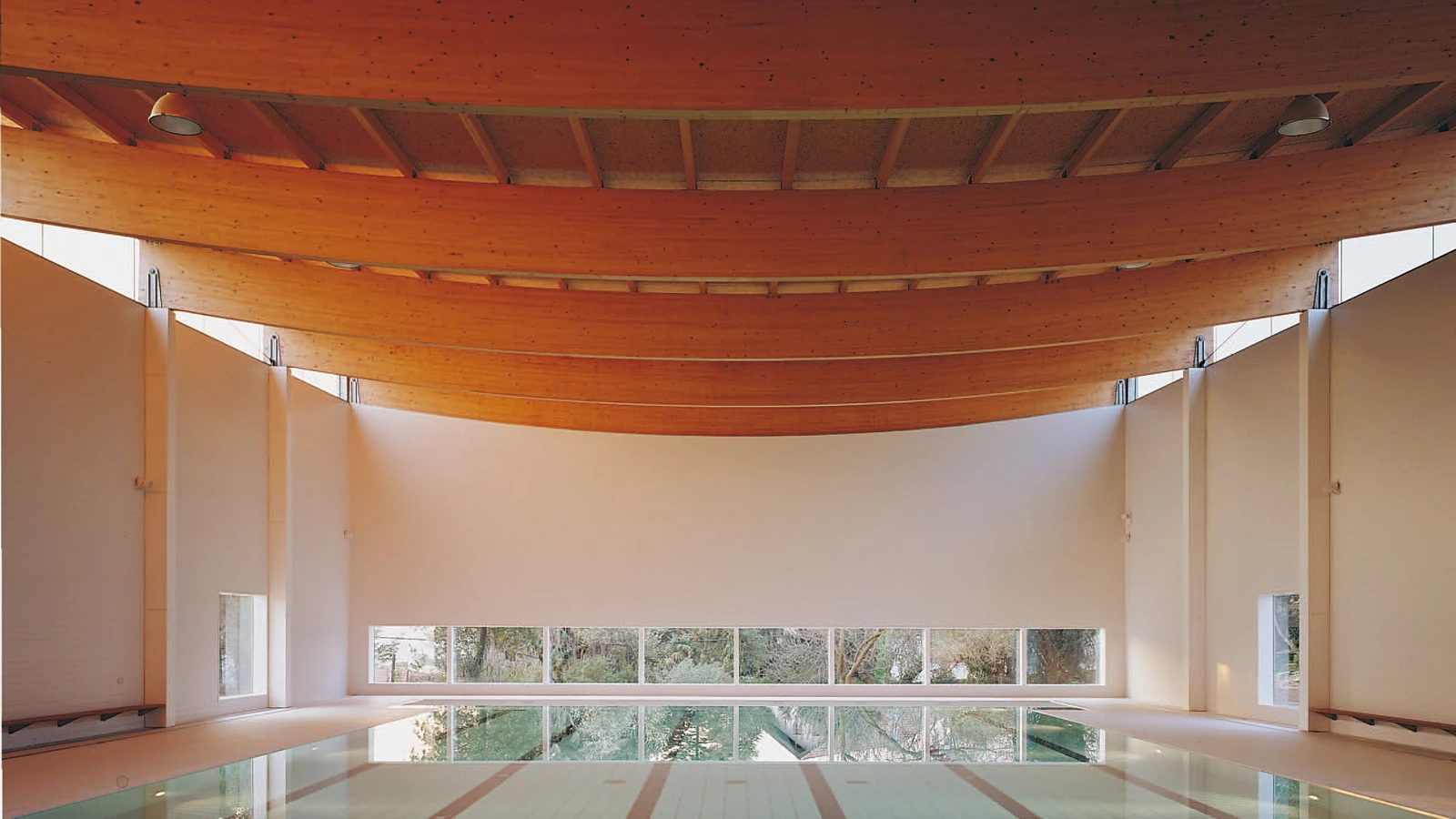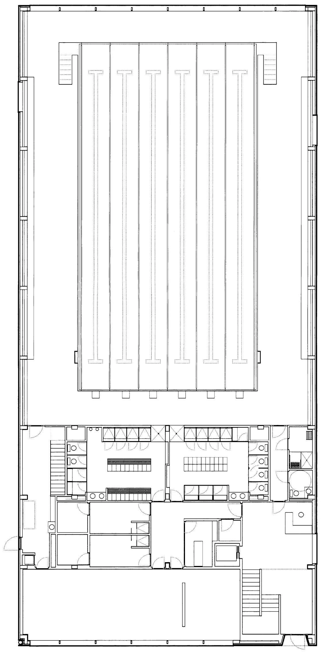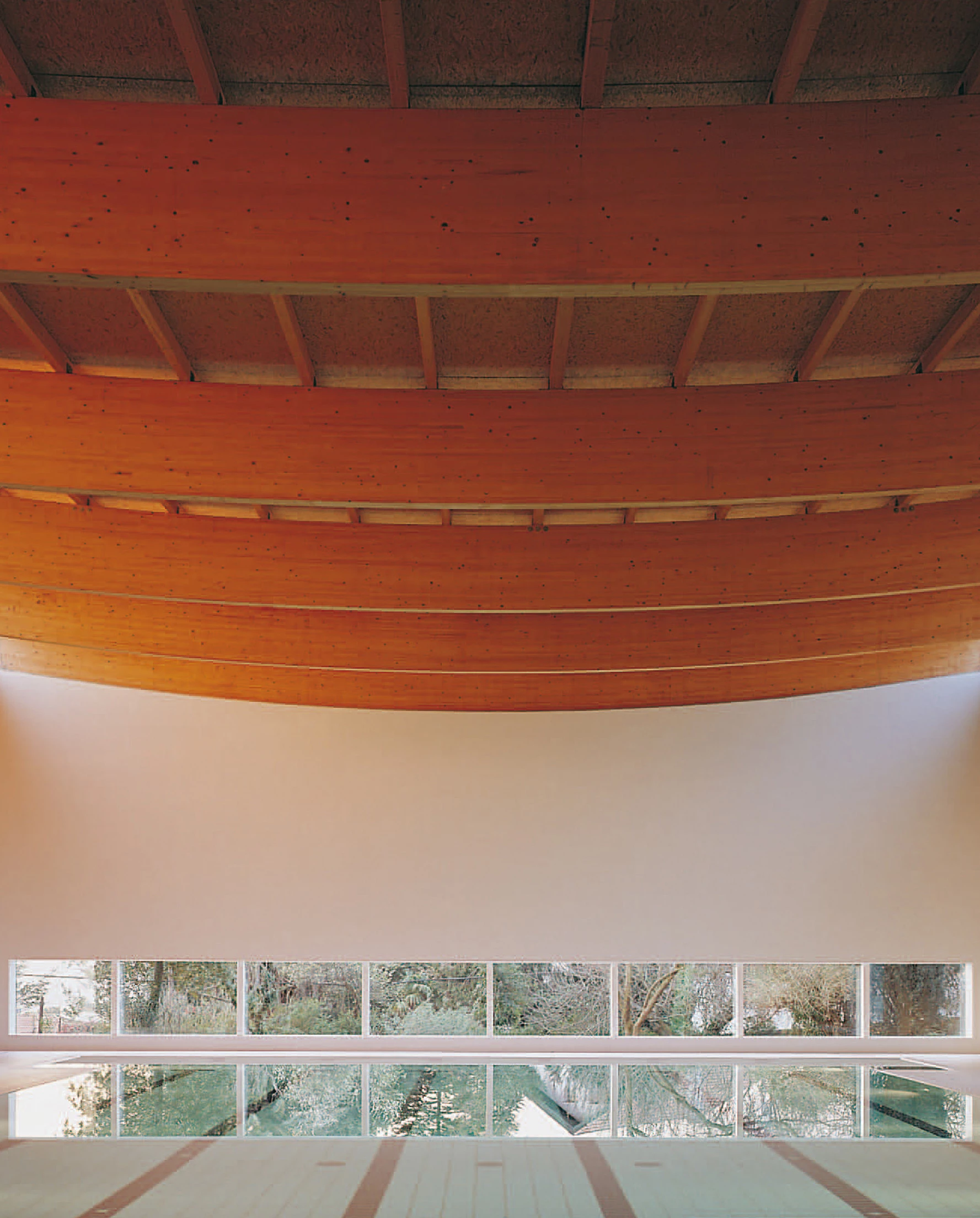 Grouped in a single building, two double height volumes respectively house the gym and pool. Between these two voids, the box enclosing the kitchen, the cafeteria and the restaurant is inserted as a bridge which opens on both sides to these two dominant spaces by way of two openings that follow the shape of the section. The dressing rooms, sauna and first-aid room are located below this gastronomy area on the first floor. The project’s second group of unvarying elements is constituted by two large openings in the lower part of the side facades which open views onto the landscape from the gym and pool. In the same way, other horizontal windows in the upper part illuminate the ceiling, underscoring the autonomy of of the roof with respect to the rest of the building.