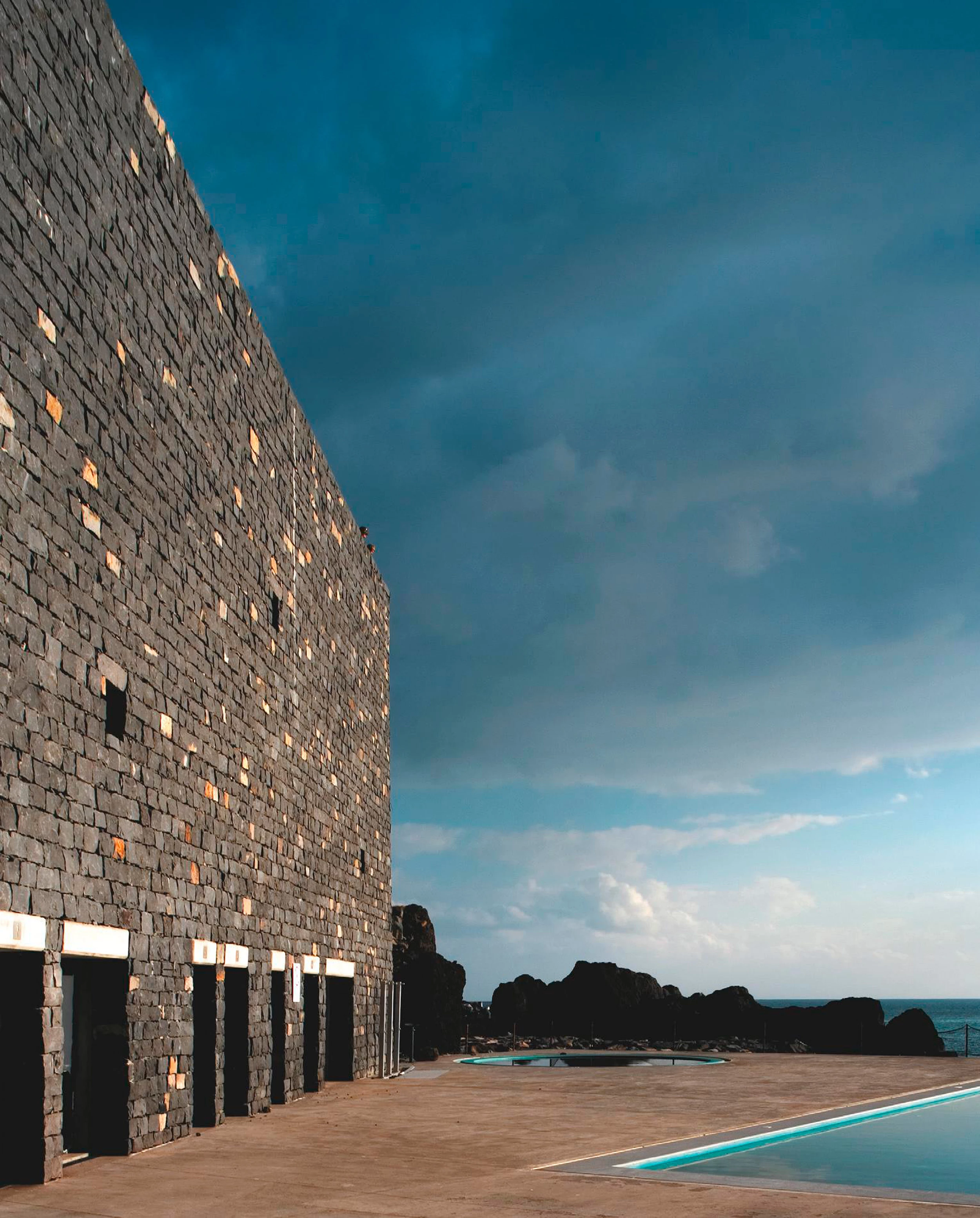El proyecto, que sufrió varias modificaciones durante el proceso de construcción para adaptarse tanto a las dificultades geológicas como a las necesidades de la población, establece un gran muro de bloques de basalto negro que soporta las rocas del acantilado para prevenir deslizamientos, define un frente marítimo en la línea de costa y, finalmente, contextualiza el proyecto gracias al uso de piedra local para su levantamiento. El muro articula los diferentes espacios del programa al incorporarlos en un recorrido ascendente que une el extremo de las piscinas con el paseo marítimo y el circuito de senderos sobre el Atlántico conocido como Caminho da Trincheira. En el nivel más bajo, una gran plataforma de hormigón que se extiende hacia el mar sirve como solárium y contiene las piscinas. Este plano, que en su extremo se introduce en el agua mediante una escalinata, opone la artificialidad de su geometría sencilla a los macizos irregulares de roca que afloran en su perímetro y se relaciona directamente con la horizontalidad del océano. La misma estrategia se repite en un plano superior donde se apoya la cafetería. Tanto los vestuarios, los aseos y cuartos de servicio como los espacios de comunicación entre las piscinas y la cafetería están alojados en las paredes de roca y se iluminan por aberturas practicadas en el muro. Un ascensor conecta estos niveles inferiores con la calle superior y la plaza sobre el aparcamiento. La torre de hormigón en la que se aloja emerge tras la muralla configurando un potente hito en el paisaje e interrumpiendo junto al cuerpo del restaurante la horizontalidad de la cinta de piedra.