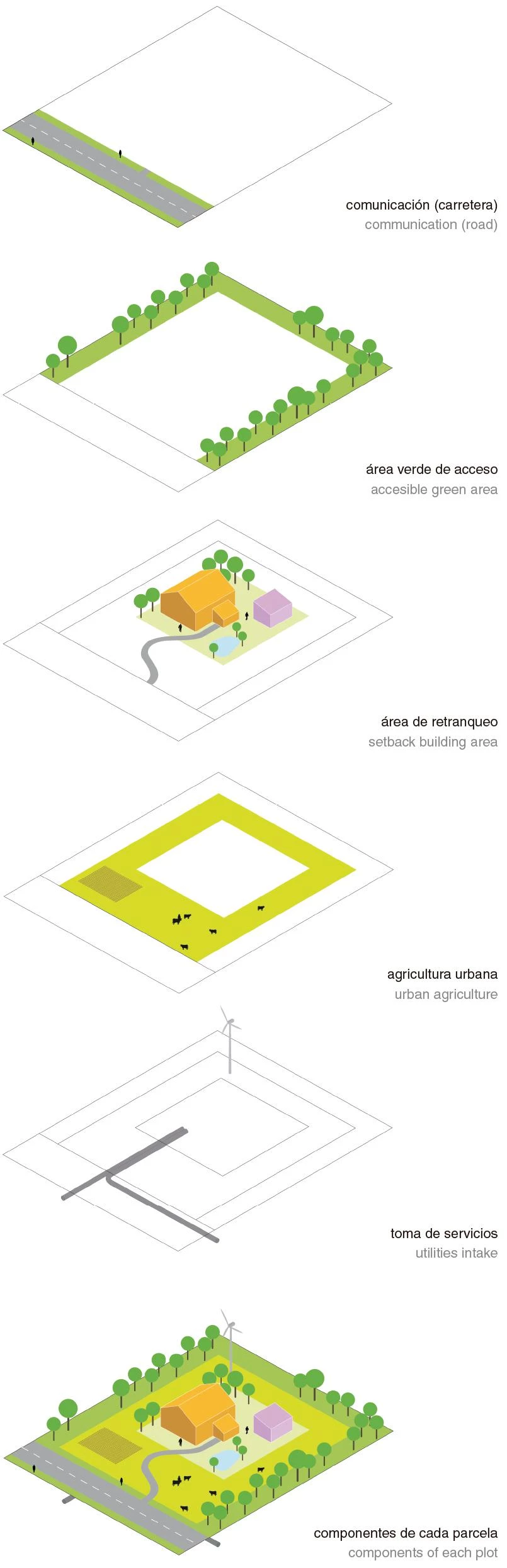 Each initiator will build whatever they want and however they want, but following a series of principles that will mark the guidelines for urban development. All the plots will include a piece of public road, green space, water buffer, and space for urban agriculture. An accessible ‘path’ around each plot and a setback from the roads will guarantee a permeable and continuous green landscape. Communal services will be developed only when they are needed in a collective and participatory way. To contribute to the city’s sustainability goals, 50% of the area will be destined for urban agriculture, reducing the distance between production and consumption. The result is an urban planning that evolves organically over a long period of time.