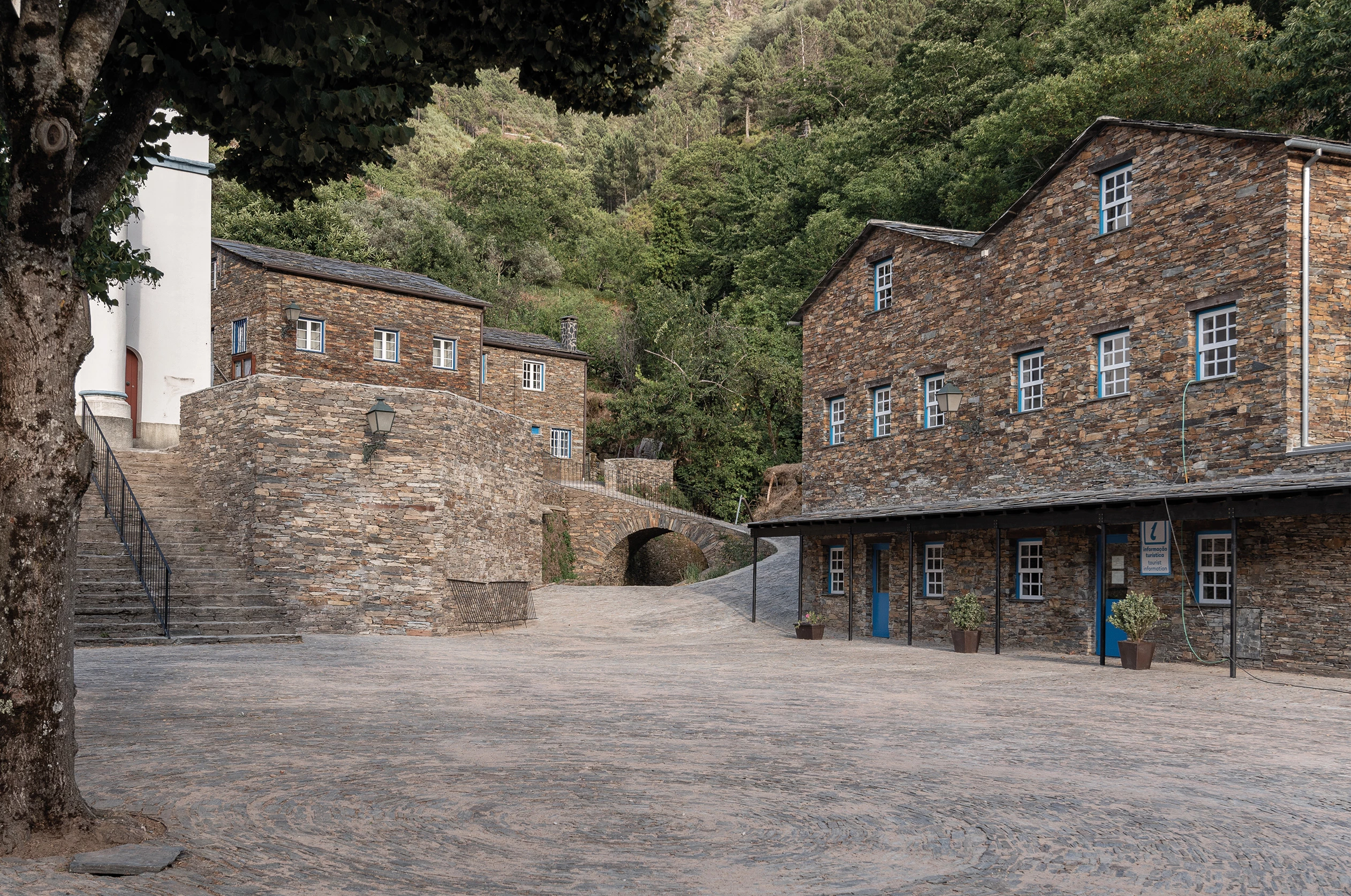 The Coimbra practice of João Branco and Paula del Rio was commissioned to reconfigure the tourist office and Praça Cónego Manuel Fernandes Nogueira, the only flat open space in Piódão, creating a unified image of them. The schist houses of this village in the Açor mountain range are spread out between steep narrow streets on a northwest-facing escarpment.