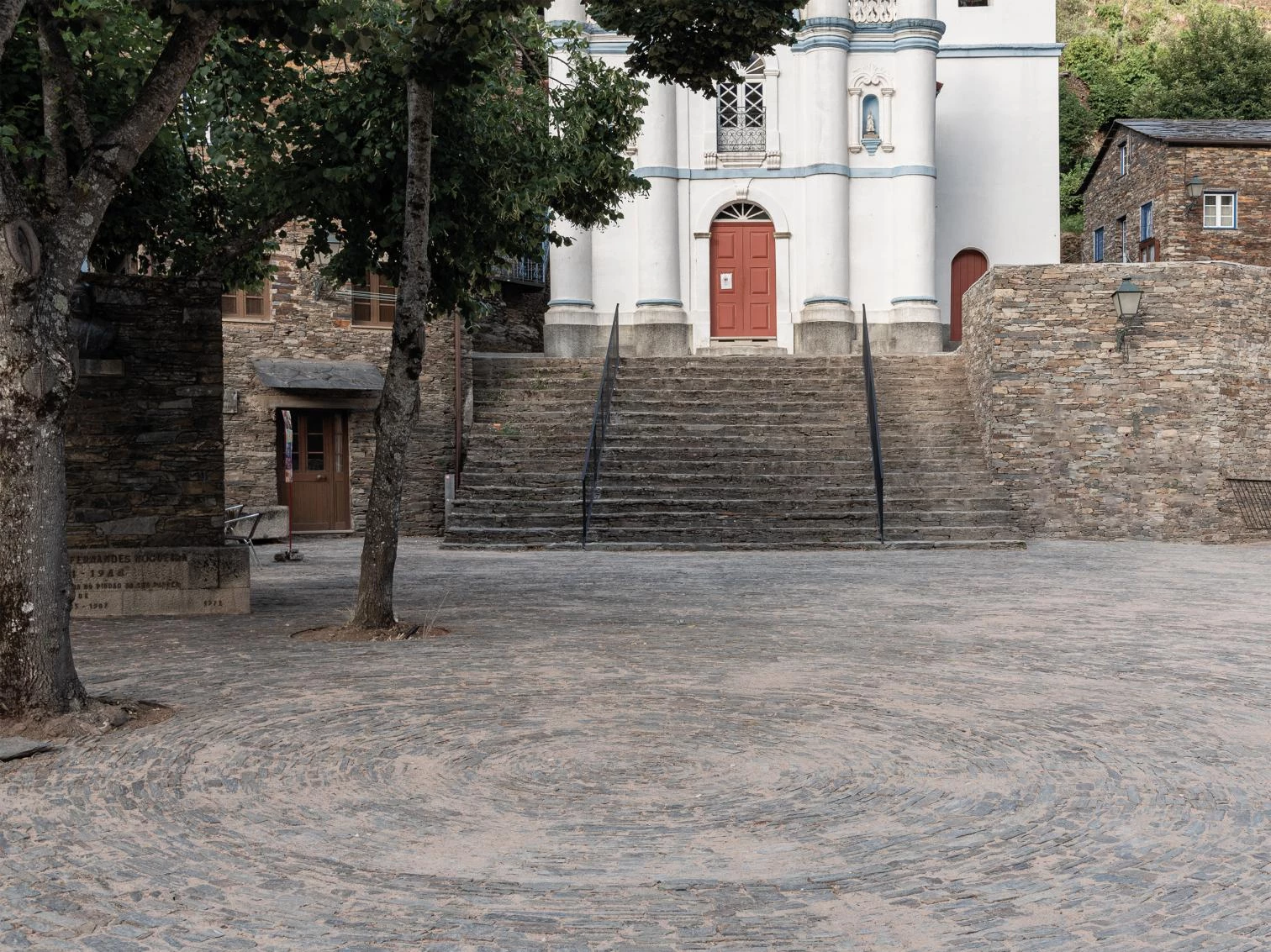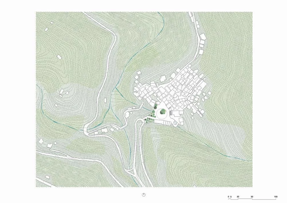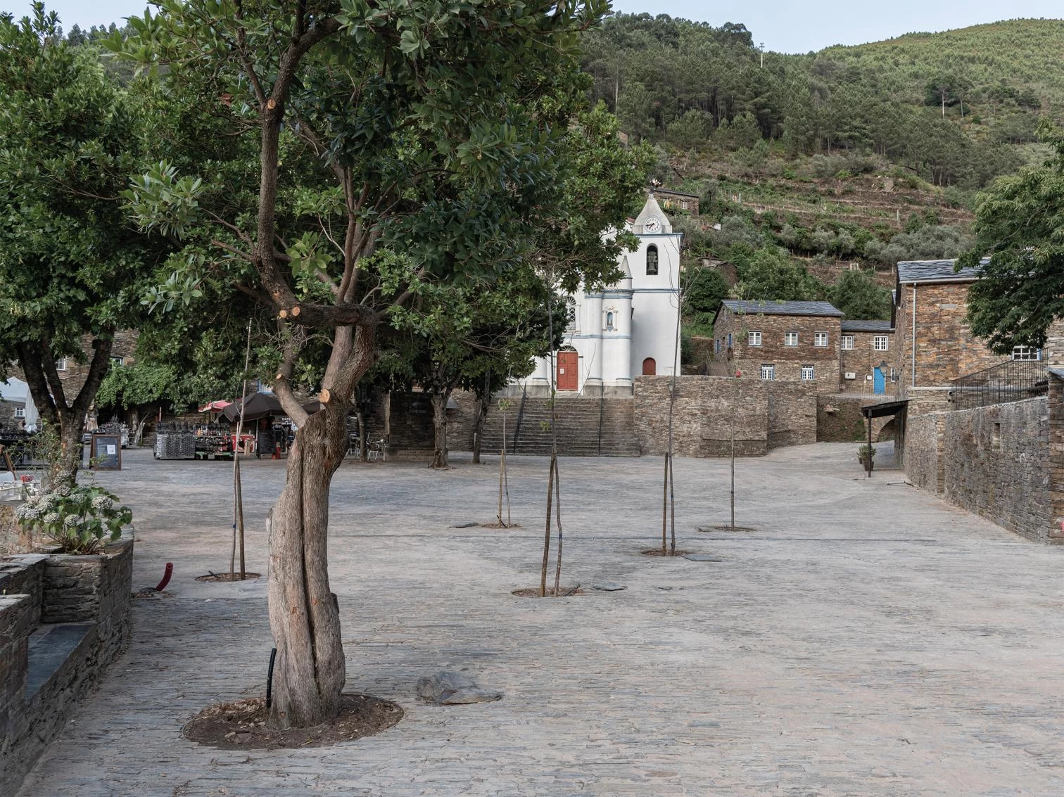 Redefining boundaries, the silent intervention makes it difficult to distinguish between new and old on this square of the lower part of Piódão – previously occupied by cars – which serves as the main entrance into the village. The project has reclaimed the space for pedestrians as a place for them to gather and socialize in. A grid of native cherry trees at the entrance alters the arrival sequence. This botanical filter protects the square by separating it from the roadway, keeping cars out. On the other hand, the new paving was executed with pieces of shale and with no slopes and curves, using local techniques and materials. The formal complexity of the space, lacking directionality, was tackled by introducing a large central circle along the church’s axis.