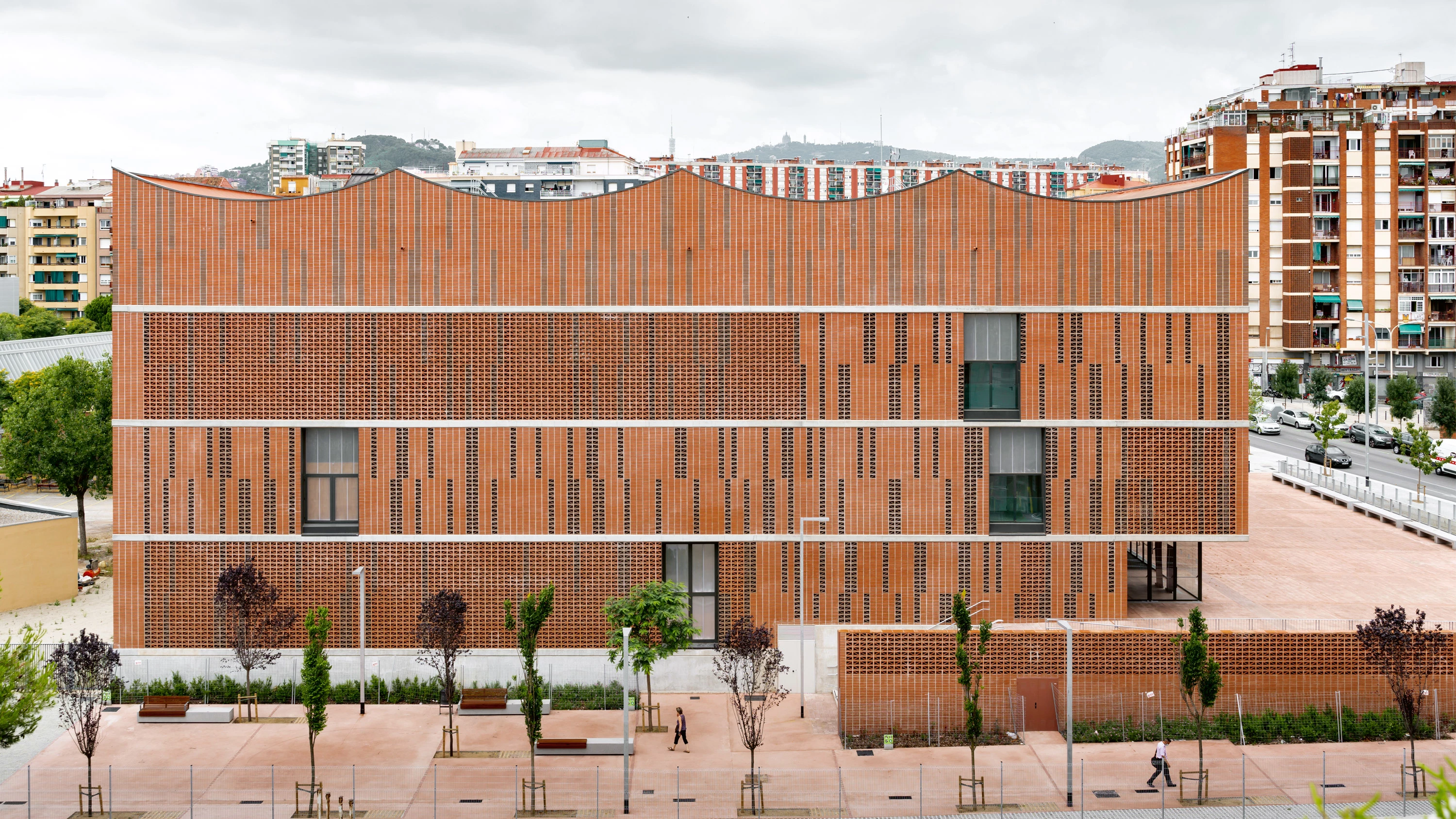 With a prominent presence of ceramic, the construction system chosen deliberately revisits and recovers the old factories, warehouses, sheds, and workshops so common in the carea. The construction and material quality of the building constitute its formal expression and its final finishing, without added elements. The ceramic materials are prominent. The brickwork facades, of low maintenance, alternate solids and voids, opaque, translucid or transparent pieces, ceramic parts of different size and color, with the objective of making the building lighter while adding texture, grain, a vibrant pixellation of the built volume, adapting at the same time to the different orientations. The building’s design thus combines lattices in exposed facades protecting the tracks from sunlight and from glare and also large glass surfaces in the lower level of the north facade opening up to the plaza of access.