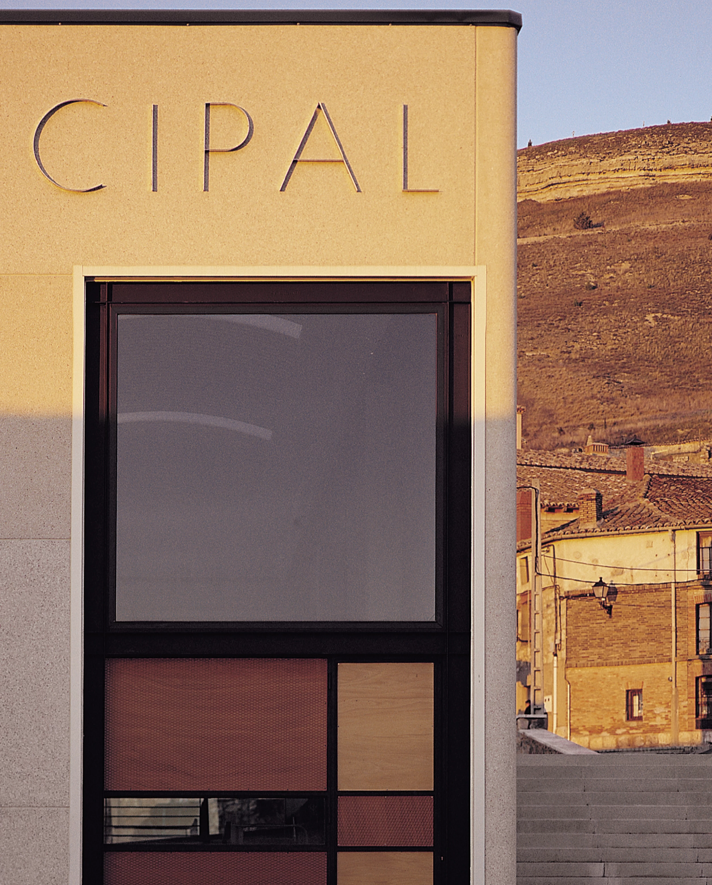 En lugar de recurrir a la tantas veces traída idea de nave, este polideportivo deja de lado el lenguaje industrial para convertirse en un objeto más urbano, próximo a las trazas de un centro cívico. Situado en una localización sin referentes urbanos significativos y ocupando una parcela próxima al centro de la población, el nuevo volumen se asienta sobre un plano deprimido seis metros respecto a la cota de las vías perimetrales. De este modo, no sobrepasa en ningún momento la altura de las edificaciones colindantes y desde su entorno próximo se consiguen vistas fragmentadas del edificio, limitando su percepción completa a determinados puntos de la carretera comarcal que une Castrojeriz con las localidades de Melgar y Pampliega.