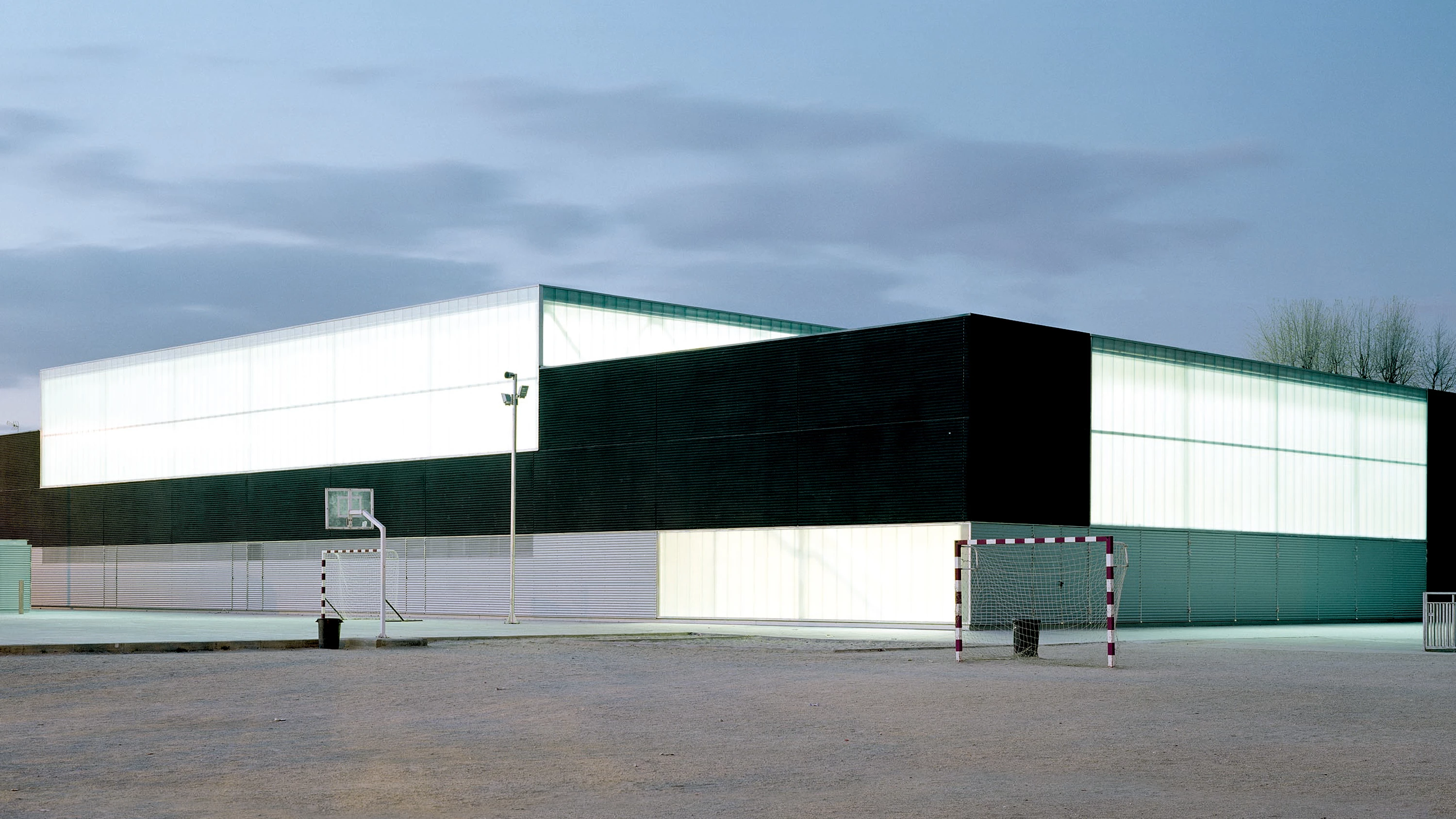 El proyecto para un pabellón deportivo situado en el recinto escolar San Ignacio de Loyola, en Alcalá de Henares debía dar respuesta a tres condicionantes de partida: un programa preciso (pista polideportiva de balonmano y baloncesto, gimnasio y vestuarios compatibles con el uso de las pistas exteriores), un presupuesto muy ajustado (un millón de euros), y un plazo de ejecución reducido (ocho meses para inaugurar el pabellón coincidiendo con el cincuenta aniversario del colegio).