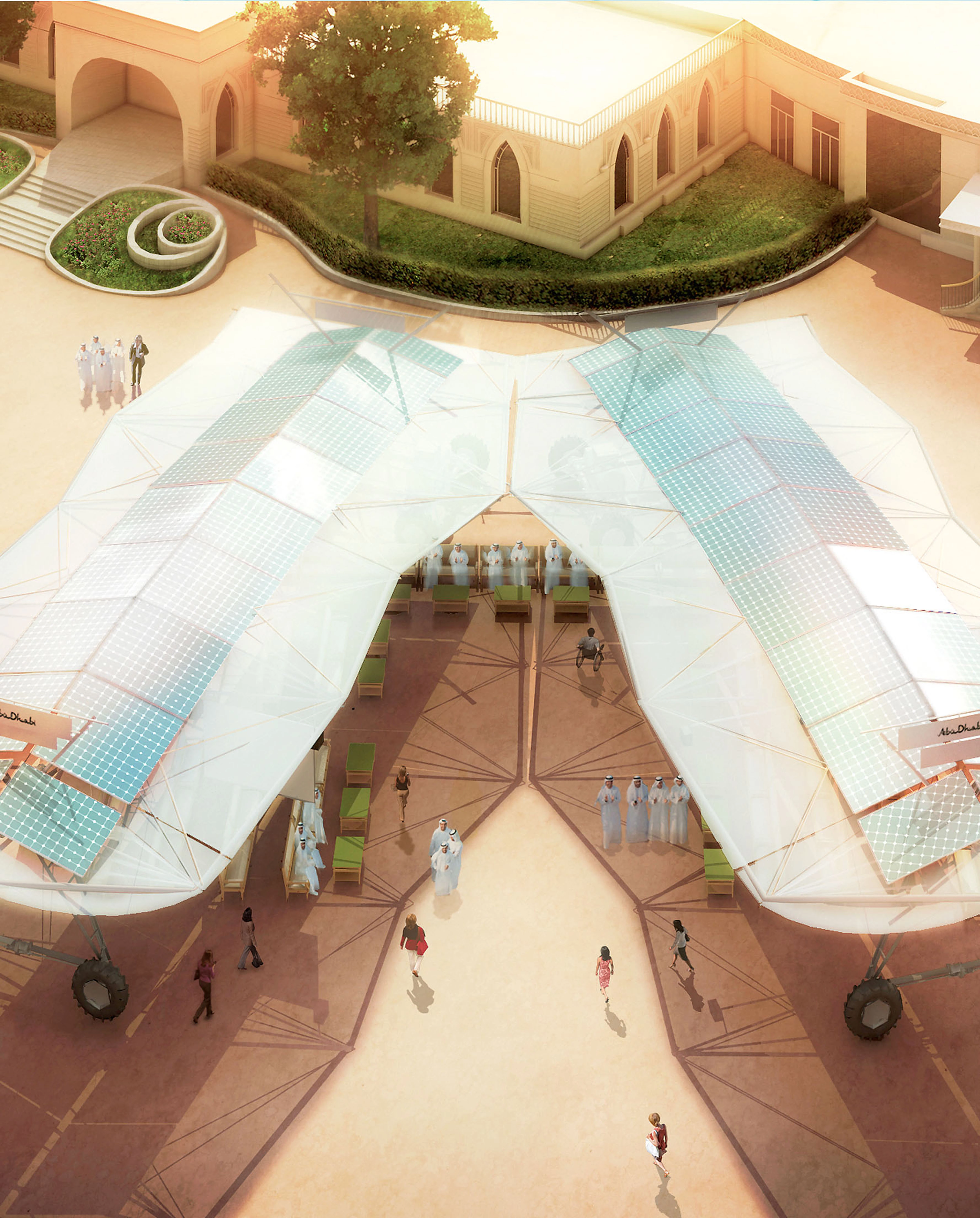 With a structure that spans over 30 meters and made up of photovoltaic panels that feed the systems designed to cool room temperature, the mobile prototype – still in testing phase – favors social interaction in the capital of the Emirates... [+]