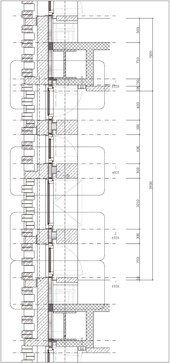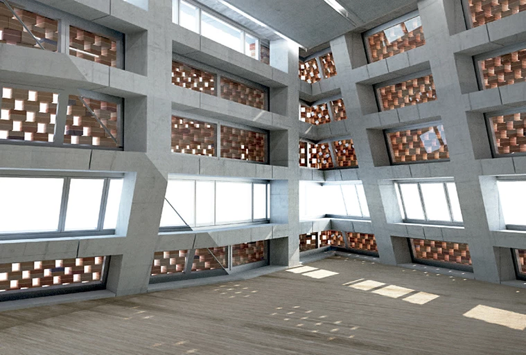 Furthermore, it was important for the new structure to be visible from the north shore of the Thames, so it was designed to be clearly seen behind the iconic chimney of the Tate Modern without competing with it. The integration of the extension with the existing building and with the skyline of the city is, in fact, one of the main goals of the project, as well as favoring the orientation of visitors both outside and inside. At the same time, this desire to blend the new building with its surroundings is expressed on the new facades, which use brick as in the old structure but in a new way, with a perforated brick screen through which light filters in the day and through which the building will glow at night. The brickwork also reacts to the inclined faces by stepping to approximate the pure geometry. With these simple actions, texture and perforation, the brickwork is transformed from a solid and massive material to a veil that covers the concrete skeleton of the new building. This continuous wrap of perforated brickwork is broken through the introduction of horizontal cuts to allow for views, daylight and natural ventilation, making it easier to interpret the internal programming and planning of the building when seen from the city.