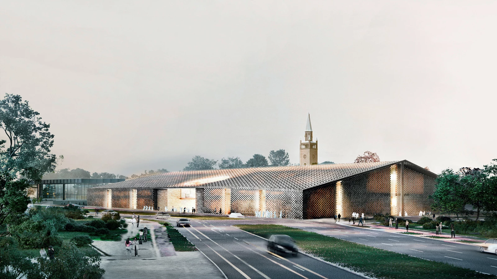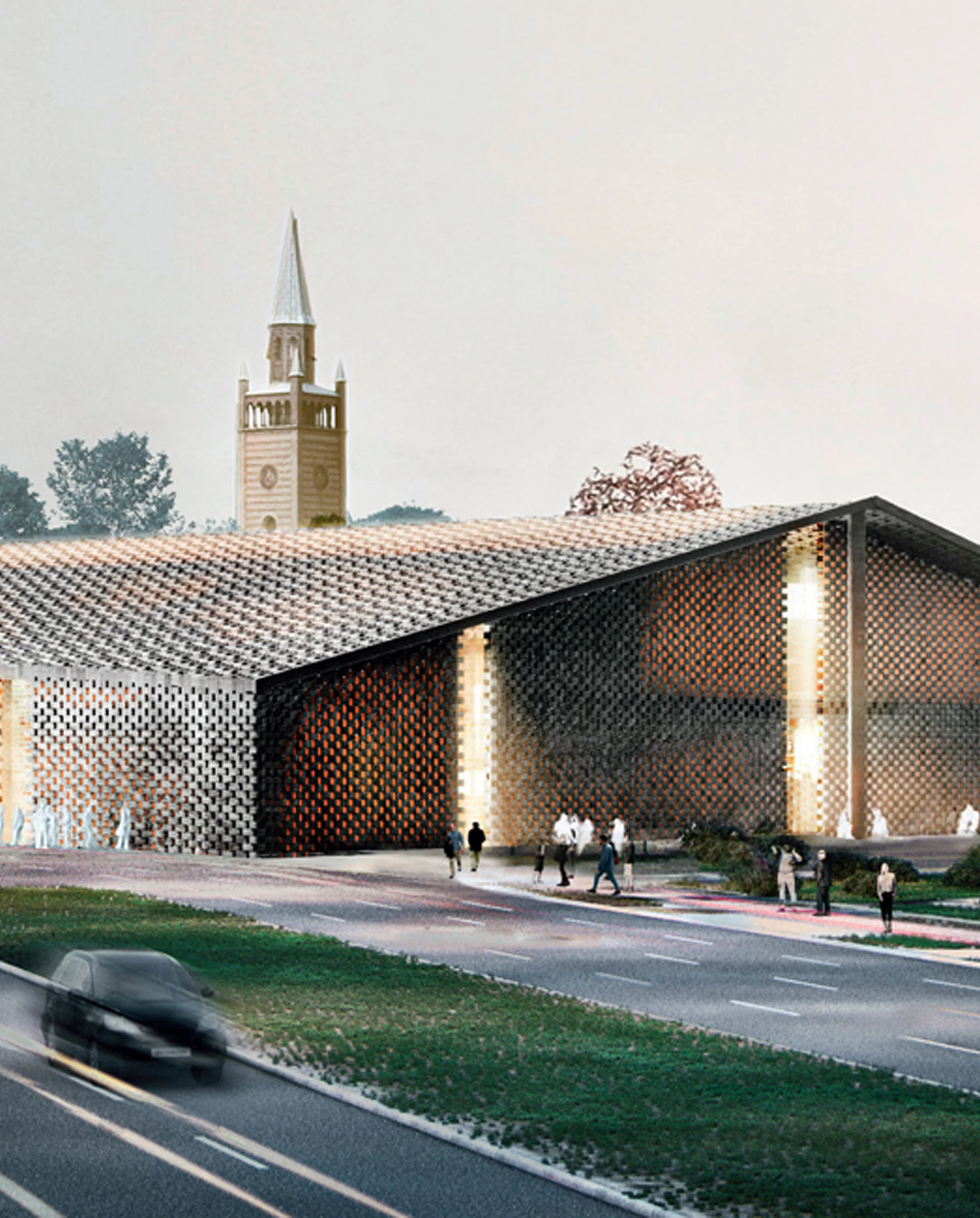Internally, the four quadrants of the Museum are accessed by two intersecting streets. Light penetrates deep into the building through the large gabled roof and the tall central boulevard, which contains workspaces. Thus, it is an atrium in the heart of the Museum, and openings in the exhibition spaces look onto the central court and provide orientation. On the outside, instead of distinguishing the material of the plaza from that of the building, the brick facades of the Museum and the church merge with the pavement of the city.