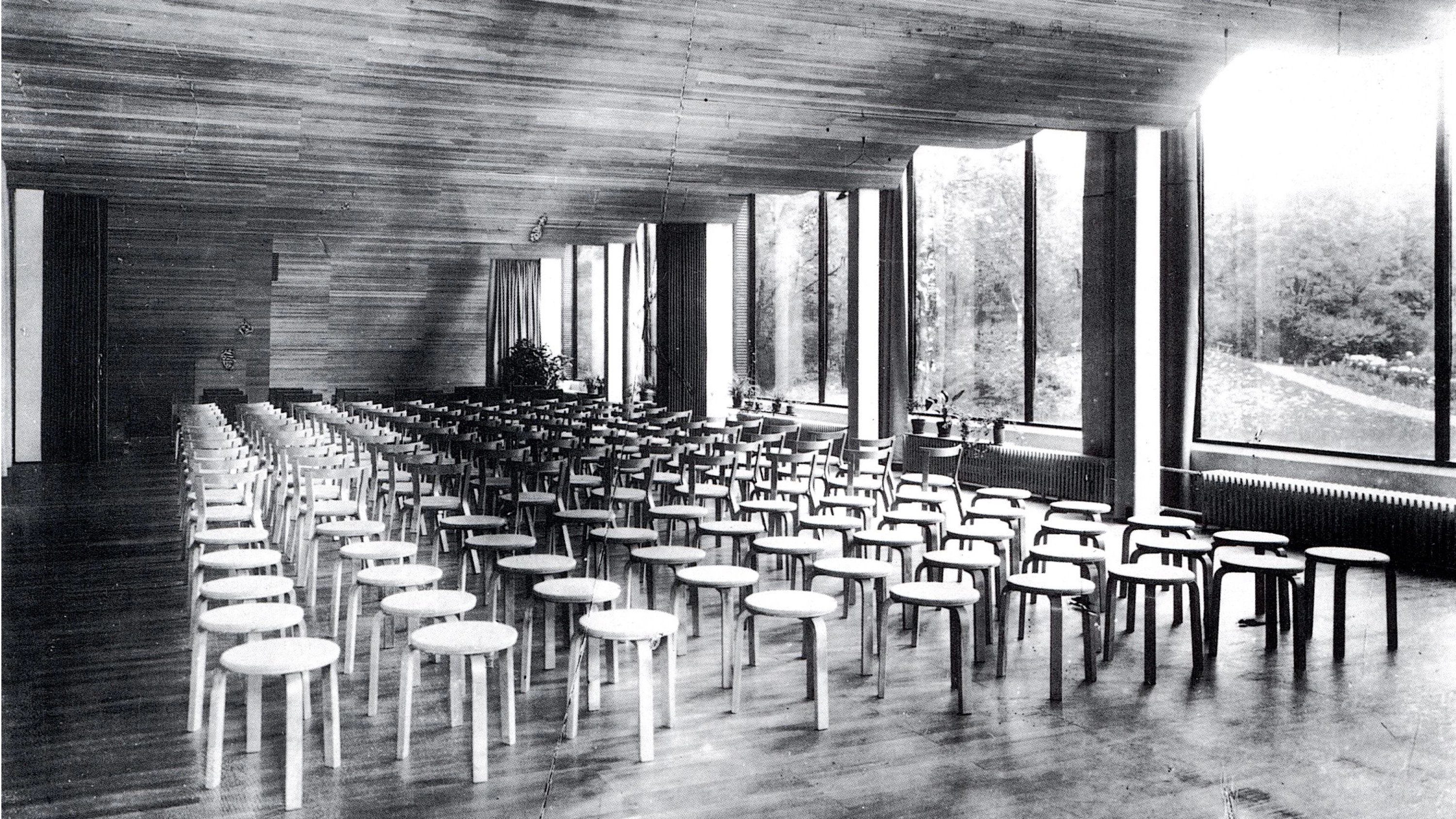 The lending/reading area is one of the most brilliant achievements of this initial Aaltian phase, and the first of a type which the architect would continue to investigate in the course of his career. Inspired by an imaginary landscape of mountains and suns, this space - with its ‘sunken courtyard' for books and ‘watchtower for librarians' - was actually a sophisticated reworking of Asplund’s library. Essential elements are the circular lights arranged regularly on the two ceiling planes, which produce a shadowless illumination for all readers. Another important feature is the undulating acoustic ceiling of the lecture/meeting room. This unique element built with wooden strips was meant to allow a good transmission of sound from all points of the excessively long hall.