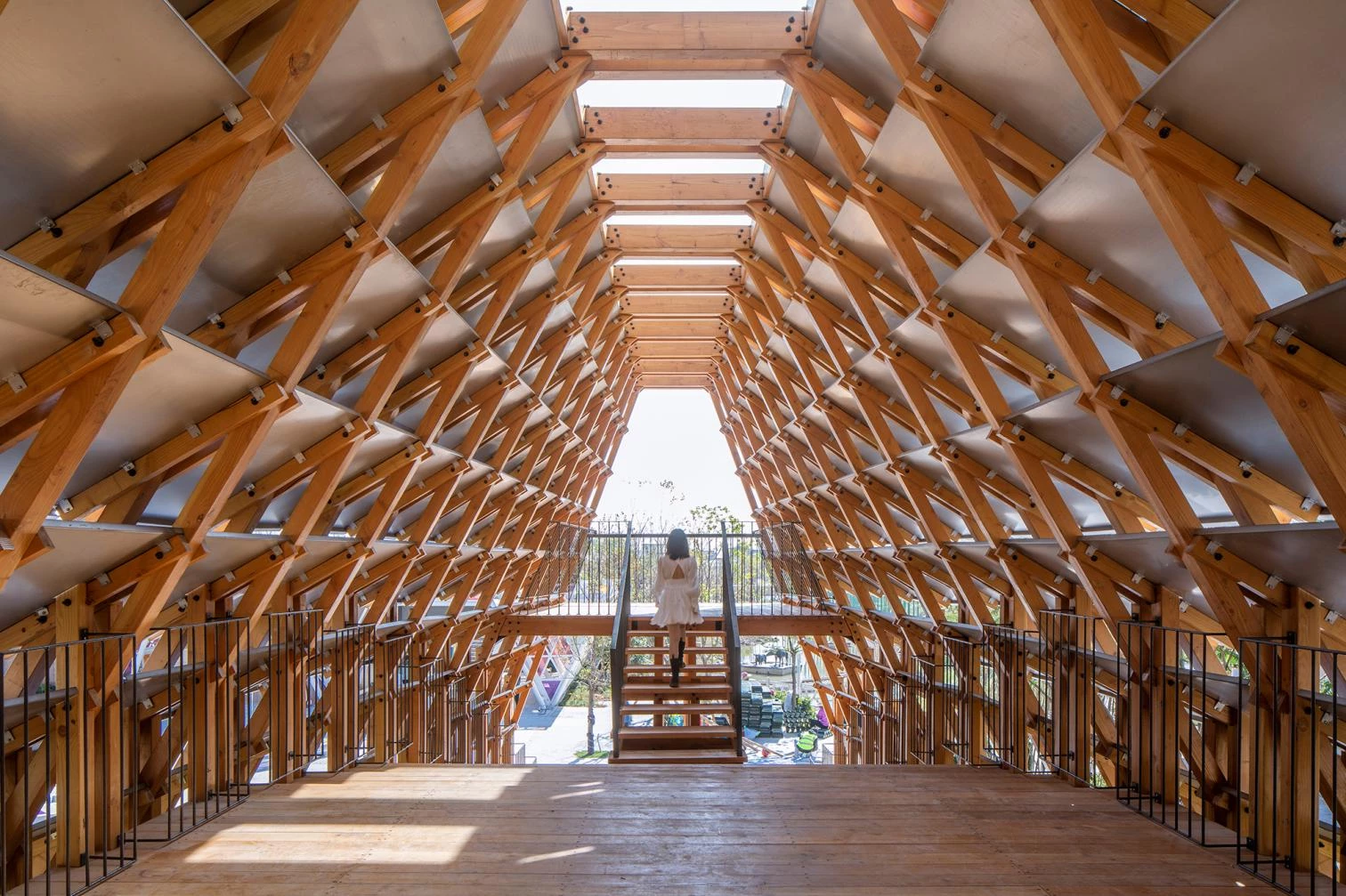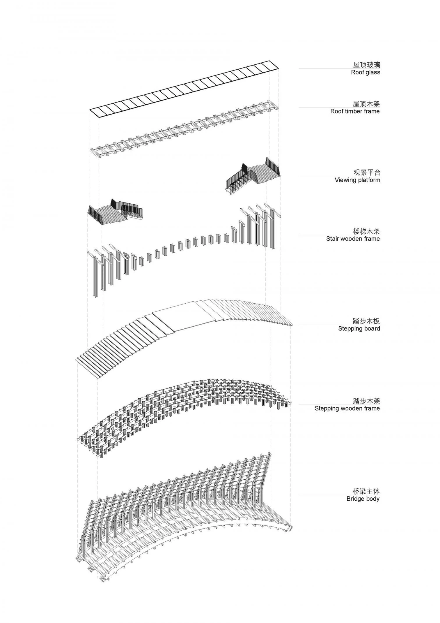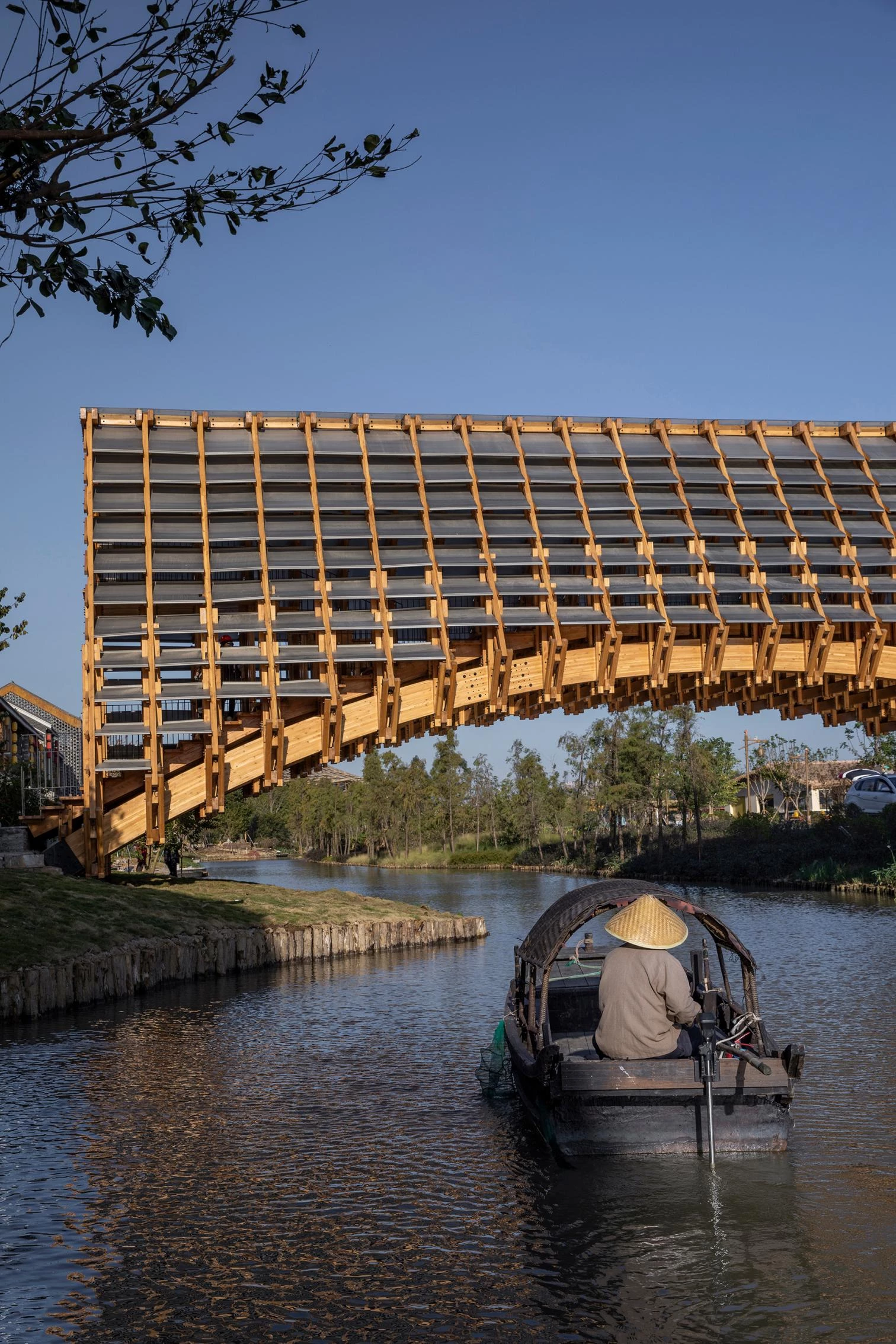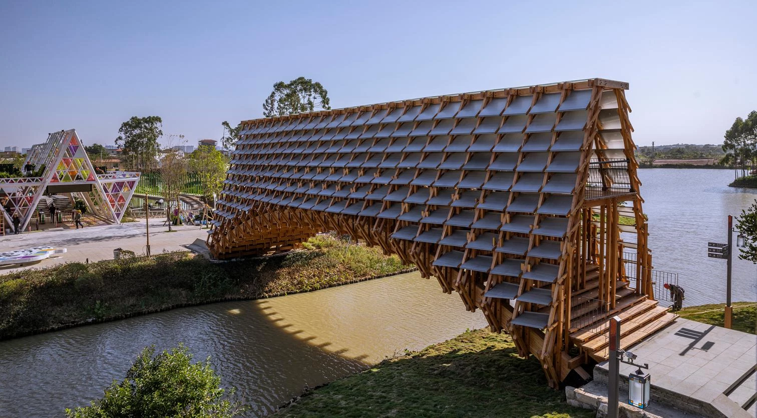 In Jiangmen, a city of Guangdong Province in southern China, the Gulou tourist resort recreates a village splashed with ponds and canals to showcase traditional activities related to fishing and husbandry. The resulting eco-cultural theme park thus features many bridges, among them a covered pedestrian one designed by the Beijing firm of Luo Yujie, which arches to enable boats to pass underneath. To raise the structure, hundreds of pieces of pinewood were screwed together by means of building techniques traditionally used in southern Chinese rural villages. Spanning 25 meters, the footbridge has metal plaques to protect it against rain. Inside, a longitudinal skylight stretches on to the extremes, at each of which there is a viewing point.