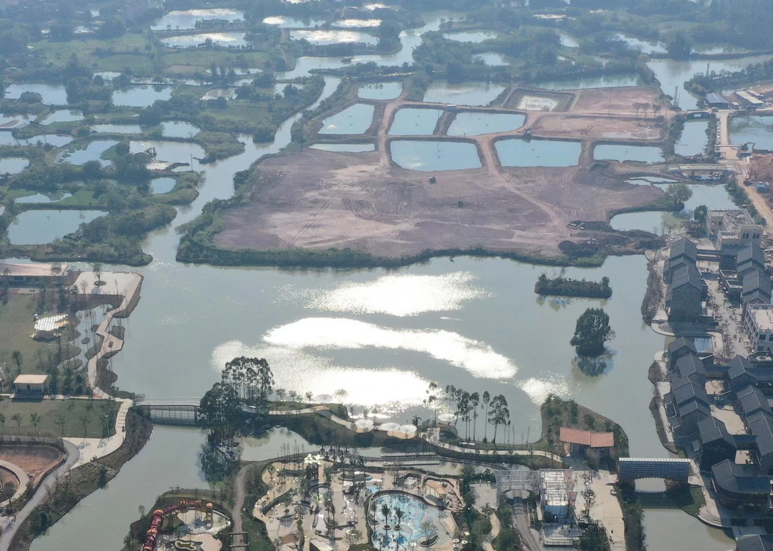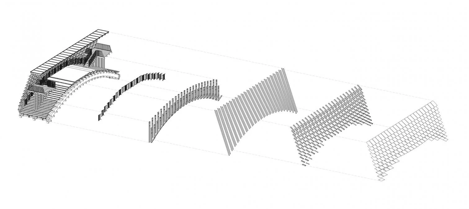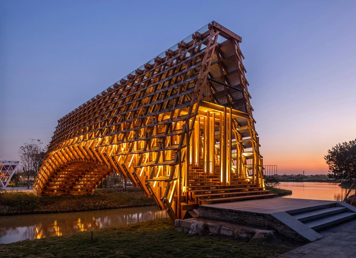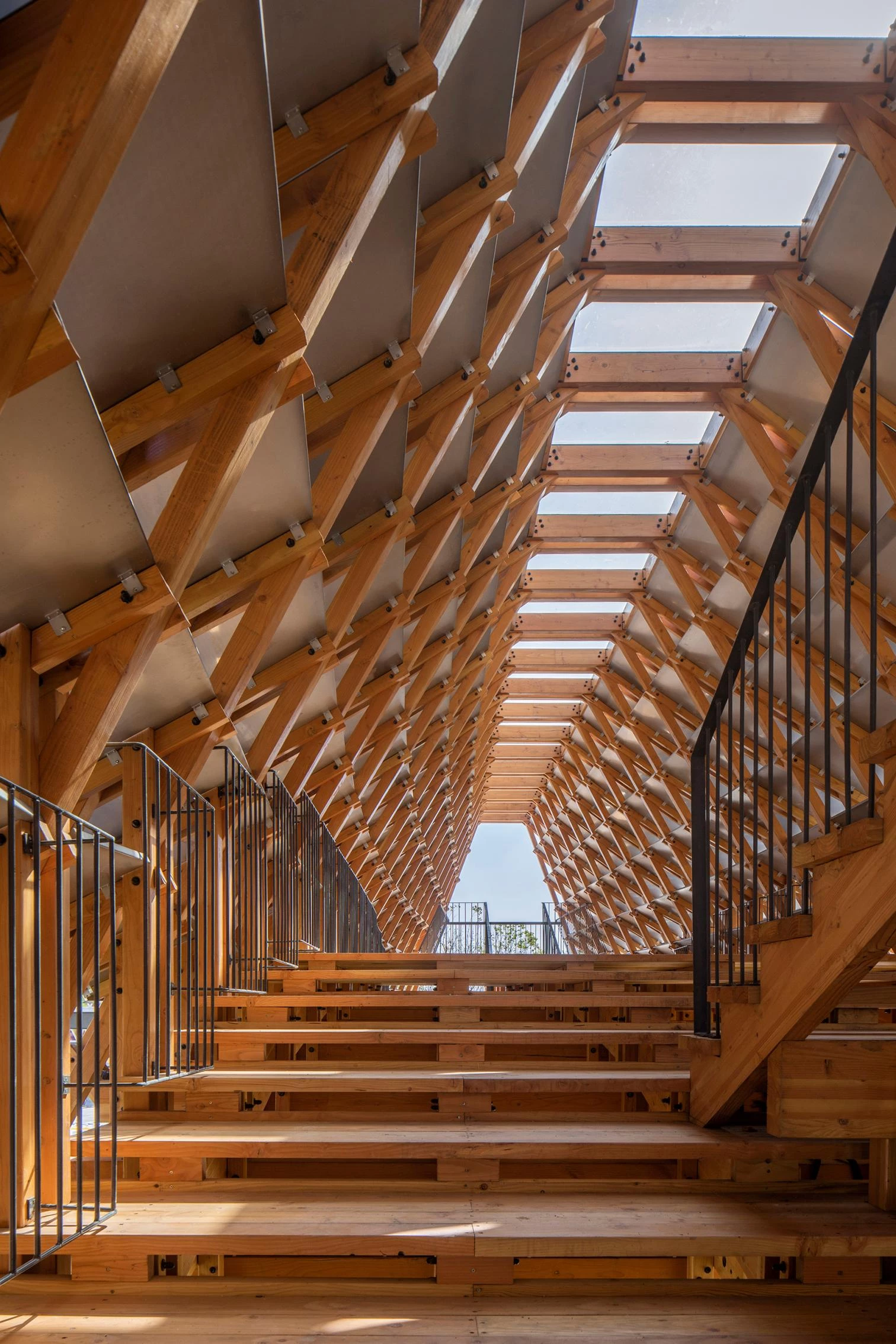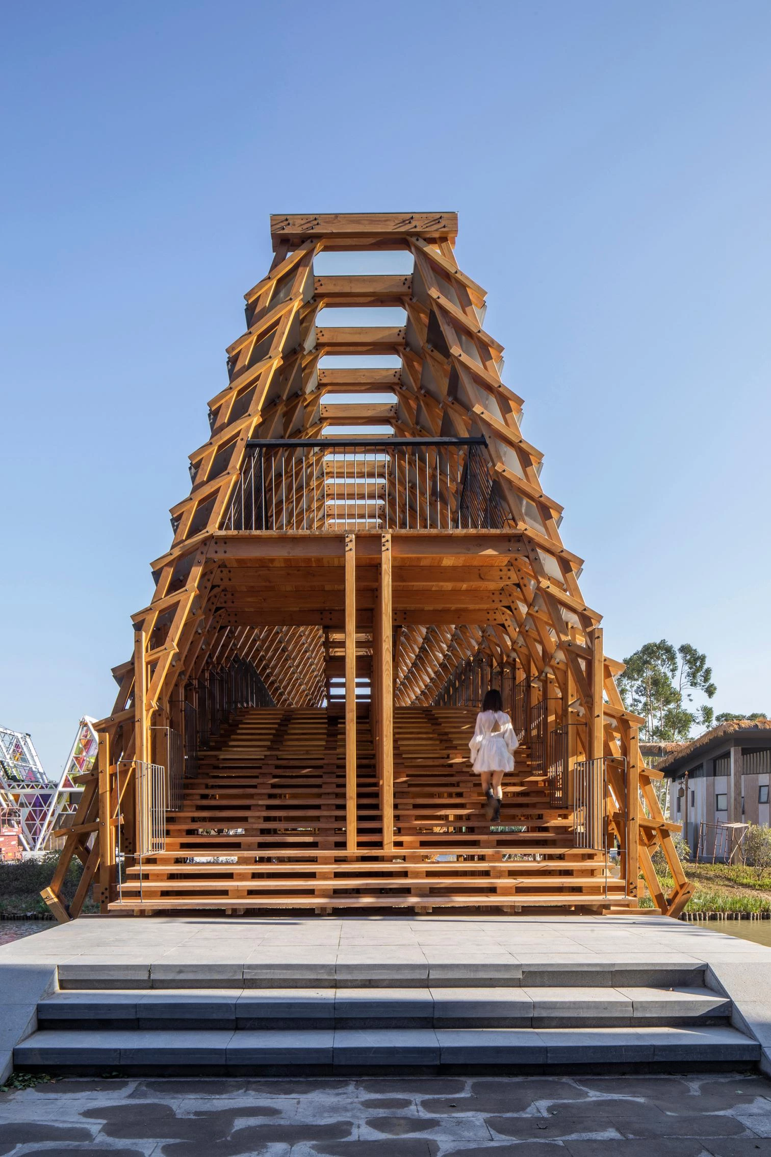 In Jiangmen, a city of Guangdong Province in southern China, the Gulou tourist resort recreates a village splashed with ponds and canals to showcase traditional activities related to fishing and husbandry. The resulting eco-cultural theme park thus features many bridges, among them a covered pedestrian one designed by the Beijing firm of Luo Yujie, which arches to enable boats to pass underneath. To raise the structure, hundreds of pieces of pinewood were screwed together by means of building techniques traditionally used in southern Chinese rural villages. Spanning 25 meters, the footbridge has metal plaques to protect it against rain. Inside, a longitudinal skylight stretches on to the extremes, at each of which there is a viewing point.