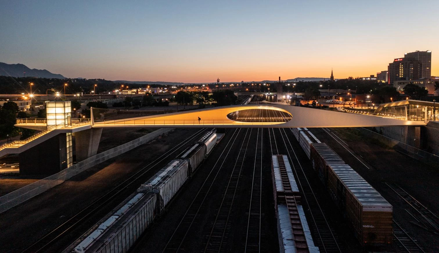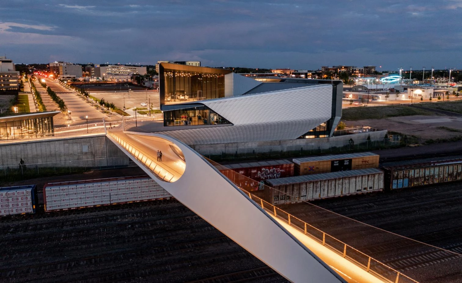 The curving forms stretching from both sides of a railyard in the city of Colorado Springs connect the US Olympic & Paralympic Museum, a work of Diller Scofidio + Renfro that opened in 2020, to America the Beautiful Park. Also designed by DS+R, the 76-meter-long curved steel structure is inspired by the gravity-defying way that athletes move. At its 7-meter widest, an oculus at either side of the bridge frames views of the surroundings. At night, lighting along the bridge gives a sense of speed and movement while providing illumination for pedestrians and cyclists. Combining concrete with structural elements of steel and cables of stainless steel, the 550-ton bridge is composed of prefabricated modules. The sections were assembled on the site in eight hours, in a carefully planned process meant to minimize the downtime of the train tracks.