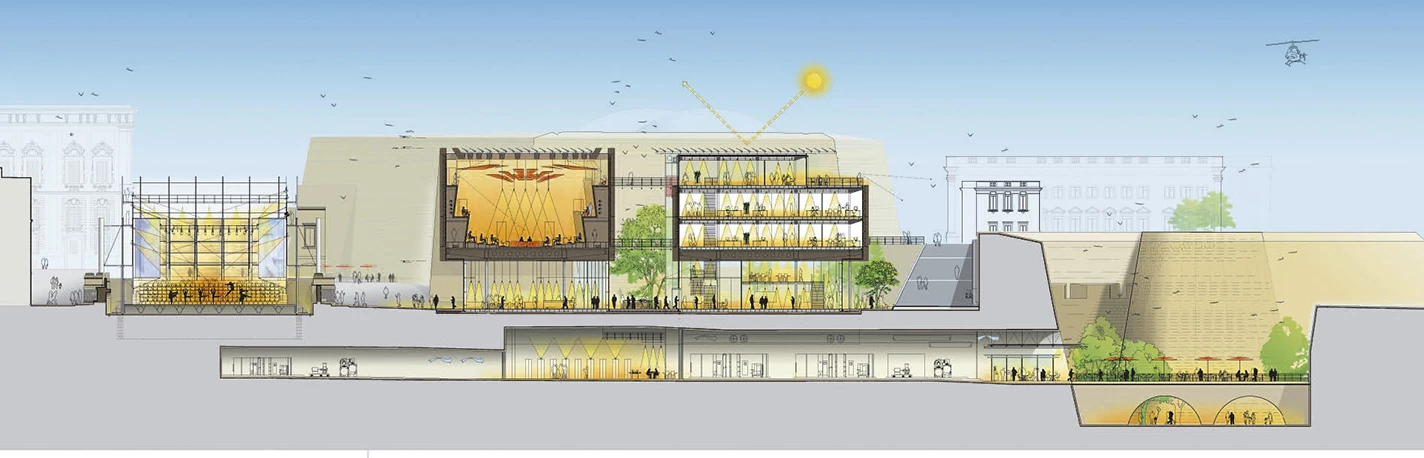 The City Gate project is a complex operation to reconfigure the entrance to the city of Valletta. The project has four parts: the transformation of the Valletta City Gate and the square immediately outside the ramparts, the design of a new theater ‘machine’ to be used for open-air productions in the ruins of the old opera house (destroyed and never rebuilt), the construction of a new Parliament building, and the re-landscaping of the moat.