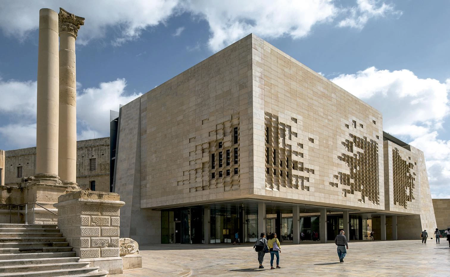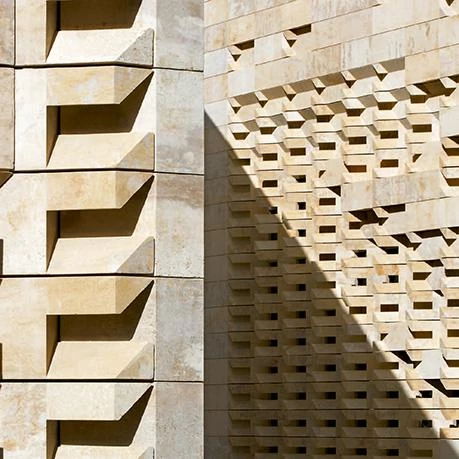 The Parliament building comprises two massive blocks in stone that stand on slender columns to give a lightness to the building, whose shape respects the existing street layout. The two blocks are separated by a central courtyard, which also serves as the main entrance to the building. The courtyard is conceived in such a way that views through to St James’s Cavalier from Republic Street are not obscured. The Parliament’s facades are faced in solid stone. This stone has been sculpted by CNC machinery to create a fully functional device that filters solar radiation while allowing natural daylight inside, all the while maintaining views from the building.