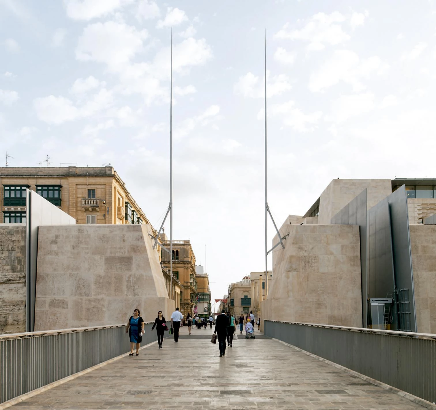 The bridge leading to the Valletta City Gate had been repeatedly enlarged over the years until it had lost both its original function and proportions, ultimately becoming a mix of city square and bridge. The project therefore focuses on returning the bridge to the dimensions of the original 1633 gate built by the military engineer Dingli, by demolishing later additions. This allows passers-by to once again have the sensation of crossing a real bridge, giving them views of the moat and fortifications. Valletta’s first city gate was probably a single tunnel through the city’s ramparts. The initial objective of the project was therefore to reinstate the ramparts’ original feeling of depth and strength. Spurning any sort of decoration, the new city gate is a simple breach in the wall, only 8 meters wide. The architecture is very plain, giving the impression of power and austerity, stripped of any decorative flourish that might distract from its timeless, authentic presence. It is made of immense blocks of stone, cut through and framed by tall blades of steel that mark the divide between past and present. Finally, Pope Pius V Street, which ran inside the gate at a raised level, has been demolished and replaced by two gently sloping wide flights of stairs that link the former bastions to Republic Street.
