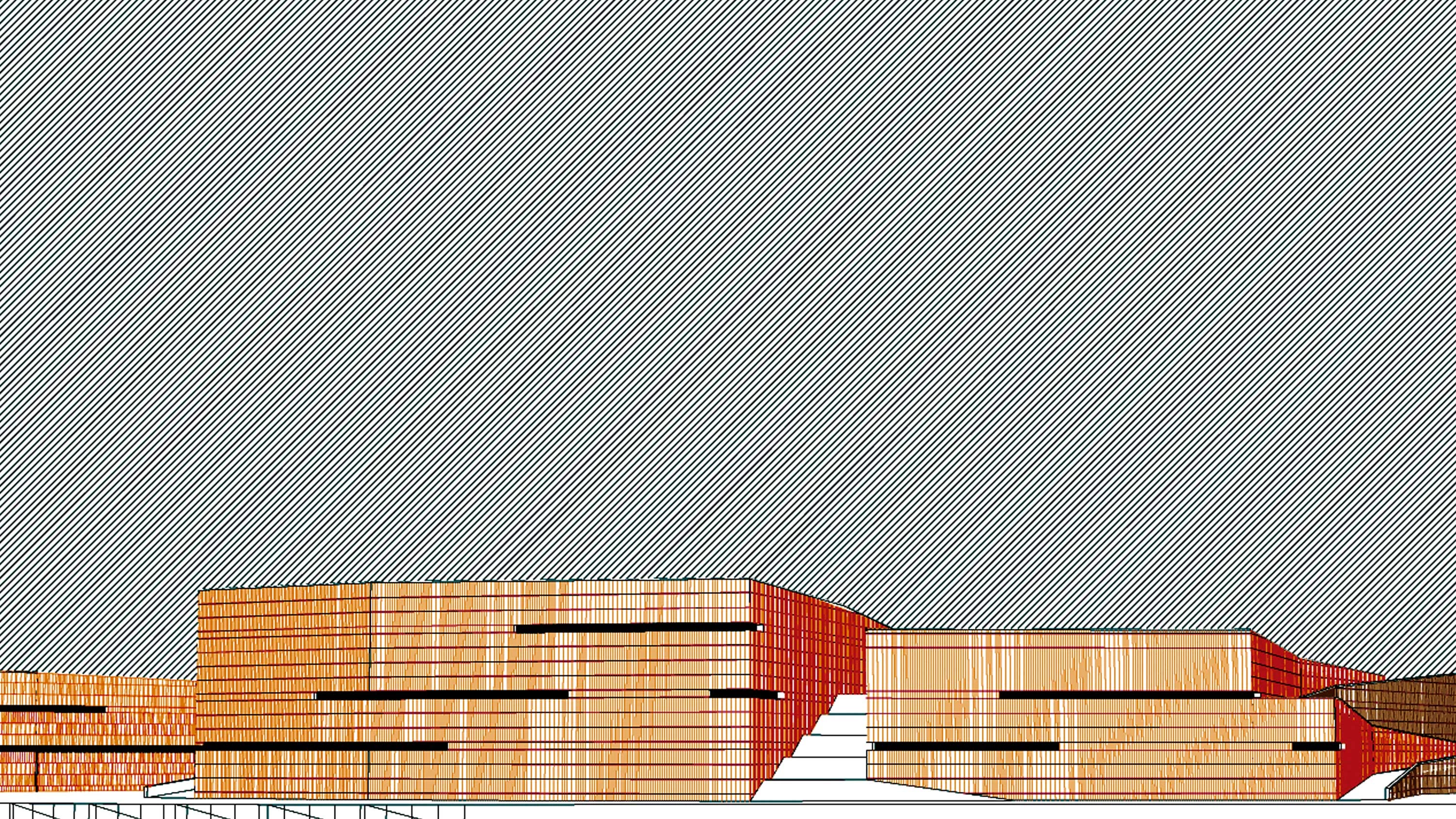La fachada sur del puerto está formada por los ‘dedos’ de la explanada: un frente recortado y masivo como un acantilado, en el que la conexión entre la plataforma y el muelle se produce mediante membranas interdigitales en forma de escalinatas. Desde la marina seca, una pasarela peatonal cruza la embocadura del puerto artificial...[+]