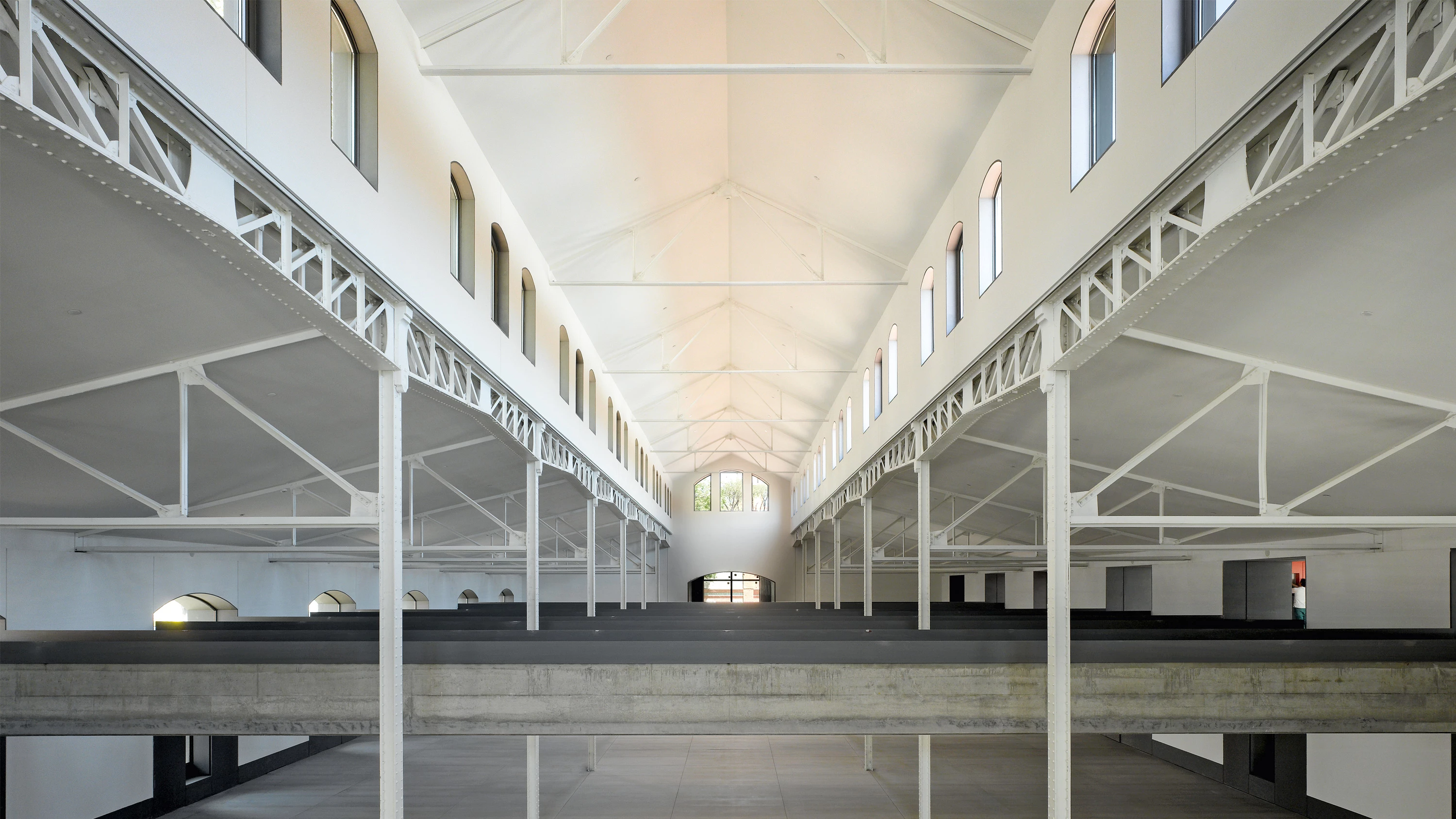 The complex’s industrial character was maintained in the process of imposing a new order on the old hangars. Two levels interact to generate an ever changing scene. The upper one, built with 40-ton precast concrete beams, is a research and study space. In opposition to the warehouses’ basilica structure, the concrete bridges are inserted through the preexisting windows and stitch up the space transversally, unifying the ensemble formed by the previously independent hangars 13 and 14. The lower level participates in the rhythm imposed by the upper floor, but without losing its own essence. Accommodating cultural dissemination activities, it is dynamic and mutable, open to future redefinition.