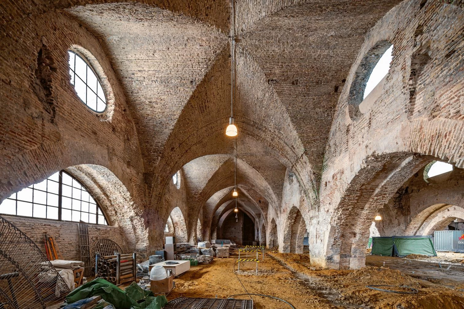 The intervention also underscores the importance of the landfills, which have accumulated in the area since the 16th century until reaching the current level in response to the evolution and transformation of the city. This free-flowing interior space, enclosed by parallel lines of sturdy depressed arches that shelter heavy brick vaults or fragile glass roofs, adds to the historic building multiple arches leading to one another, making visitors feel as if they were moving through an infinite space.