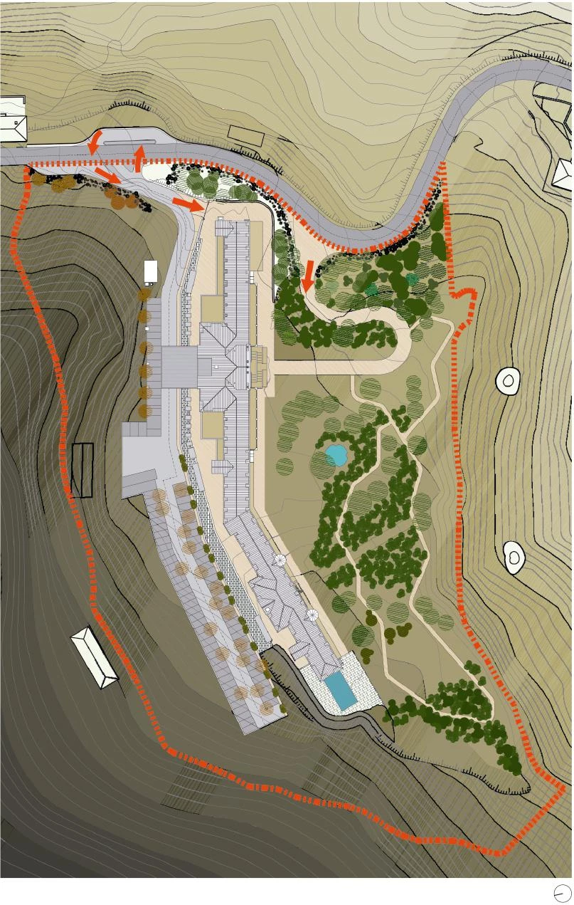 The comb-shaped layout ensures that every room has panoramic views of the mountains, covered with snow during the winter. A series of paths covers the main garden, designed according to an organic pattern in tune with the natural context. At the rear of the building the hillside is carved to make room for parking and service areas, minimizing their visual impact.