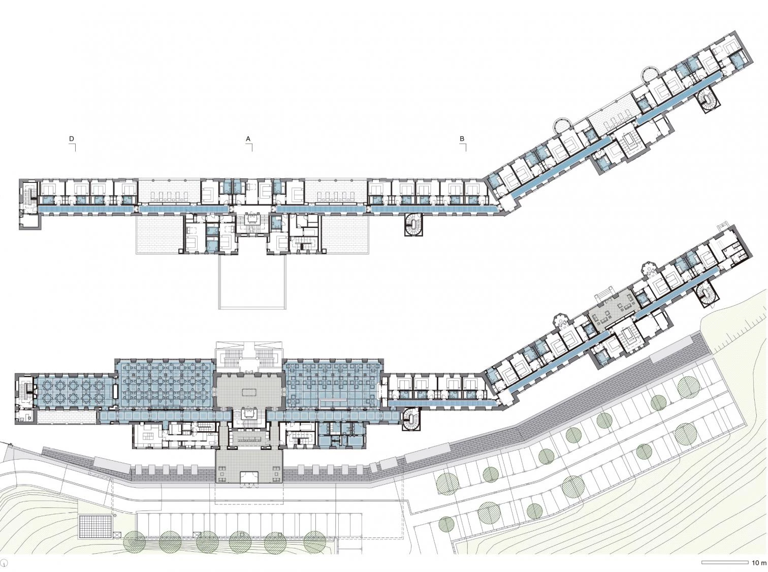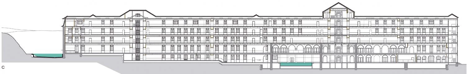The new design is therefore based on the drawings from the old project designed by the Portuguese architect and filmmaker Cottinelli Telmo. To overcome the stigma of the disease, the sanatorium was conceived in its day as a mountain hotel surrounded by nature, avoiding the hygienist image of a medical facility. This romantic vision is reflected in an eclectic style that is maintained after the refurbishment. The healing galleries exposed to sunlight are reopened so that the main facade recovers the contrast between solids and voids, reproducing the same colors and keeping the attics of the original project.
