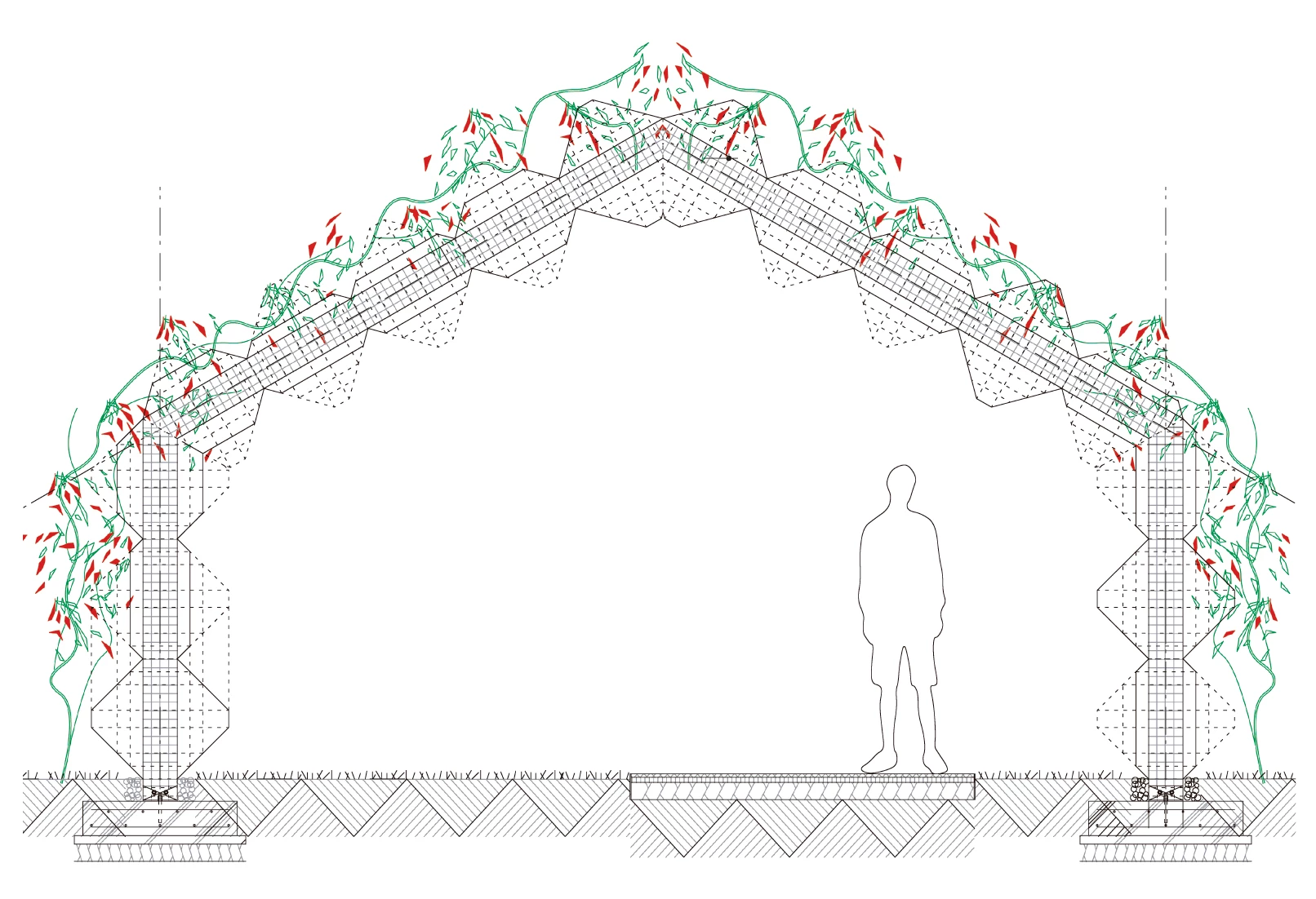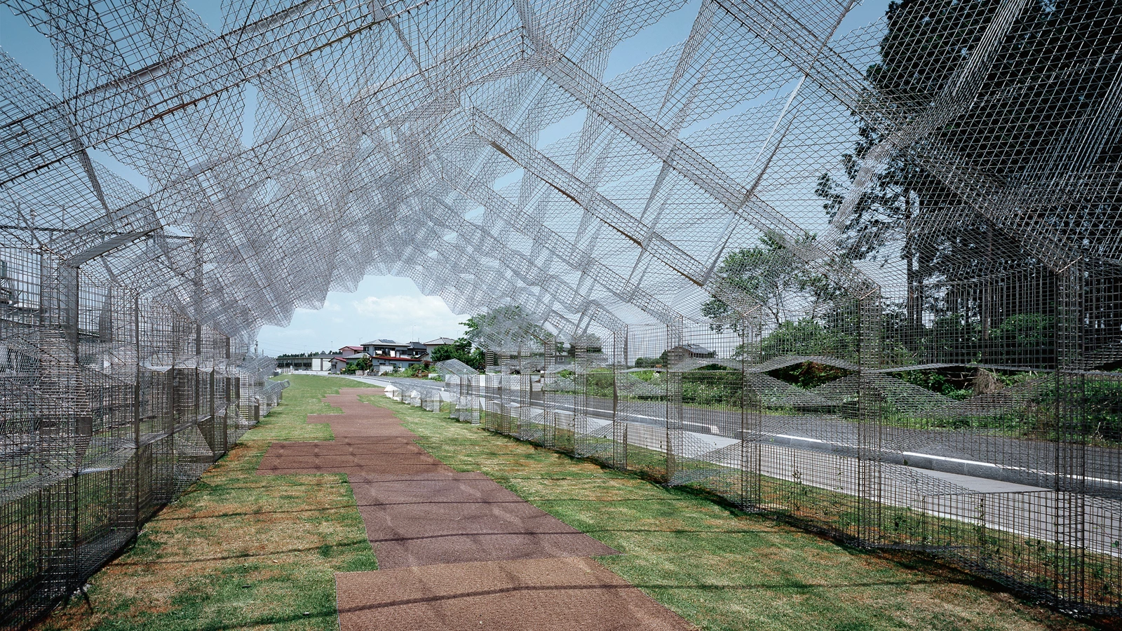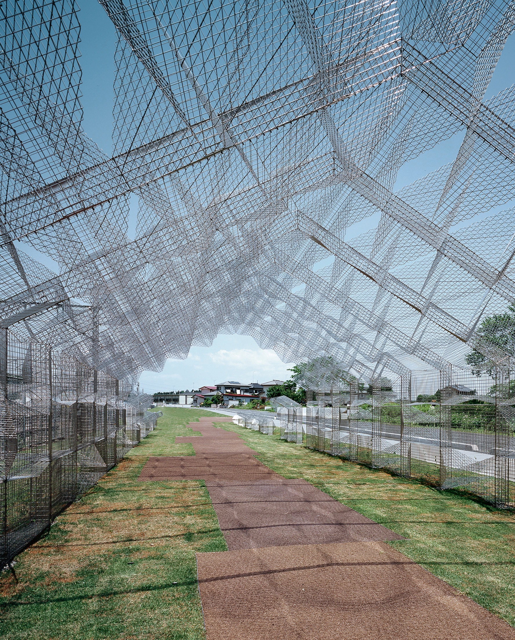 Takanezawa is an agricultural municipality, located in Tochigi Prefecture, some 100 kilometers north of Tokyo, with a population of approximately 30,000 and traditionally devoted to rice farming. Its proximity to Utsunomiya, capital of the province, to which it is connected by highway and railway, has favored its growth especially in the automobile and beer industries.In the areas surrounding the Chokkura Plaza Civic Center, next to the railway tracks, a green shed points at the access to the station. Built with stainless steel mesh of 3-4 millimeters in diameter and following the pattern tried out with the stone of the civic center, with time this ombrière will be completely covered with trumpet honeysuckle. Though with very different materials – stone and sheet –, both works have in common the rhomboidal geometry of their enclosures, and their light and permeable image. The porous but still massive stone blocks of the civic center contrast with the light character of the mesh that generates an almost transparent three-dimensional structure. Sheltered by the clear shadow that the metallic mesh casts, a path of rice husks provides an alternative experience to the linear, open course of the opposite sidewalk.