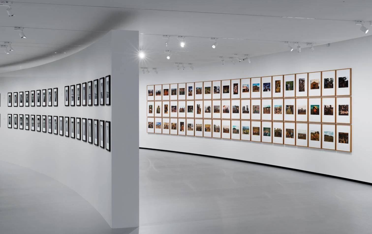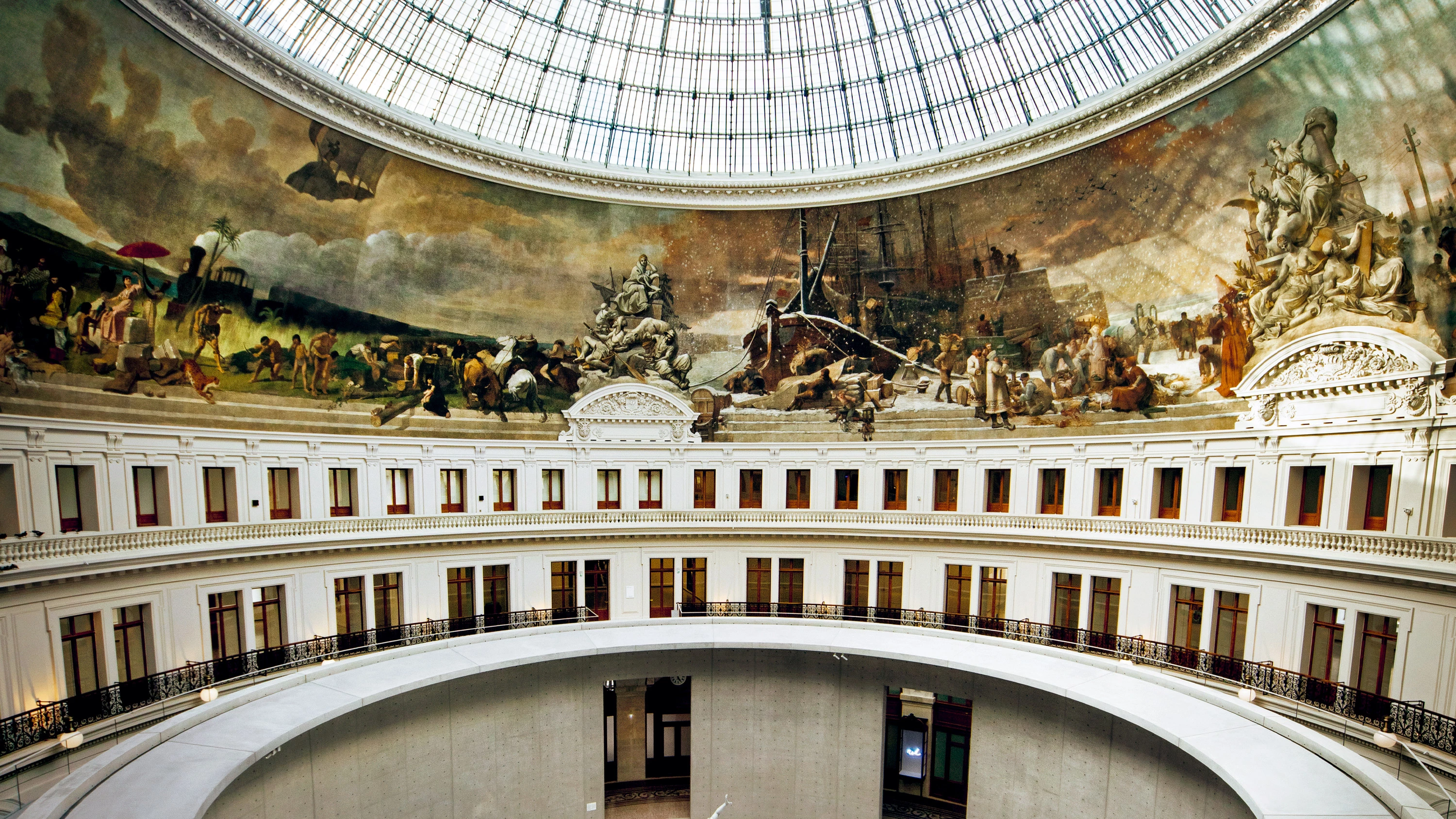 While respecting the Bourse de Commerce’s historical features, the ambitious and painstaking renovation involved inserting a cylinder of reinforced concrete – 29 meters in diameter and rising 9.3 meters – below the dome’s circular structure and the restored frescoes showing scenes of trade among five continents. This new volume delimits the main exhibition hall, a warm and collected space despite being under the huge dome. The gap between the addition and the facade of Blondal becomes a passageway around the main space, with a hallway and a staircase along the circular wall, connecting the ground floor with the 284-seat auditorium and the exhibition galleries in the basement.