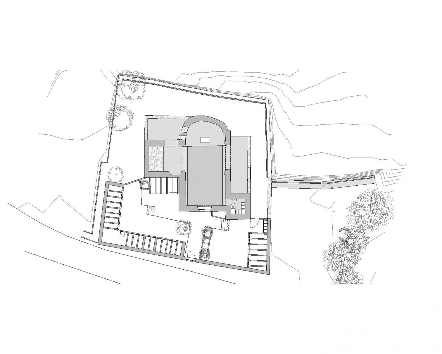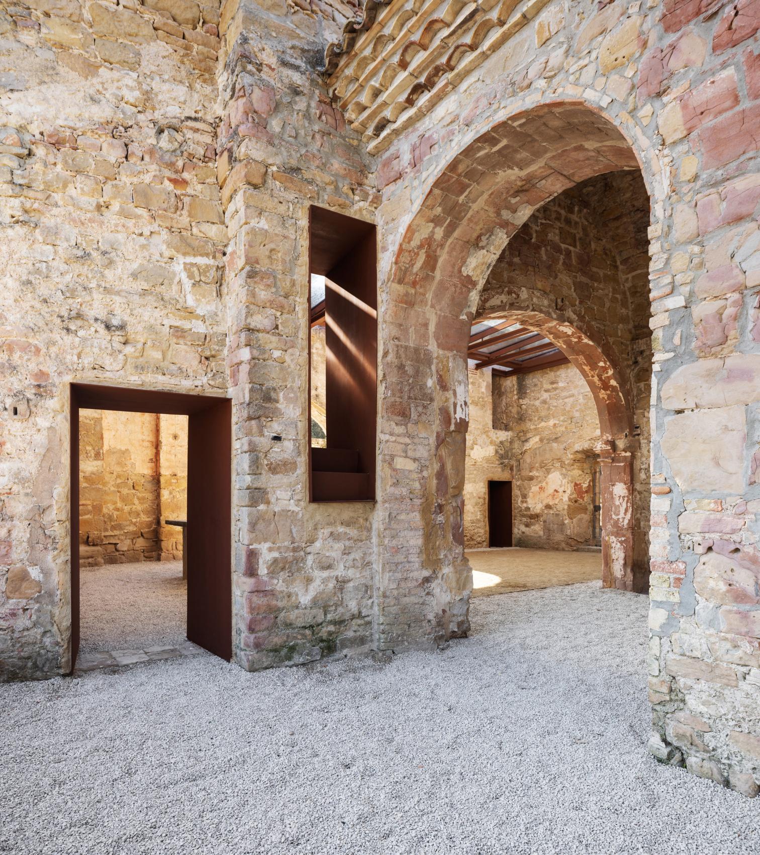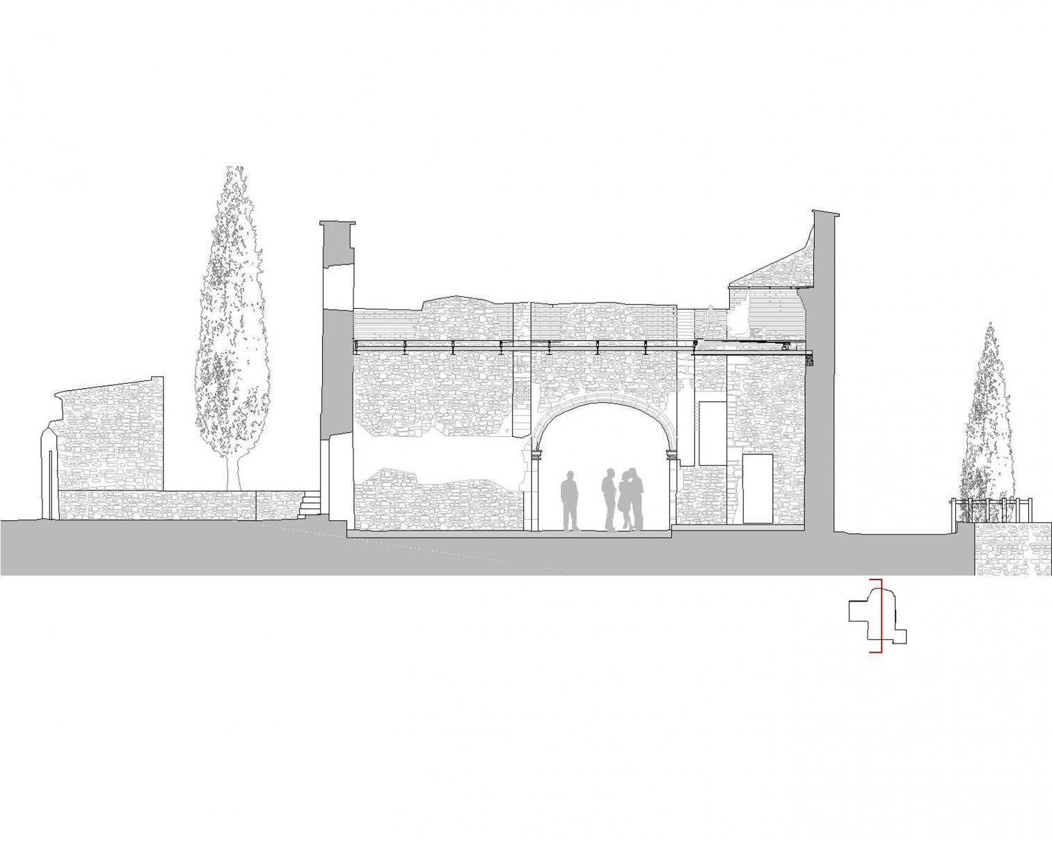 The structural consolidation involves restoring the walls, which means first removing deteriorated cladding. The new glass roof – set at a height of 5 meters, where the walls are flat and regular – is held up by a metal structure embedded into the original stone walls. This roof allows ventilation by means of a perimetral profile independent of the walls, which also channels rainwater into four gargoyles. In the apse, the structure adapts to the curvature of the walls, forming a half-circumference.