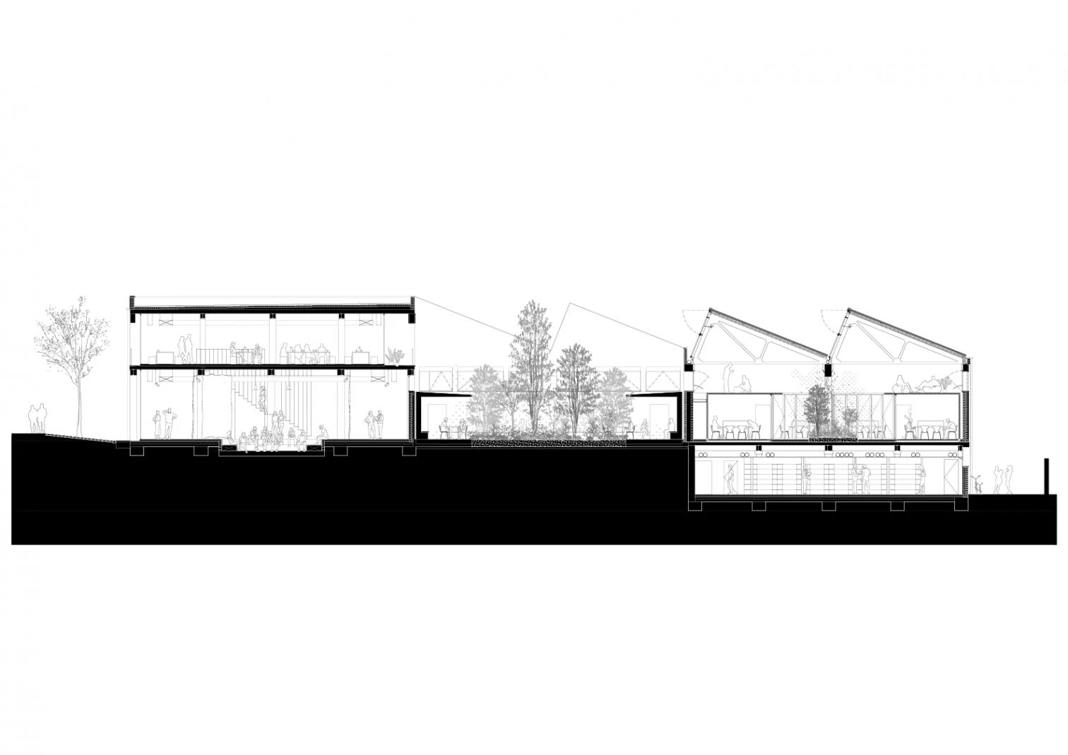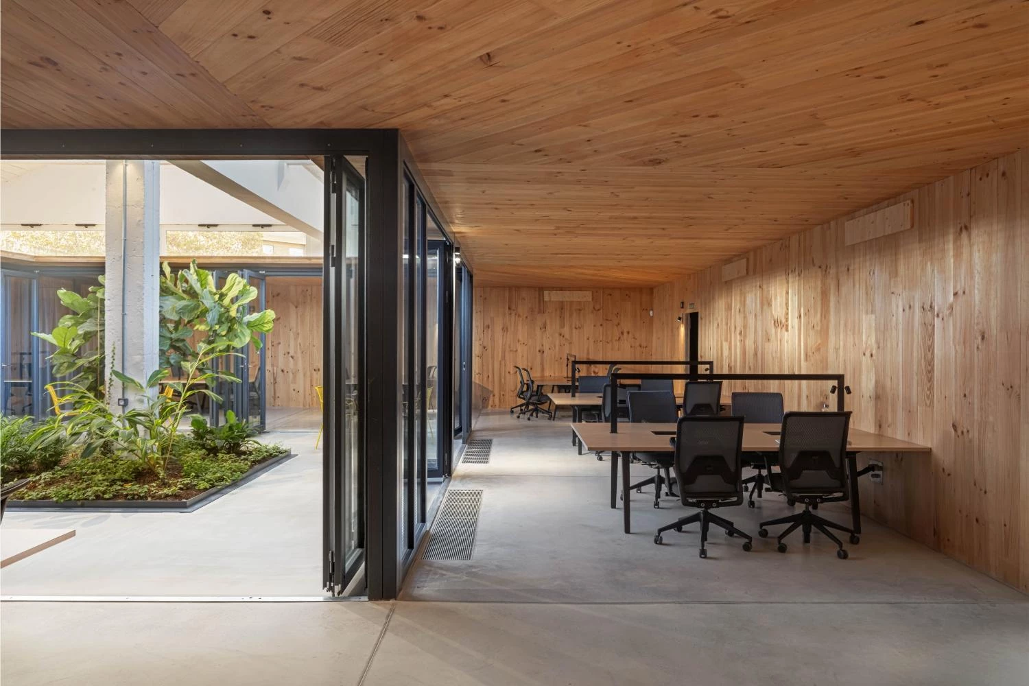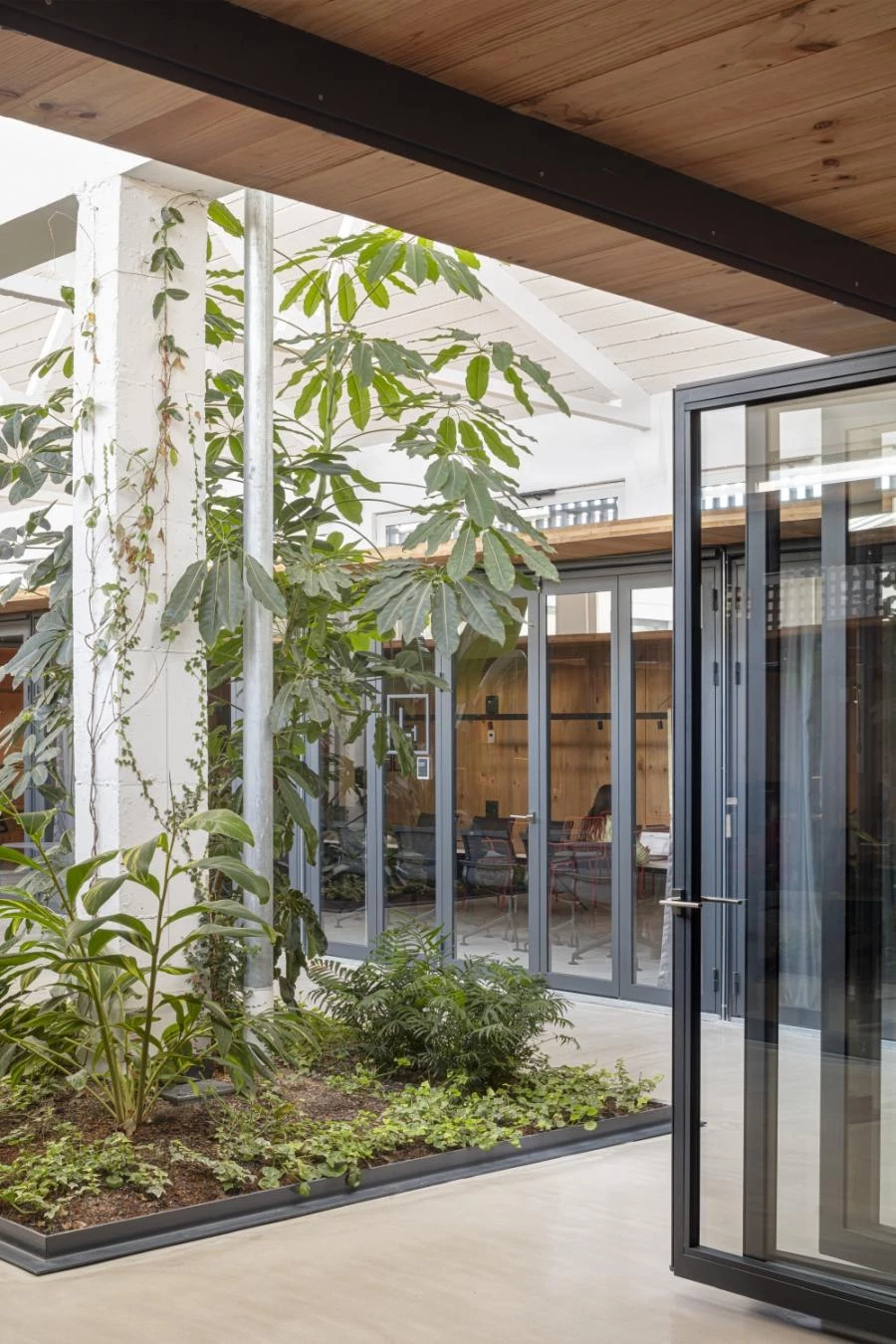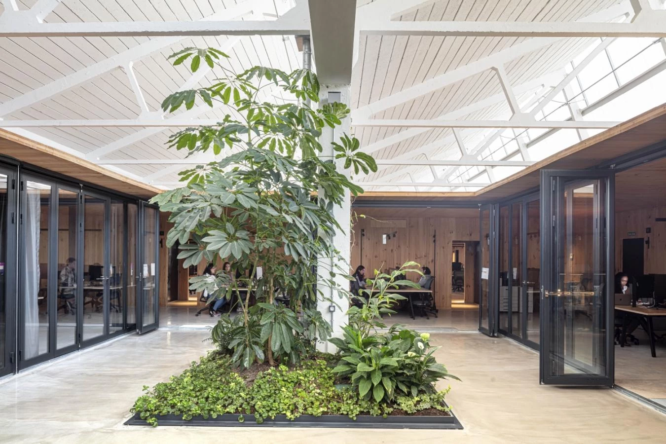 Climatized with radiant floor cooling, the different departments are organized in families that create a circle around interior gardens, favoring interaction. The series of rings, which combine transparent and operable panels with wooden surfaces, avoid interference with the existing pillars, located in the courtyards or between cloisters to create technical passages for bathrooms and archives. The space that is not taken up by the cloisters and is closest to the north facade is devised as a public space for leisure, for food-related events where the kitchen becomes the activity hub. Lastly, the building’s central courtyard is rounded off with an open cloister filled with vegetation, and which functions as a large distributor leading to all the ring workspaces and the breakout zone.