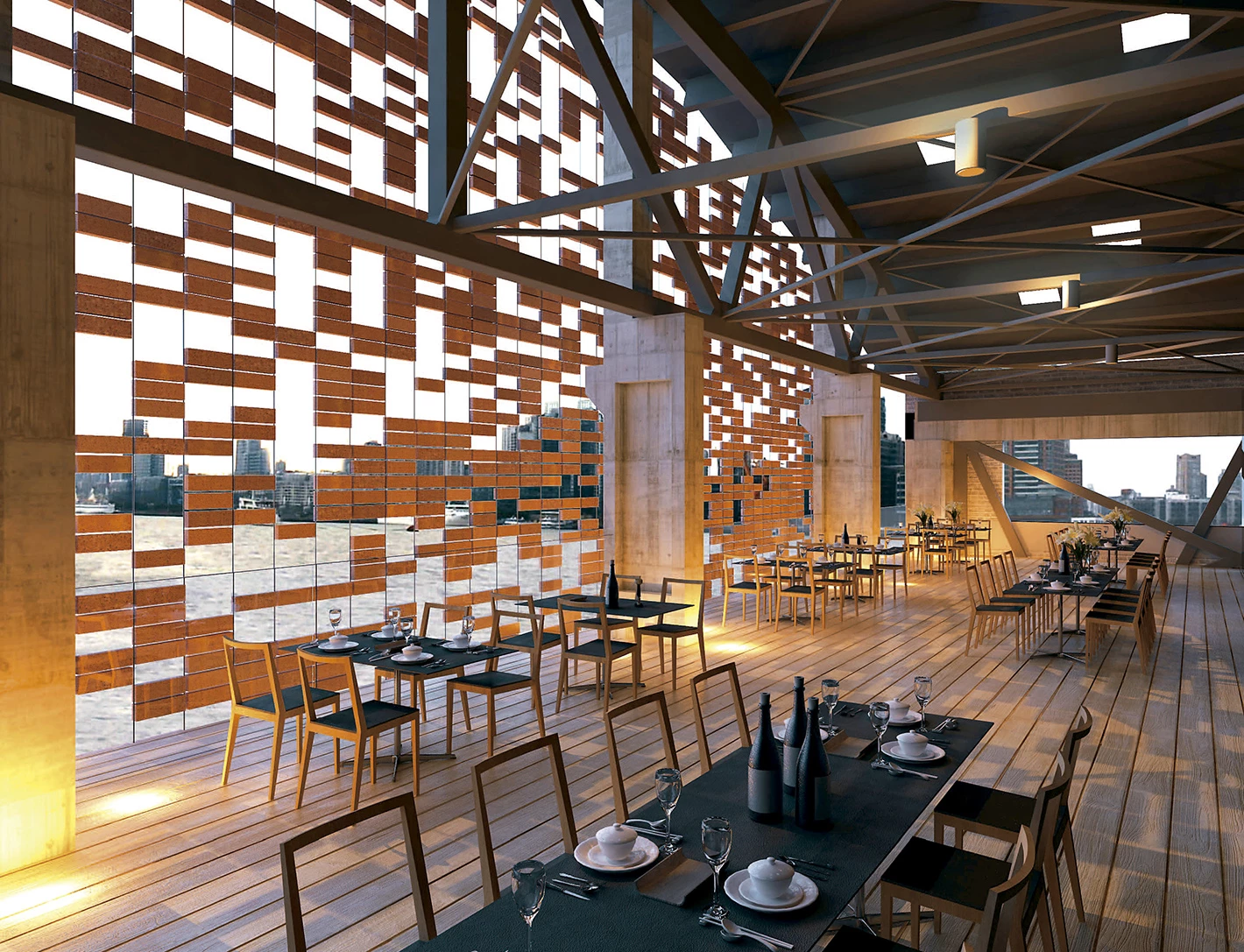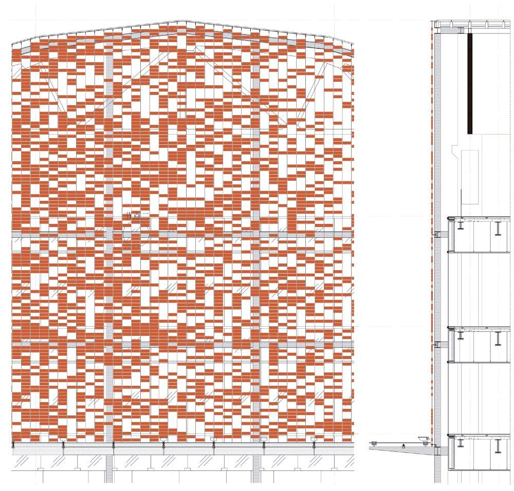 The west front – the main facade of the building – is designed to set up a dialogue between the north and south sides. It does so via a brick latticework that gradually varies its density and permeability: opaque on the north and transparent on the south.