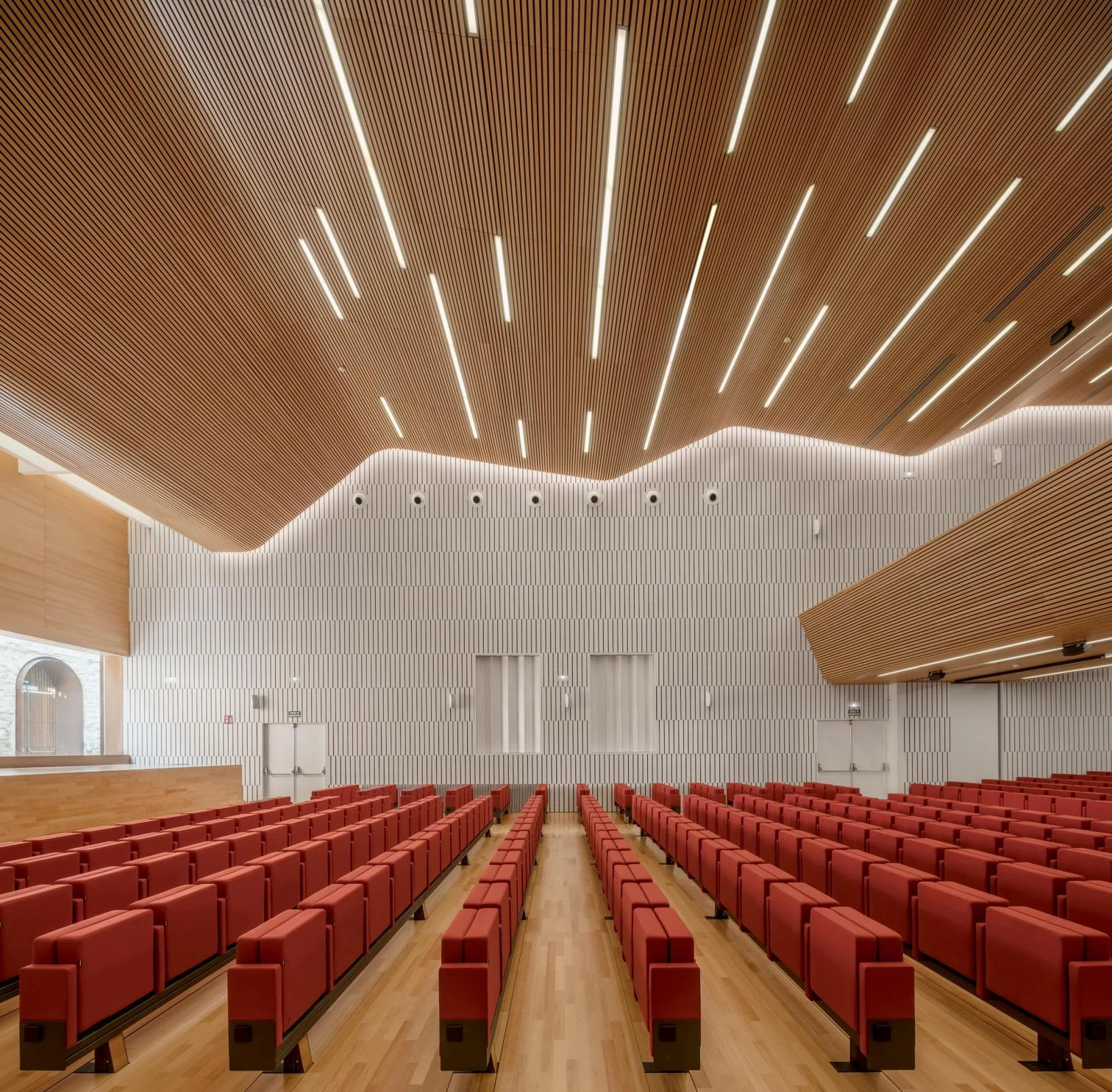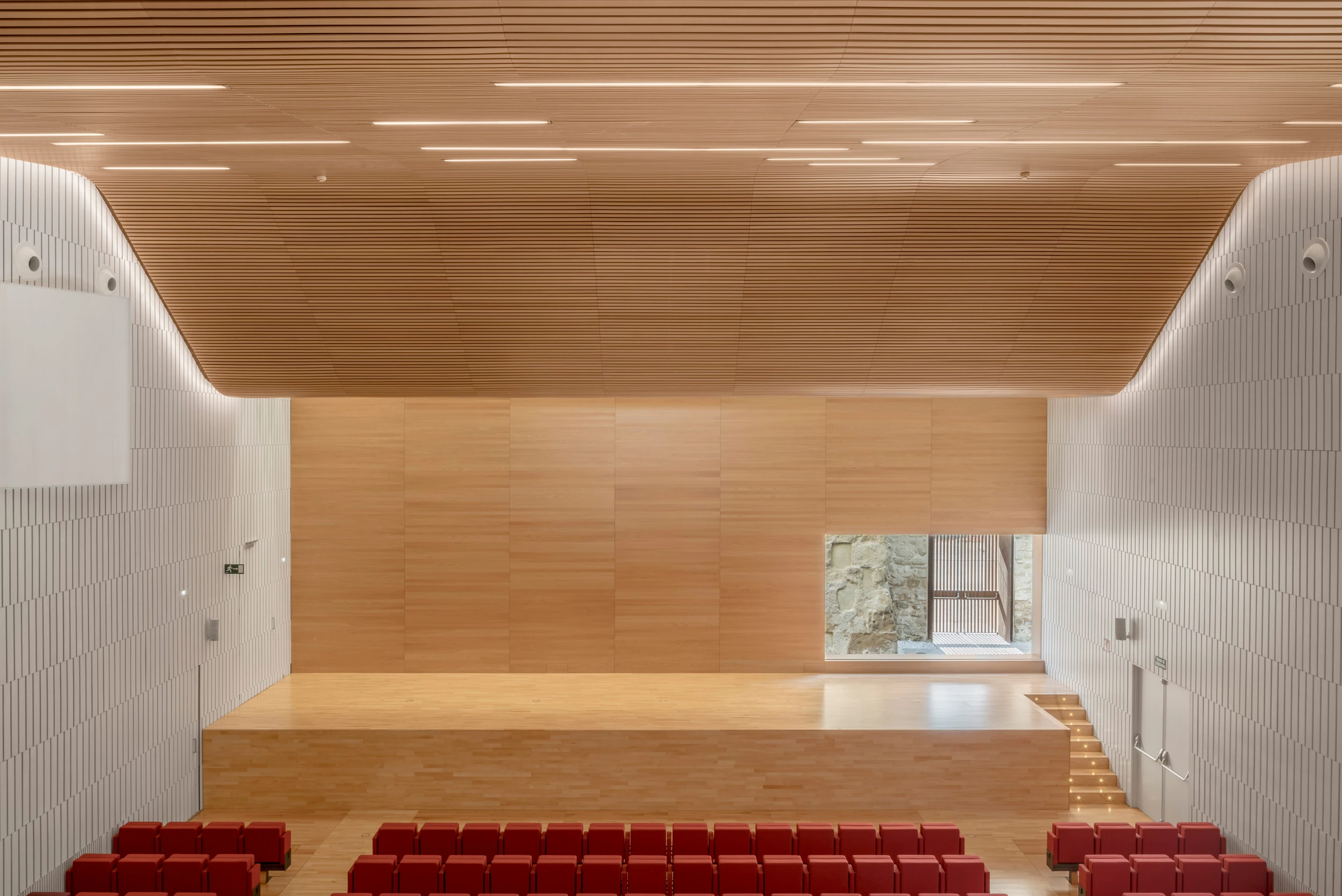 Completely renovated, the auditorium features a large window at the rear of the stage that frames a fragment of the restored old town wall. The hall combines walls with white acoustic lattices and a curving roof built with with wooden panels. The spatial configurations are flexible, adaptable to different uses, and this is achieved through mobile partitions and seats that can be hidden.