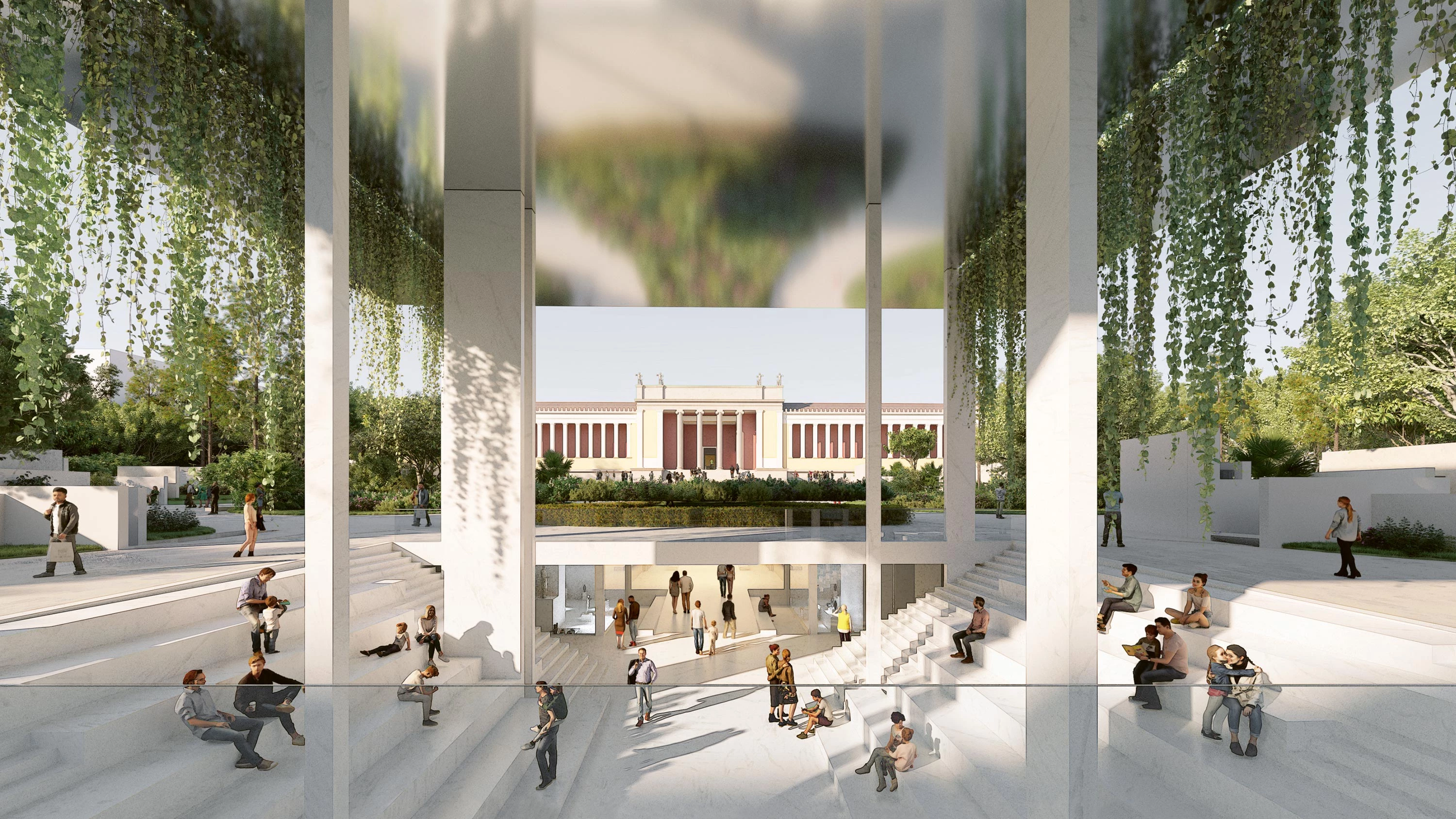 The metal roof, a reinterpretation of the Greek agora, presides the garden and marks the start of the stoa, which functions as an axis through the park, the existing building, the historic courtyards, and the exhibition spaces...[+][+]