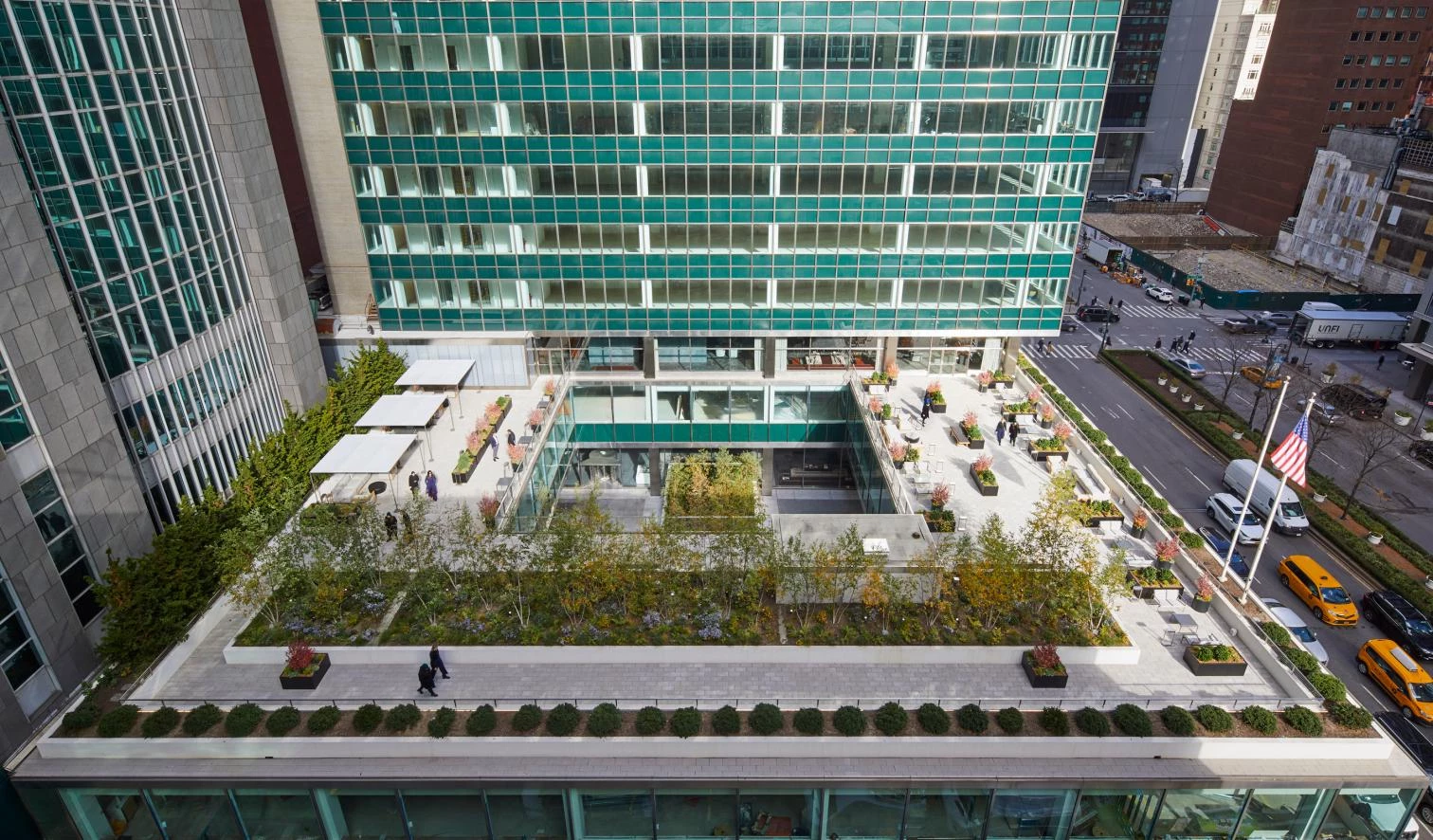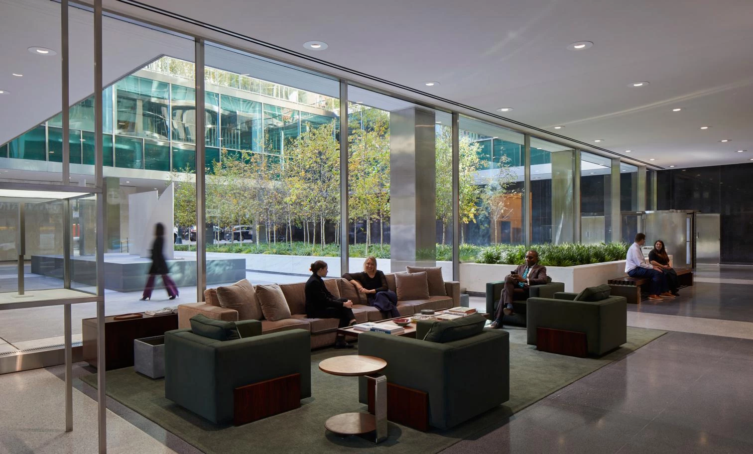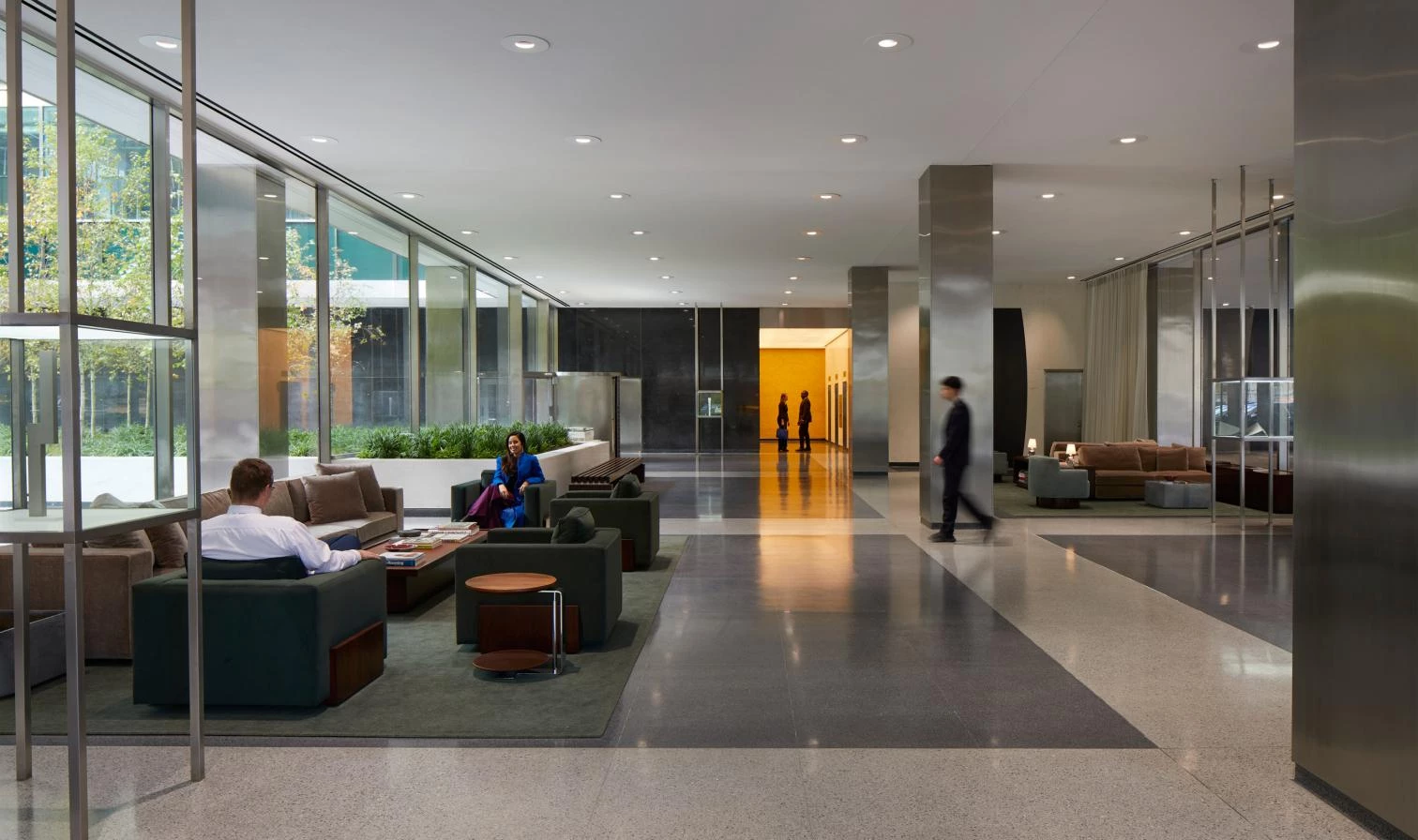 The interiors and exteriors have been reimagined with the collaboration of the interior designers at Marmol Radziner and the landscape architect Reed Hilderbrand. With the help of historical documents, original materials were replaced with care and respect, as in the restoration of the main public and private areas: lobby, plaza, offices, terraces, the third-floor lounge, mechanical systems. All these features have regained their past splendor while improving in energy efficiency.
