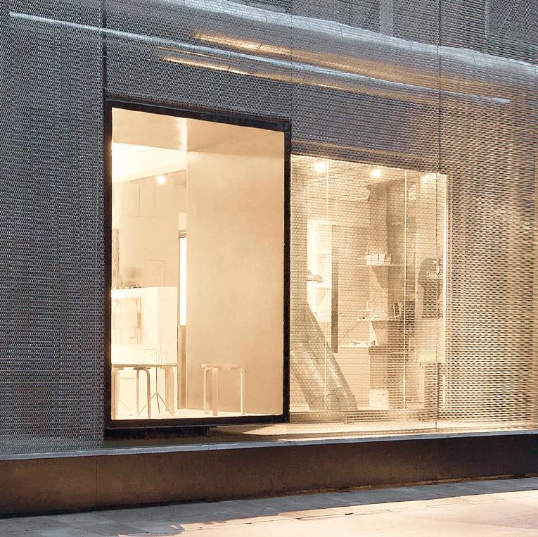 The project also revitalized a green belt which was enclosed by a fence across the street. This space was opened up, creating a small plaza covered by a canopy made of the same metal mesh material as the entrance, unifying the surrounding space with the museum.