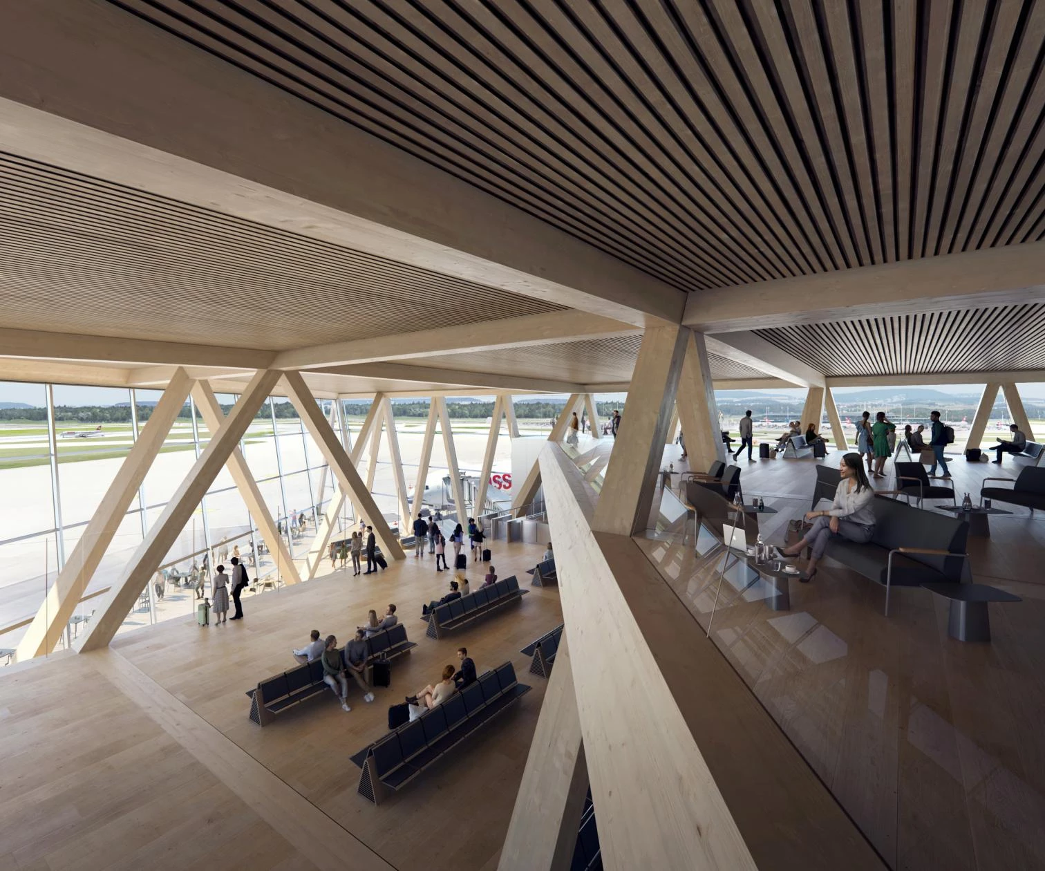 The Raumfachwerk `proposal, where timber plays a central role, has won the bid to renovate Dock A and adjacent buildings at Zurich’s airport. The scheme drawn up by BIG (Bjarke Ingels Group), HOK, 10:8, and Buro Happold carried the day over those submitted y teams led by Foster + Partners, Grimshaw Architects, and SOM, among others. The sculptural structure of local timber, built with prefabricated components, is based on columns that branch out in V shapes, evoking the image of Alpine woods. A linear skylight widens towards the seven-level central atrium, where the control tower is placed. The roof is covered with photovoltaic panels.