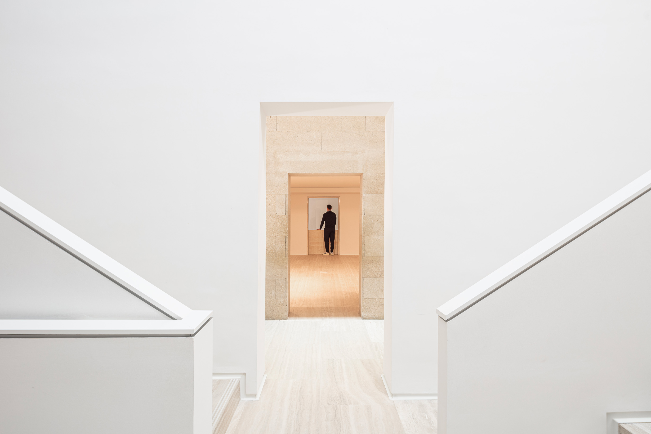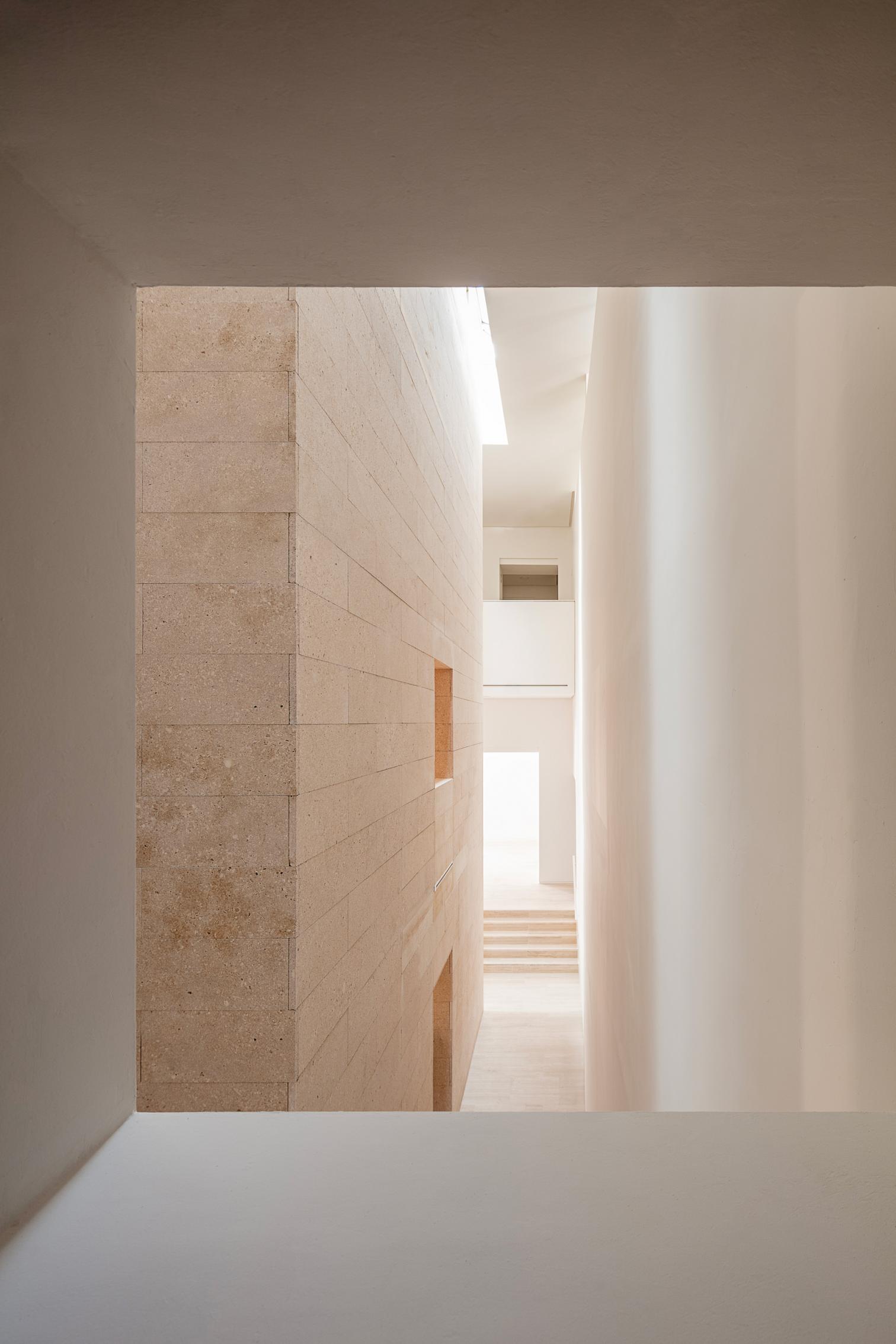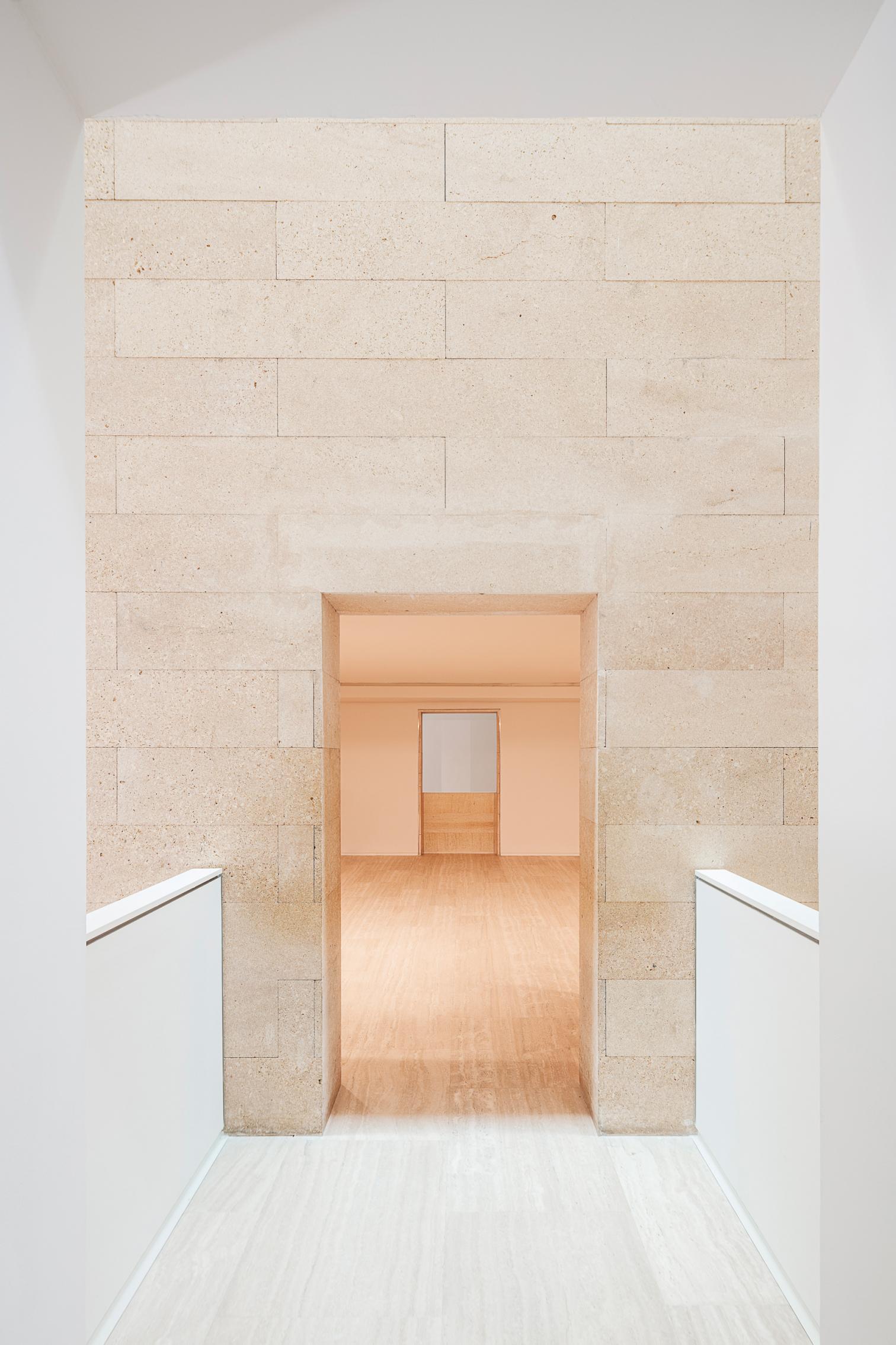 The architectural project has reinterpreted the existing spaces on a contemporary note, redefining entryways and circulations to make them more obstruction-free and more easily accessible, eliminating elements that hindered the flow of routes while allowing natural light – filtered by overhead openings on the central stone cube – to play a starring role. The removal of the original stairs – moved into the new vertical-circulation core – has changed the way the space is perceived: a vertical reorganization that visually lightens the whole complex and reinforces inter-floor connections.