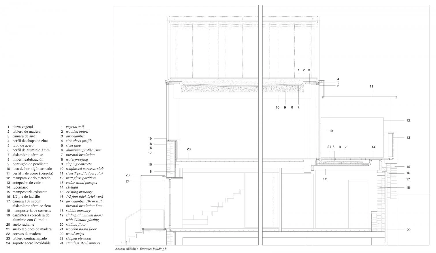 The bridge/passageway is superposed to the transition of historical time and the individual perception of the passage of time. The ‘cul-de-sac’ of the Travesera, from where one perceives the park though it does not seem accessible, has several exits. The steps bring us into a labyrinth with several openings, one of which goes directly out to the Ruela. The street itself expands on either side: towards the open horizon with views of the city and towards the stepped space. From the latter the collective central space flows through the courtyard orchards on one side and on the other it flows out towards the park. Finally the passageway from which one acccesses the communal facility extends in a bridge that takes us into the Park. One moves from an anodyne urban situation, through an unexpected filter, to a world of magical evocation. Human beings in the center. Technology, materials and vegetation. Dimension, light and space. Order and emotion.
