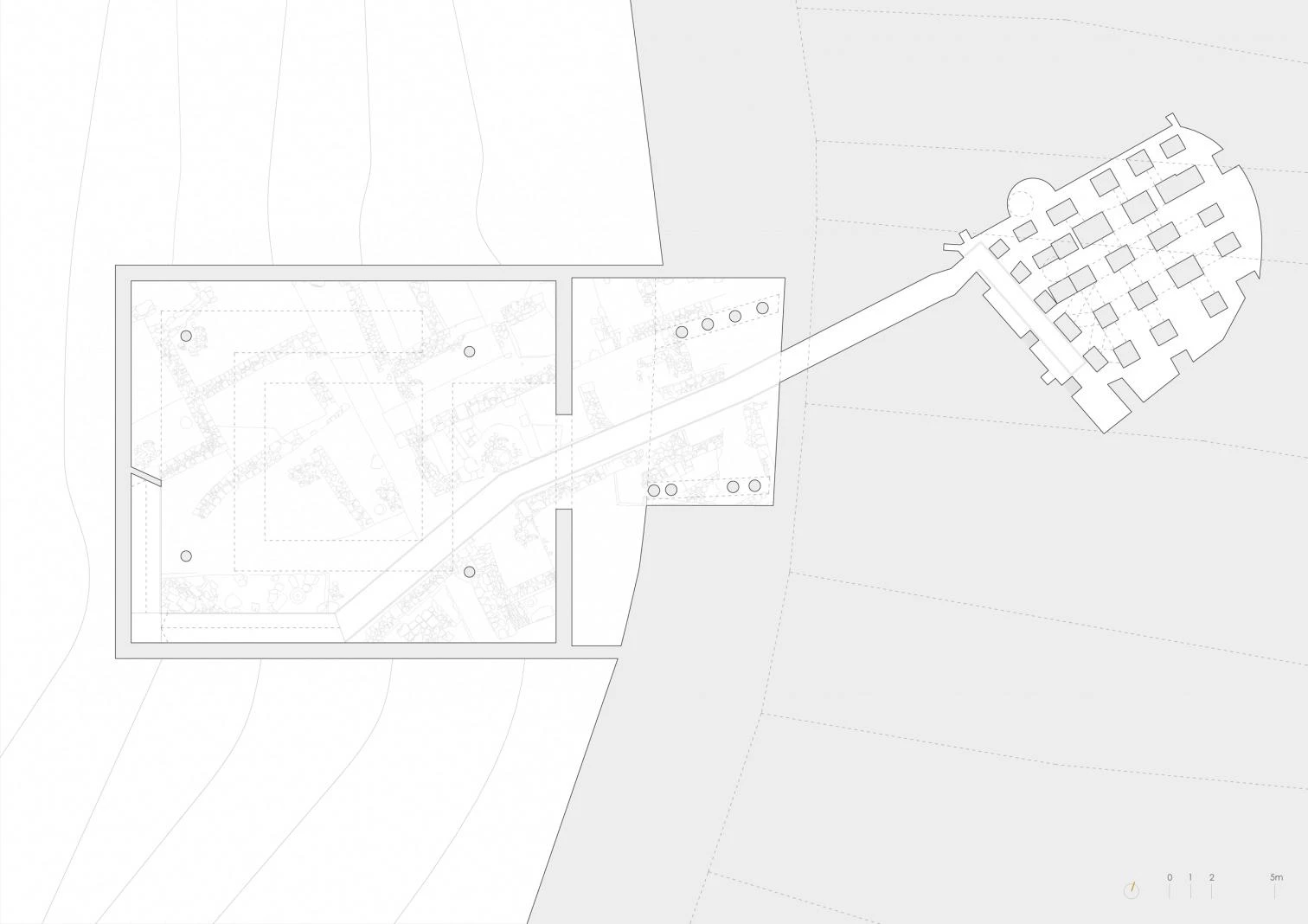 After a long and complicated restoration, the cistern currently operating has opened to the public. To give access down to the tank, the first part of the project involved building a visitor reception center that included a suspended descent ramp spiraling 100 meters without ever touching the archaeological remains. In order not to affect the houses standing above the Roman complex, this new construction rose on a vacant spot at one of the edges of the nearest road. Hence, the need to provide a way to reach the cistern led to the adding of elements other than the visitor center, namely a bridge over Calle San Marcos and a tunnel under the houses.