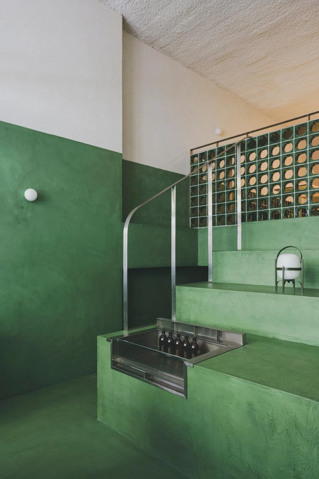 At Fortuny 47 in Madrid one finds an 80-square meter eatery called Greta Salad Bar. The objective of the project was to convey an identity linked to healthy values, through a design that floods the spaces with the color green. Different greenish tones are used on different materials, unifying the space.