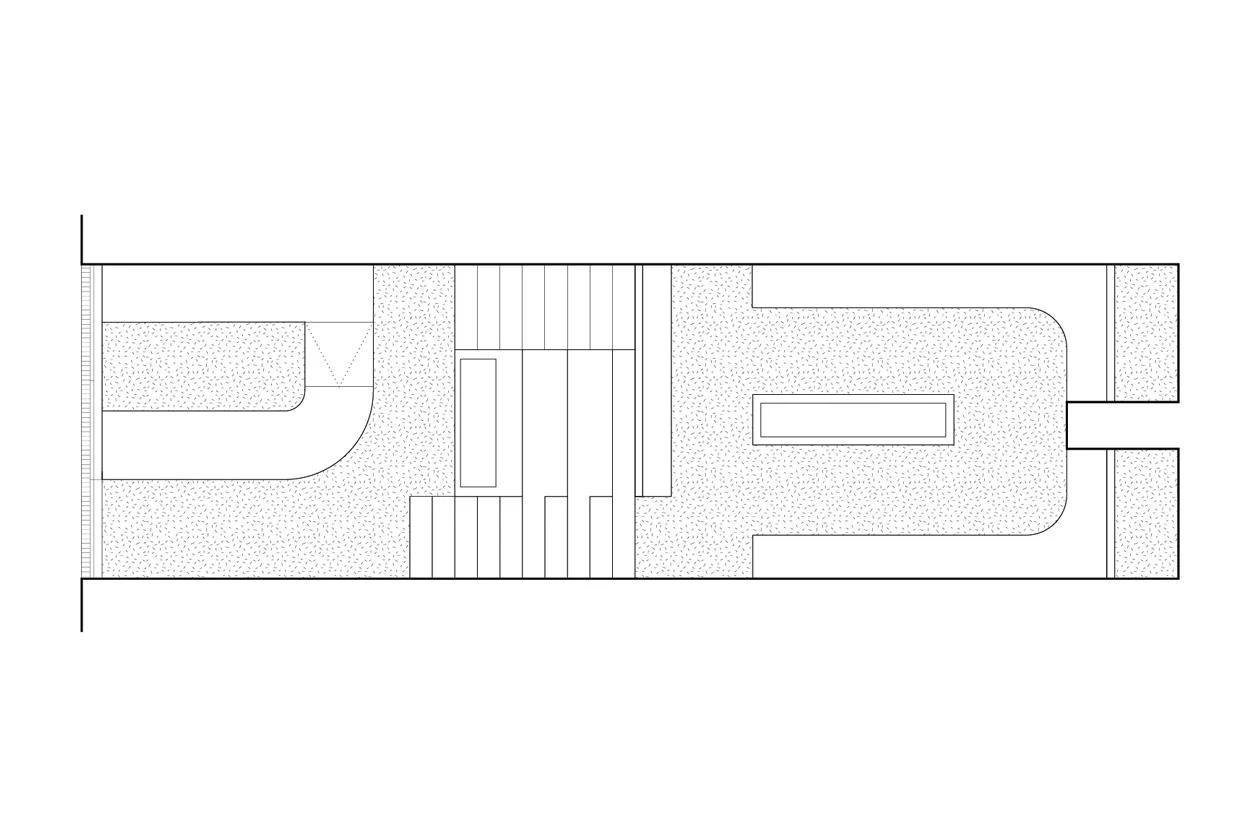 Instead of compartmentalizing, the design plays with ceiling height and three areas are marked out in a longitudinal scheme. A large tiled bar welcomes clients and serves as a surface on which to both display and prepare food. An 'amphitheater' then provides seating for eating, solving the matter of changing level by means of an integrated staircase. The highest zone is the actual dining room, surrounded by plants and a continuous bench.