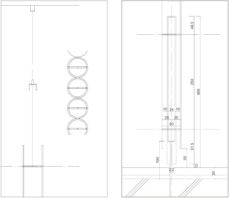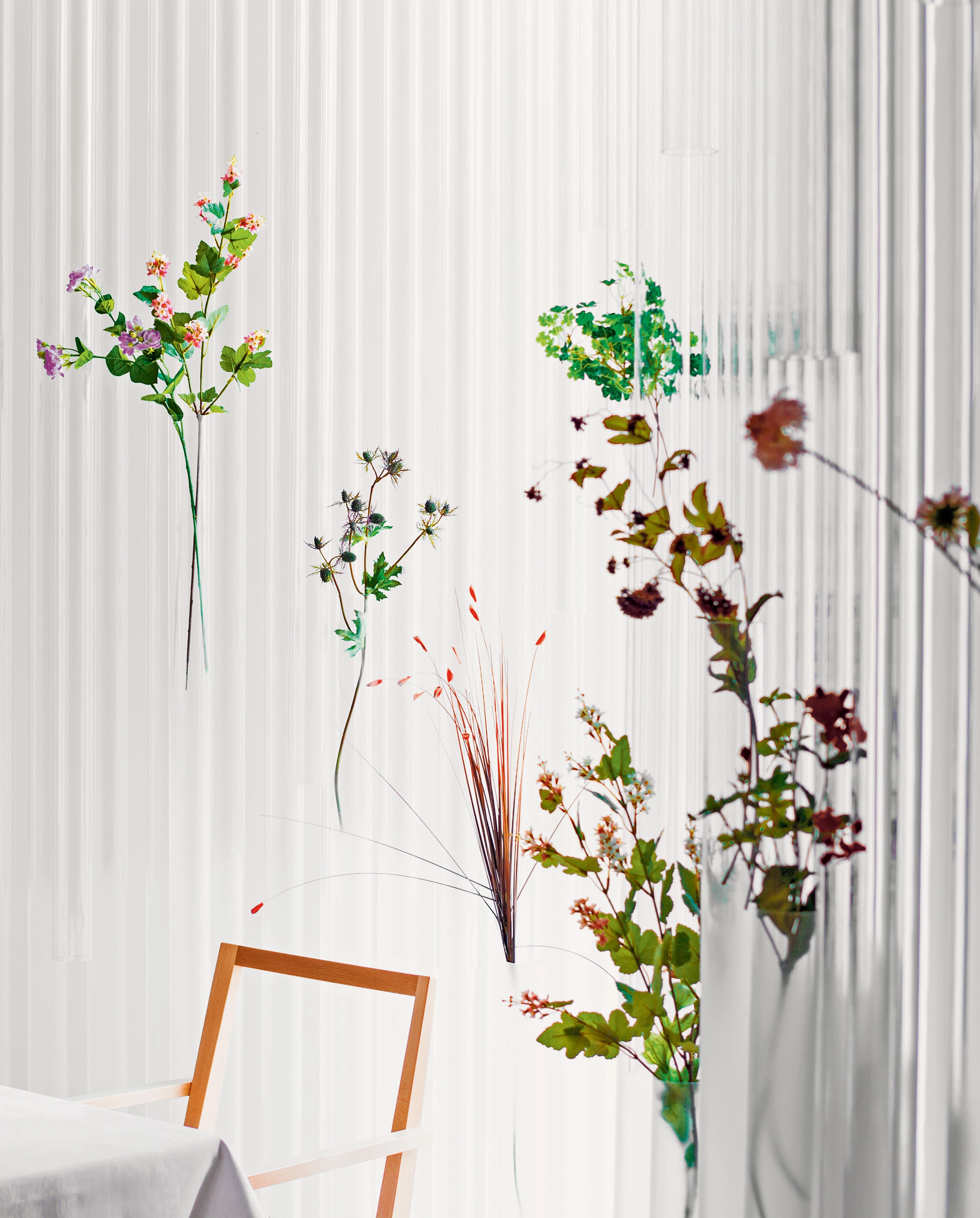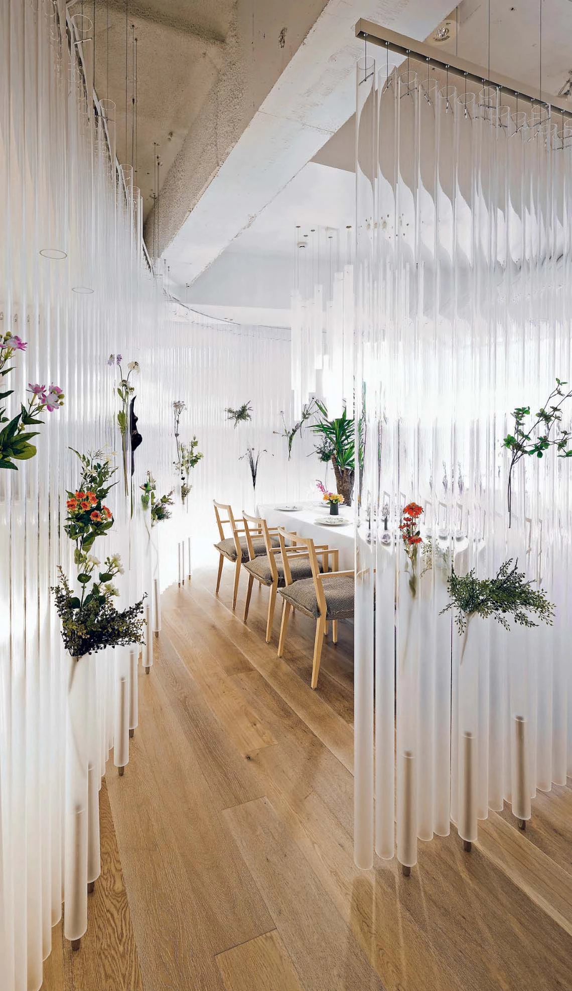 A succession of translucent acrylic cylinders resting on wooden bars surround the different spaces of the Nacrée restaurant and serve as support for bouquets of flowers that seem to float on the air.