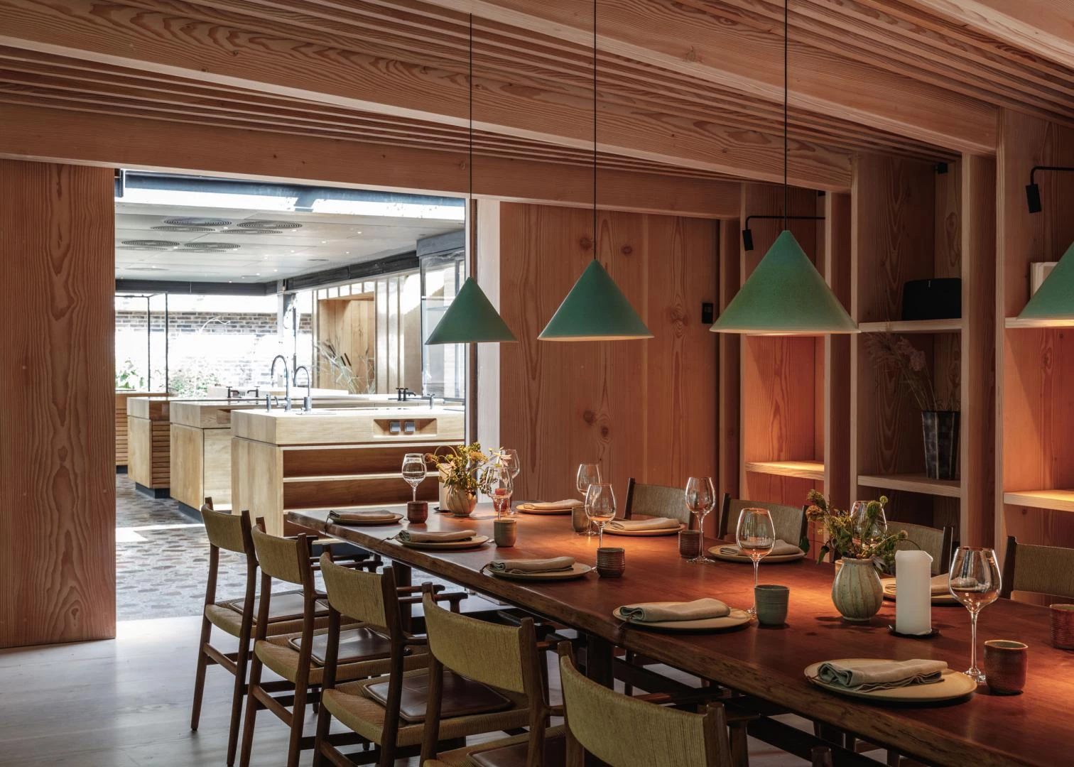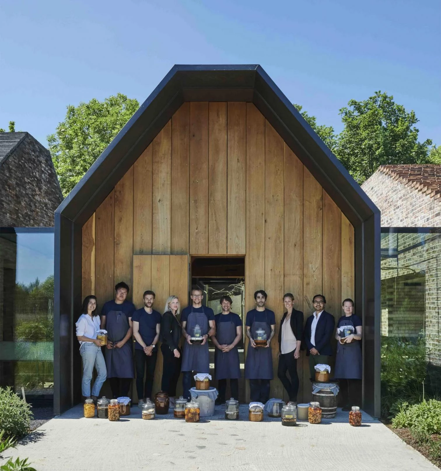 The heterogeneous complex, where assorted building materials and methods are used, evokes the archetypal form of an Arctic villa. The interiors, too, allude to vernacular elements of Nordic imagery: the dining rooms are clad in stacked timber planks suggesting piles of firewood beside the flames of a hearth, and the lounge, entirely finished in brick, can be read as a huge fireplace. The glass-covered paths between the ‘buildings within the building’ enable chefs, staff, and guests to appreciate atmospheric variations in the course of the day and year. The complex is contained within a well-tended garden designed in tune with the ecological principles of permaculture. Here, three greenhouse structures are used as an indoor food garden, a bakery, and a test kitchen, a laboratory for cooking up new dishes.