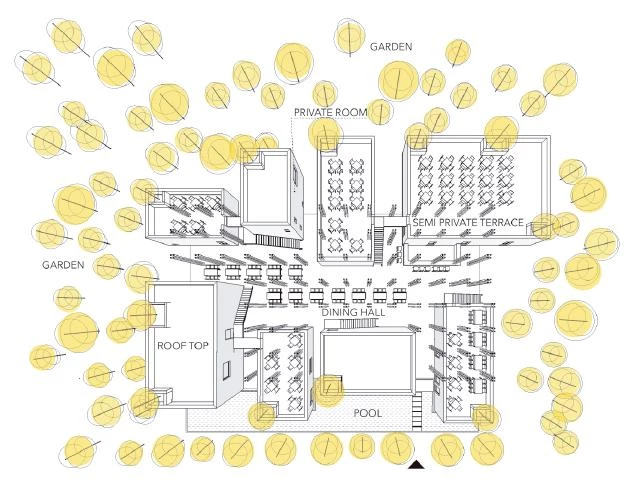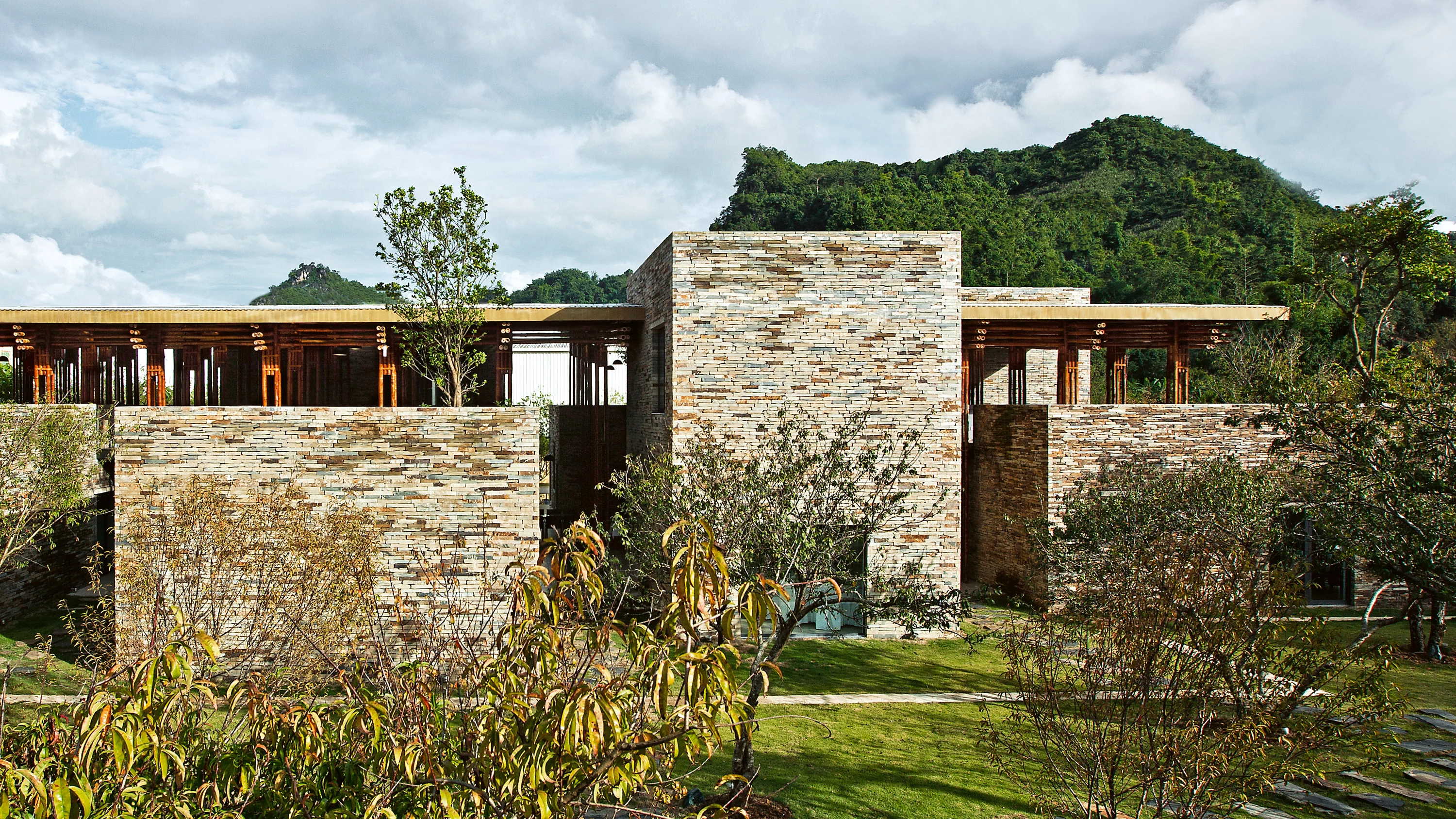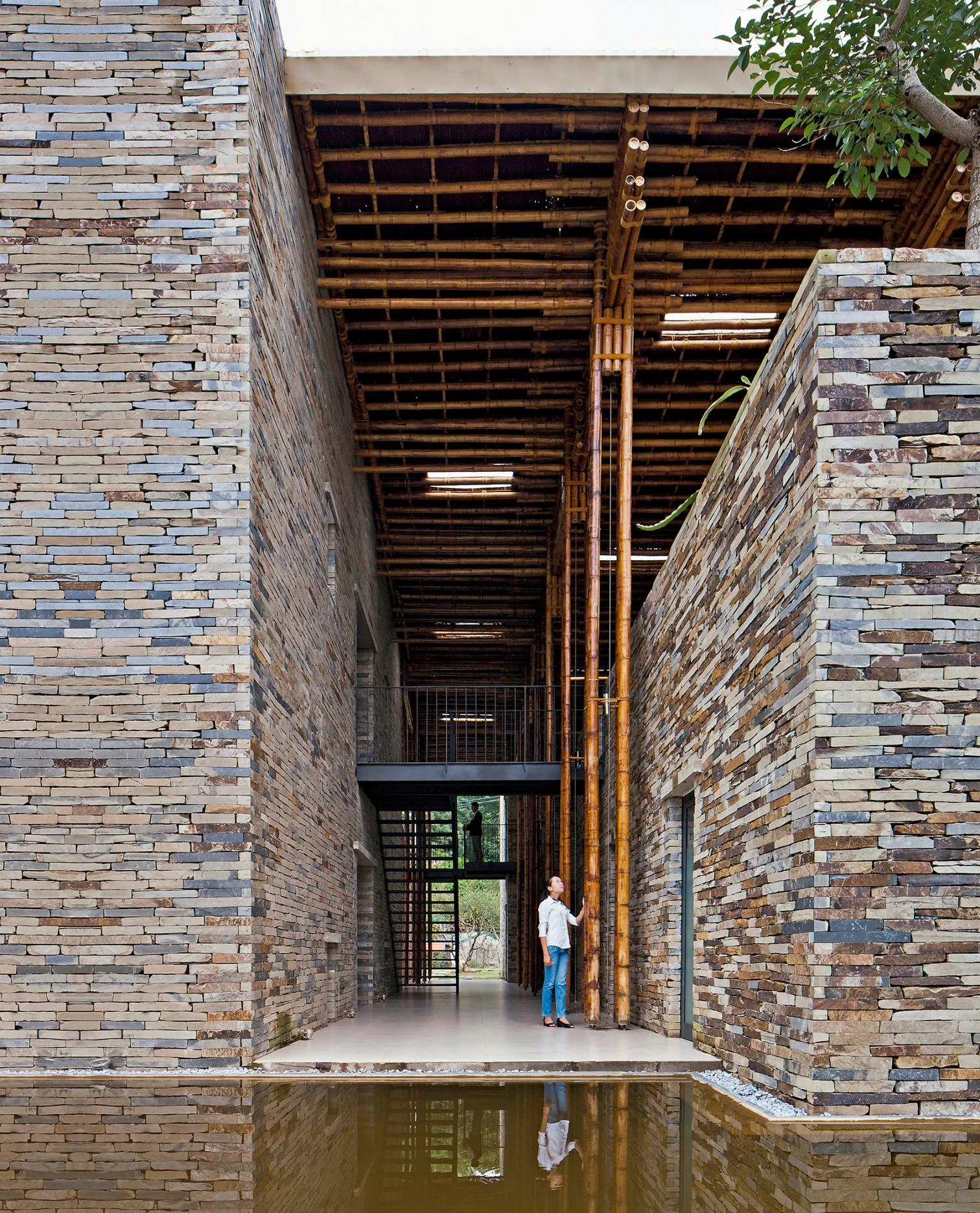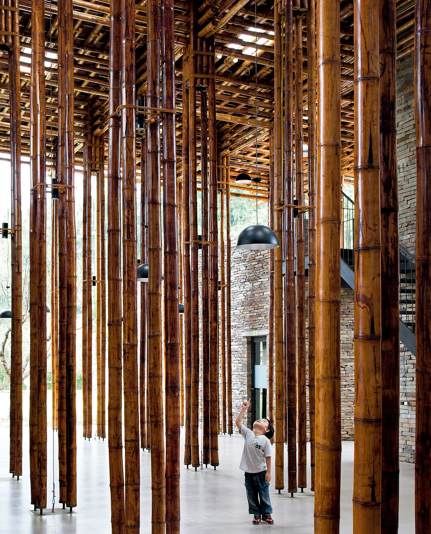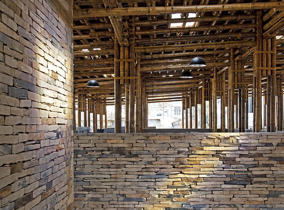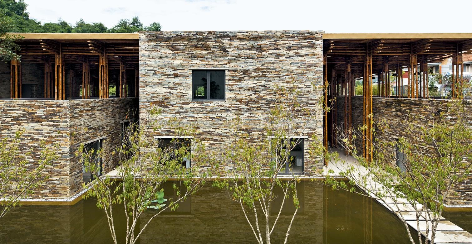 Due to the difficult, precipitous terrain, the site is only reachable from Hanoi by car along precarious cliff roads. Accessibility makes transportation of building materials and work forces complicated, so the project was completed with local materials, techniques, and workers. Besides this, the local climate also defined the spatial layout of the project. During the humid and warm monsoon, eight volumes at different heights and built with local stone walls create air-conditioned spaces. During the dry season, a large exterior space houses the main dining room, protected by a light bamboo pergola that rests on ten beams and 96 columns, each composed of four ‘luongs’ (local bamboo canes) that grow up to eight meters tall.