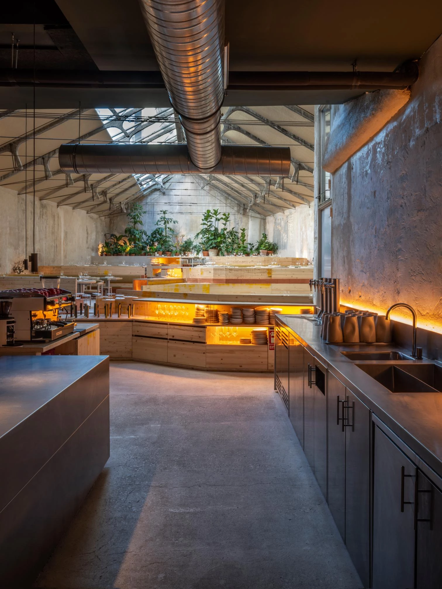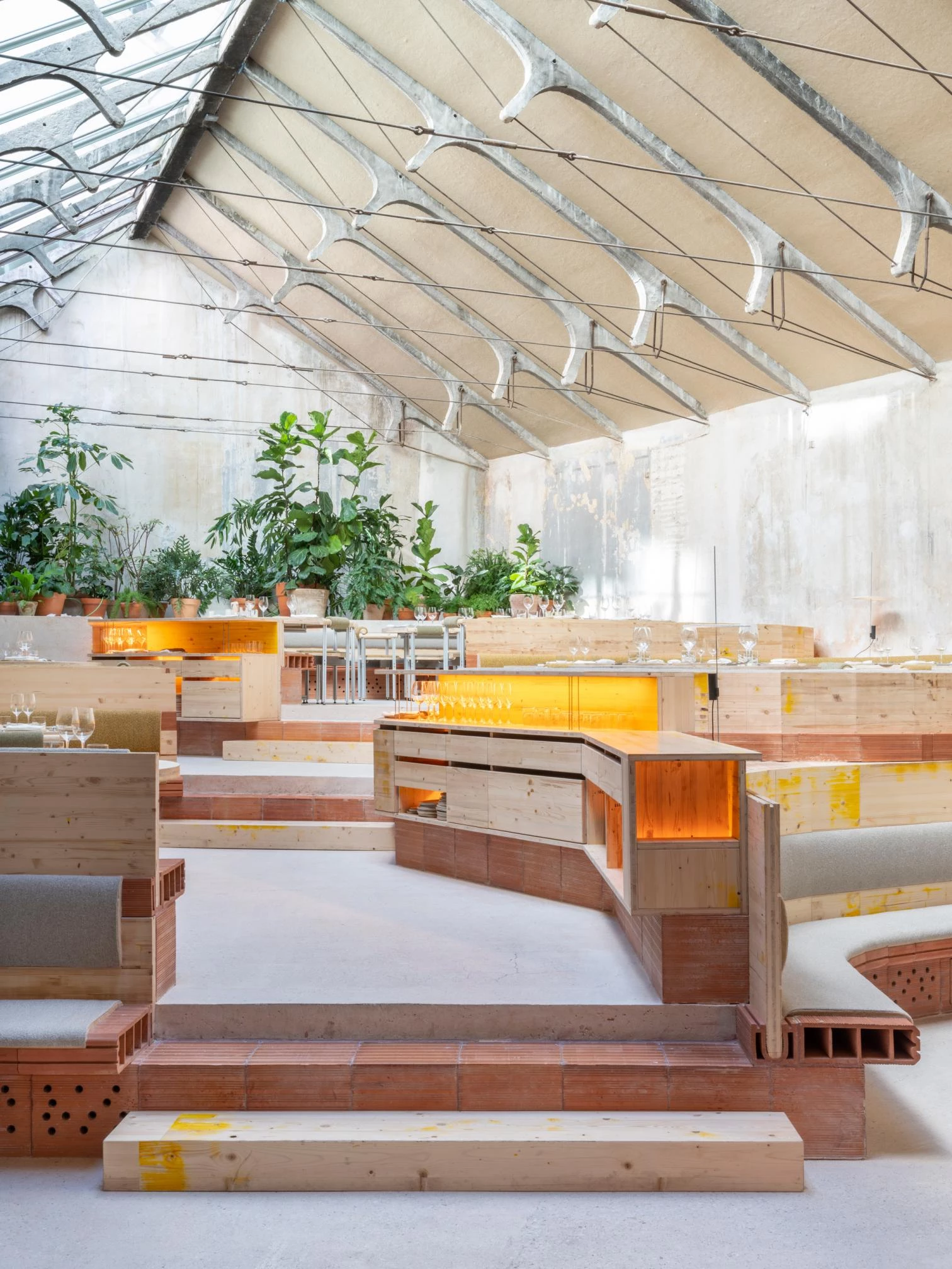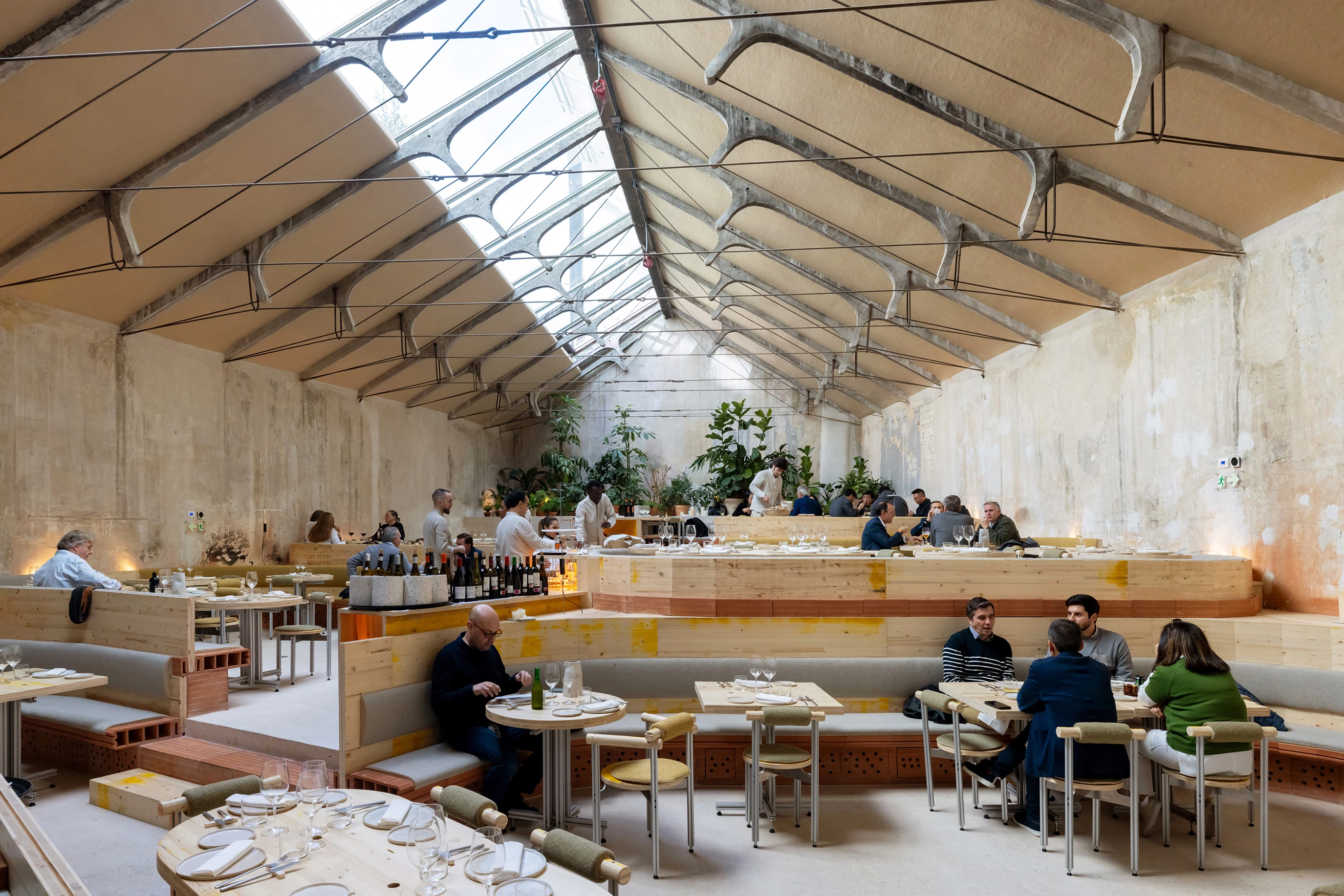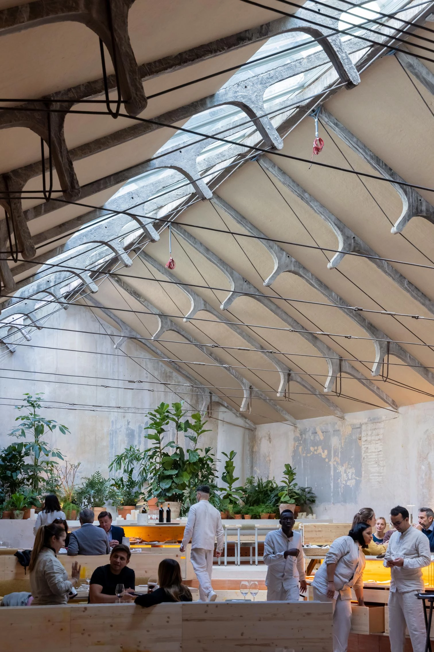 The architecture firm led by José Selgas and Lucía Cano, in collaboration with the designer Andreu Carulla, has transformed an industrial space built in the early 1950s into a restaurant. The building previously harbored a repairs garage and the bar named Garaje Hermético, an icon of Madrid nightlife. The refurbished construction preserves the simplicity and beauty of the roof structure of thin concrete trusses and steel cables.