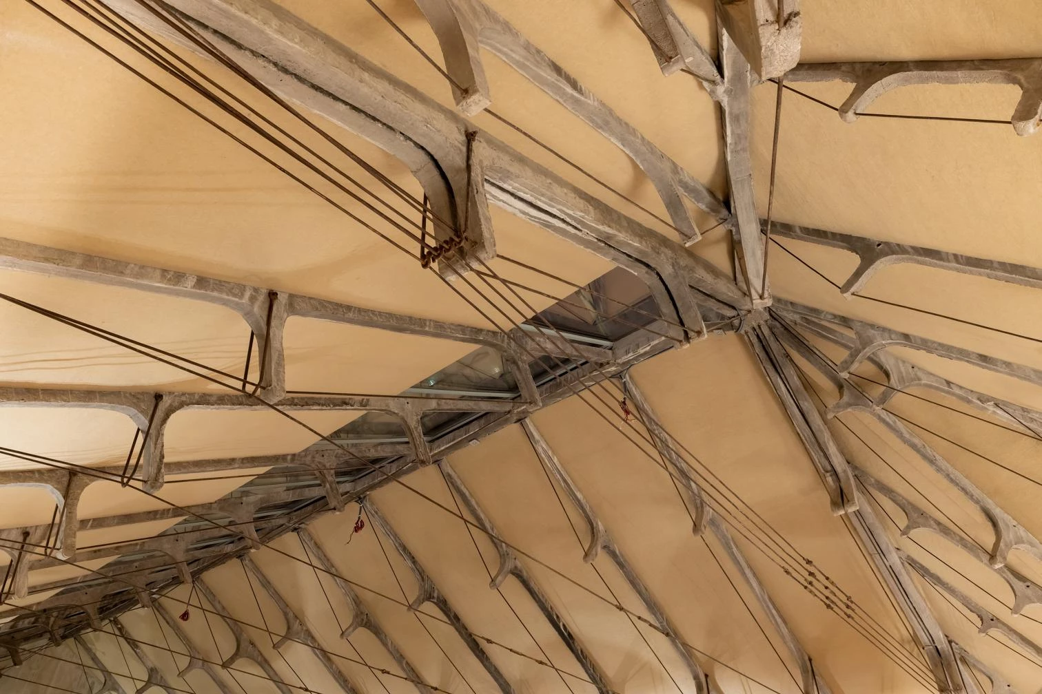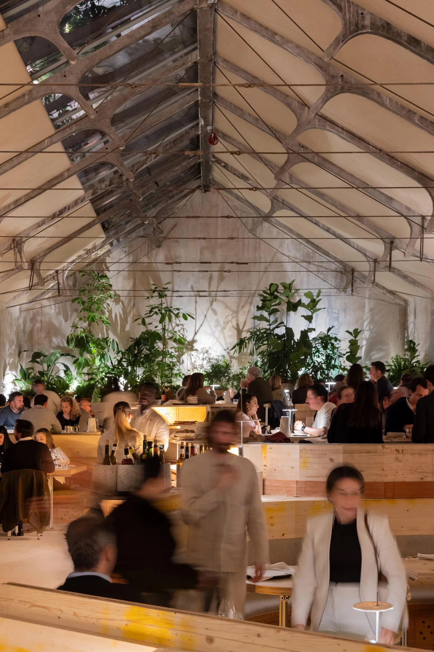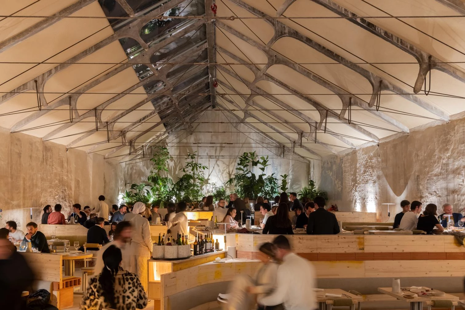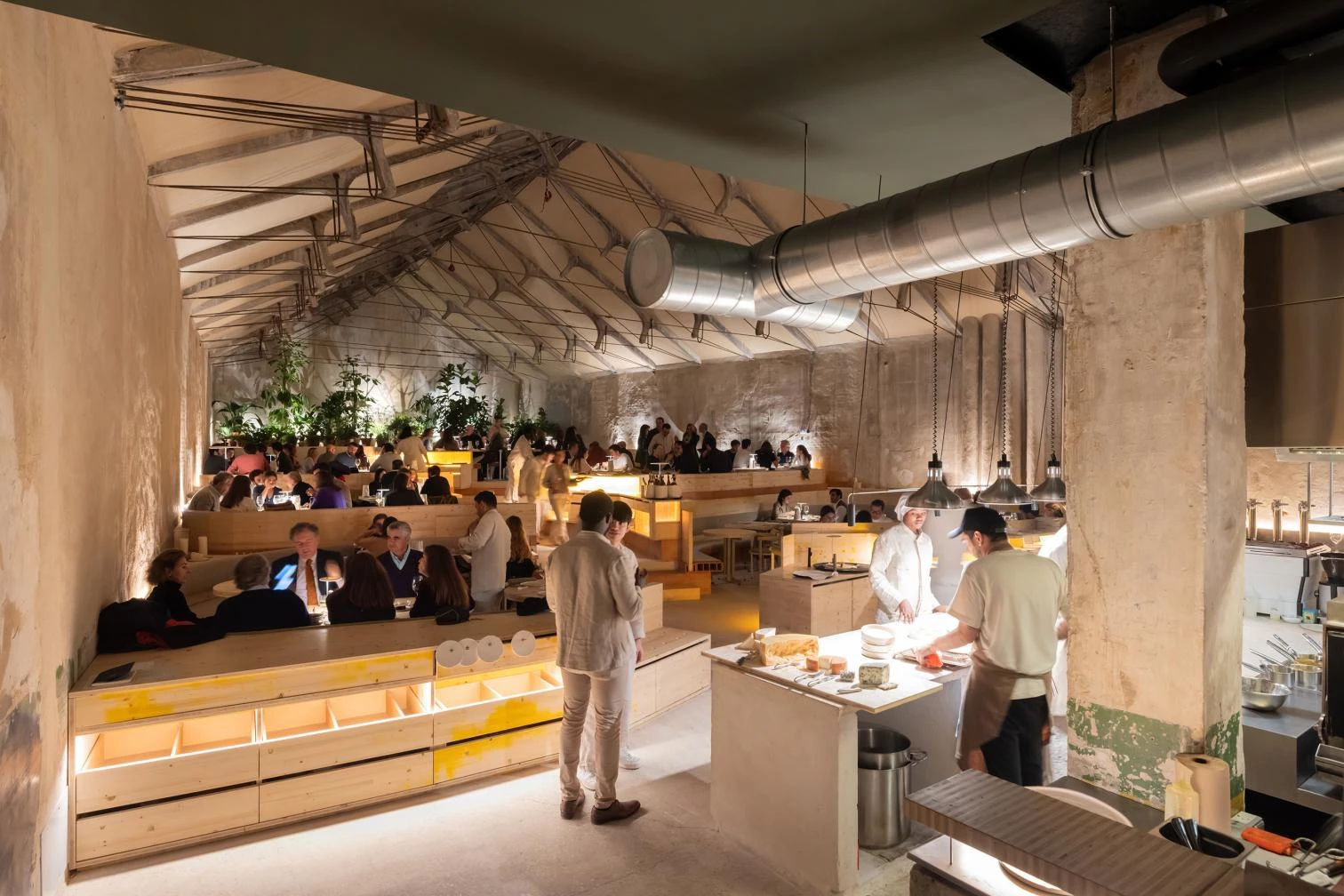 The architecture firm led by José Selgas and Lucía Cano, in collaboration with the designer Andreu Carulla, has transformed an industrial space built in the early 1950s into a restaurant. The building previously harbored a repairs garage and the bar named Garaje Hermético, an icon of Madrid nightlife. The refurbished construction preserves the simplicity and beauty of the roof structure of thin concrete trusses and steel cables.