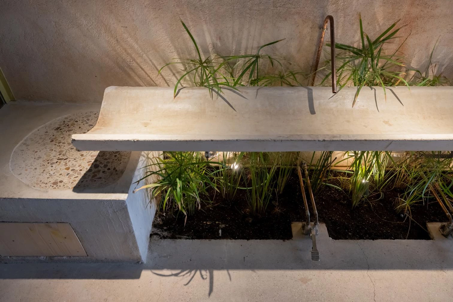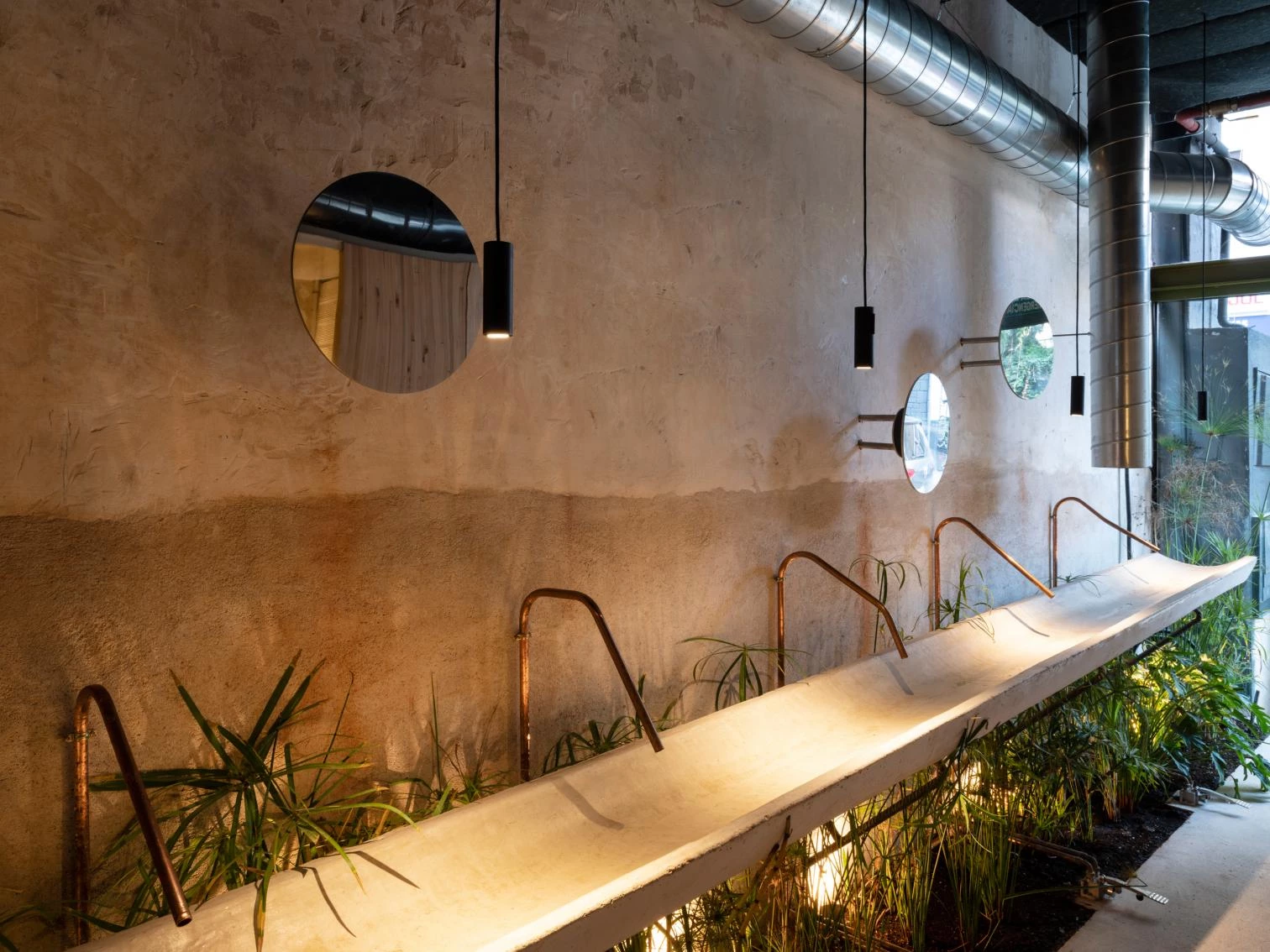 The restaurant thus had to be climatized from under the continuous benches, which themselves form the ceramic pipes, letting air exit through irregular openings beneath the diners. The more than 1,000 ceramic pieces crafted and molded by extrusion contains a natural heating and cooling system that thermally channels air coming from outside.