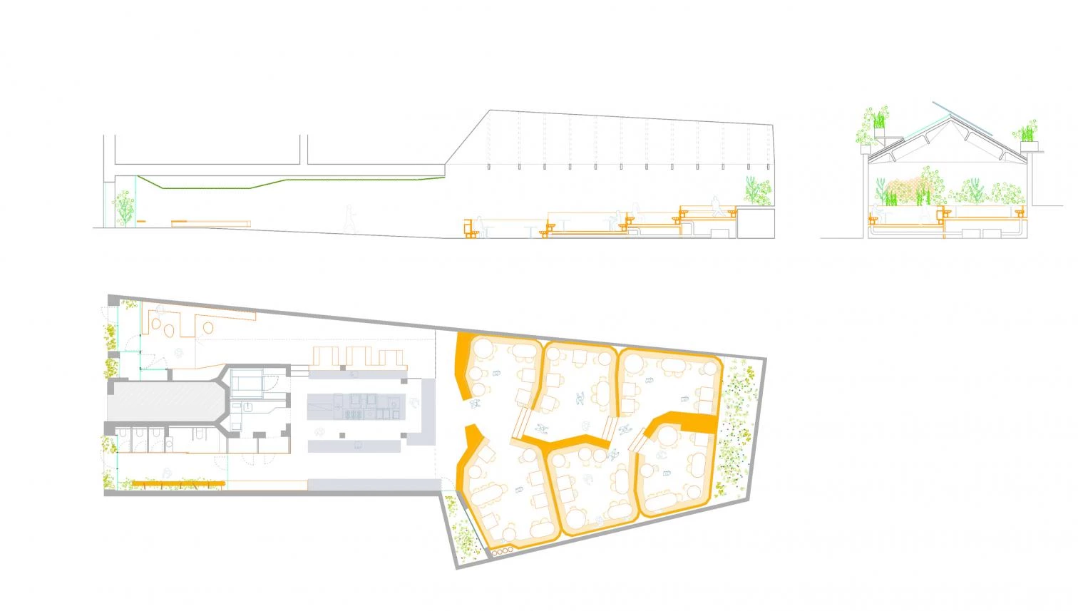 The project’s impact on the environment was much and constantly kept in mind. All efforts were made to control the origin of every material, reuse as much as possible, and eliminate toxic elements (such as polyurethane foam, rockwool, acrylic paints and varnishes, silicone putties…). Acoustic comfort was achieved through Geopannel panels made of recycled and pressed wool. A system for reusing water was also incorporated. The restaurant is almost 100% self-sufficient energy-wise.