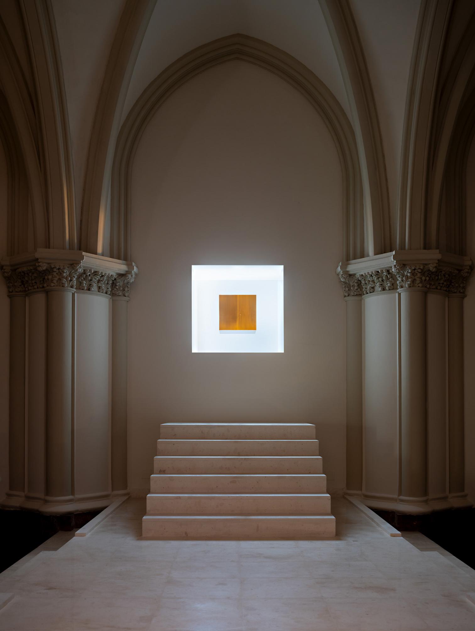 The assignment was to create an altarpiece for a recently restored Madrid basilica. It was decided that the centerpiece would be the Tabernacle, in the presence of Jesus in the Sacrament, and that it would be suspended in a cloud of light – expressing Lumen de lumine, Light from Light, as the Nicene Creed refers to God.
