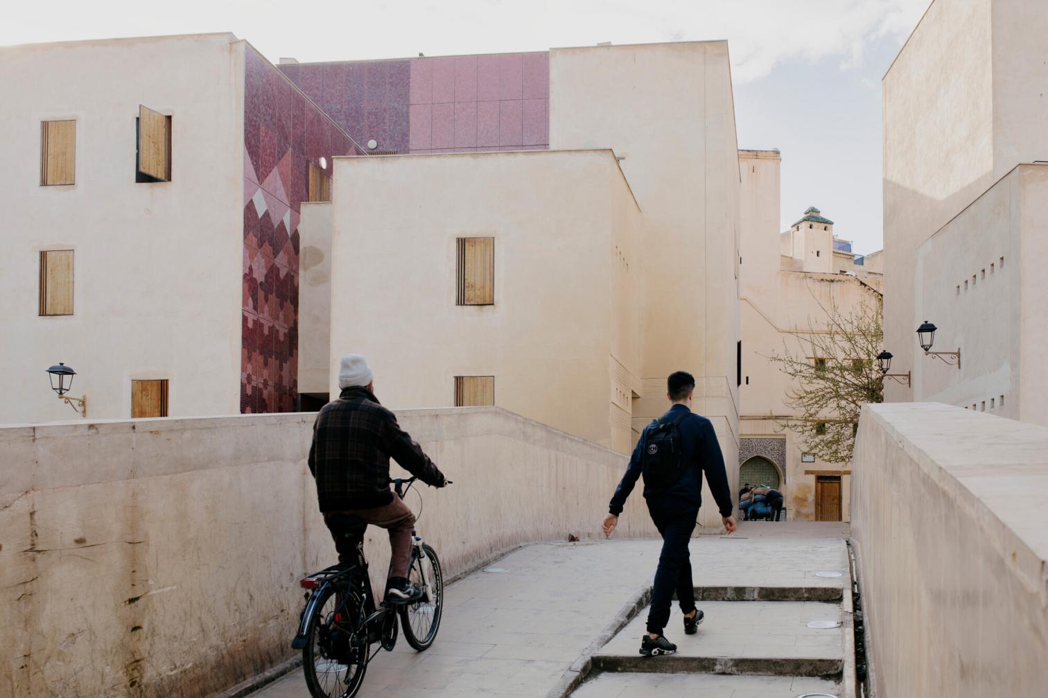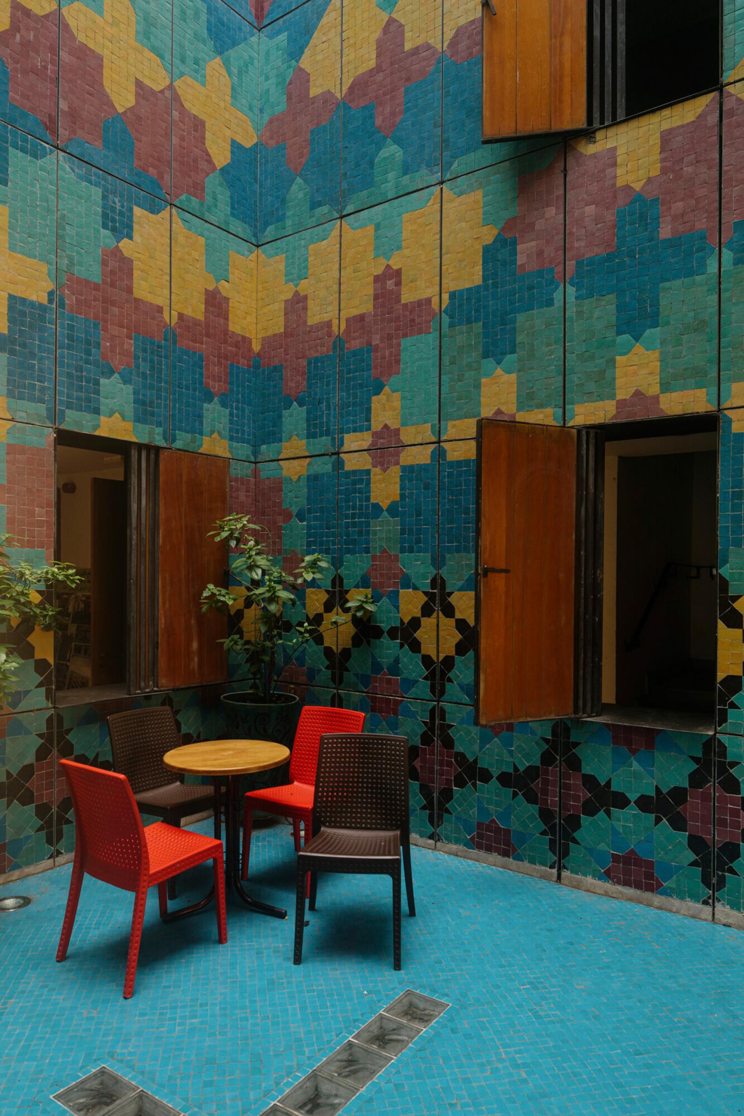 Also distinctive is the use of ceramic tiles. In collaboration with local artisans the British artist Michael Pinsky designed a signage system based on the evolution of Fez’s art of zellige, an ancestral way of making decorative mosaics with tiles of glazed terracotta, hand-chiseled and hand-polished to create geometrical patterns. In this new project, the tiles – manufactured locally – range from traditional Moroccan patterns to contemporary abstract shapes, and serve as visual markers to visitors making their way through the premises.