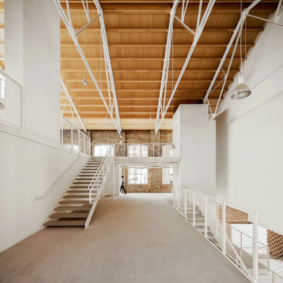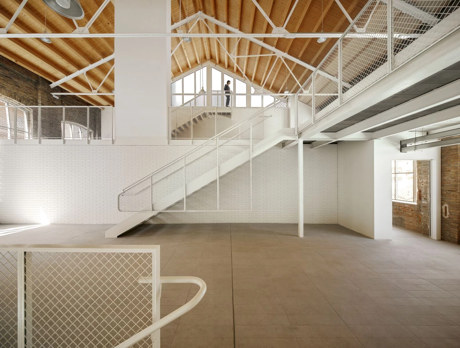 The first decision was to stress the length of the warehouse: the access is placed at the center, creating an interior square from which the stairs depart in a double ascending diagonal, connecting the whole building physically and visually.
