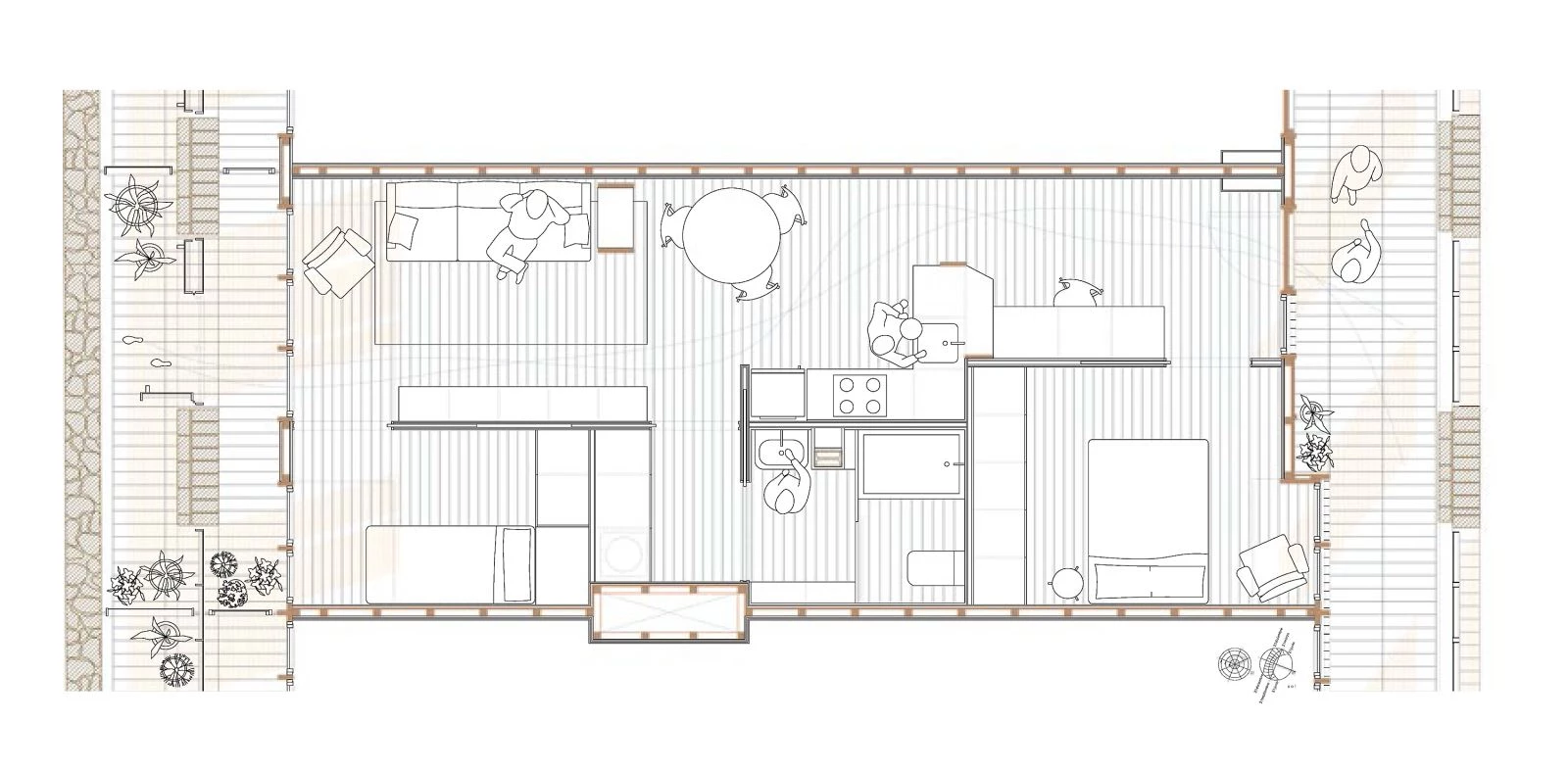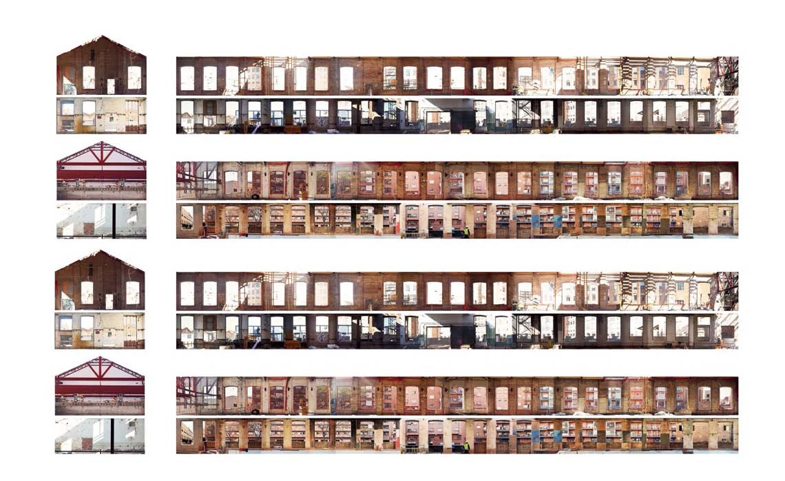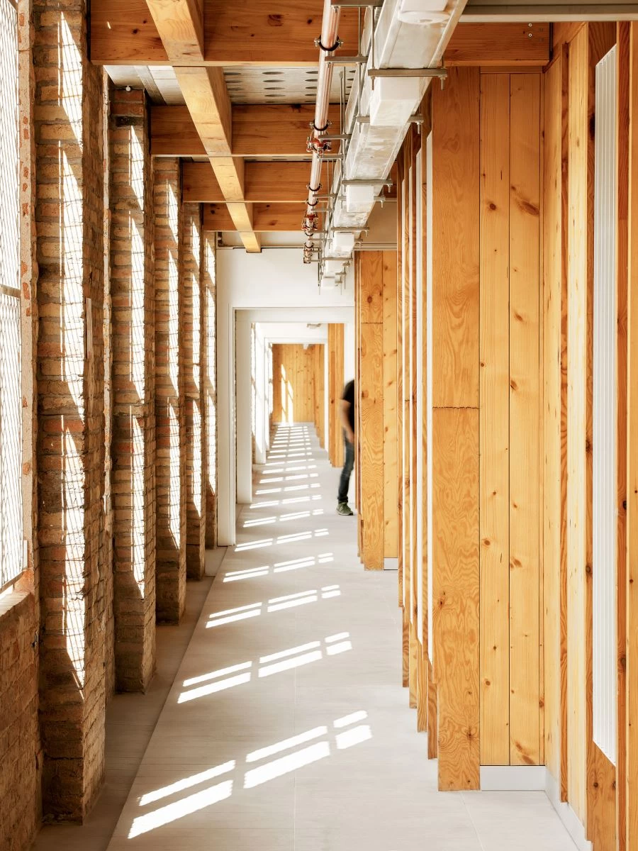 The existing warehouse functions as thermal insulation for the housing units, which are separated from the original facades and roof and have their own wood facade. An intermediate space lets air circulate so that the dwellings do not need air conditioning most of the year. In this intermediate space are the interior paths of access to the dwellings, preserving the old itinerary of the thread rolls with the crane bridges and the conveyor belts.